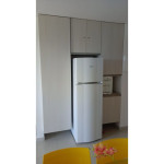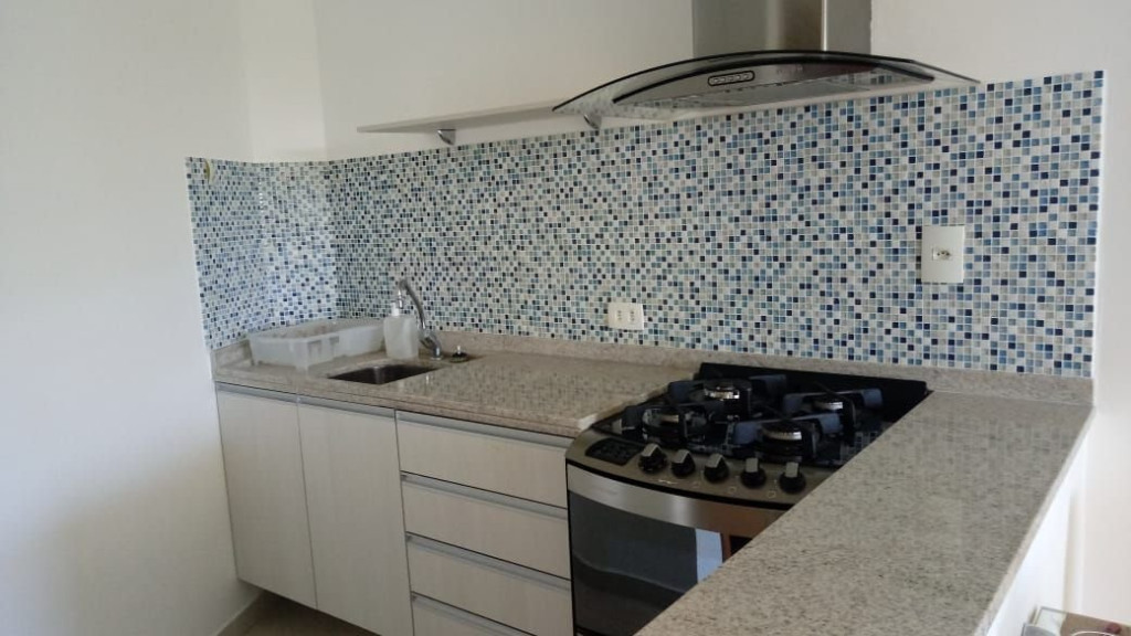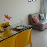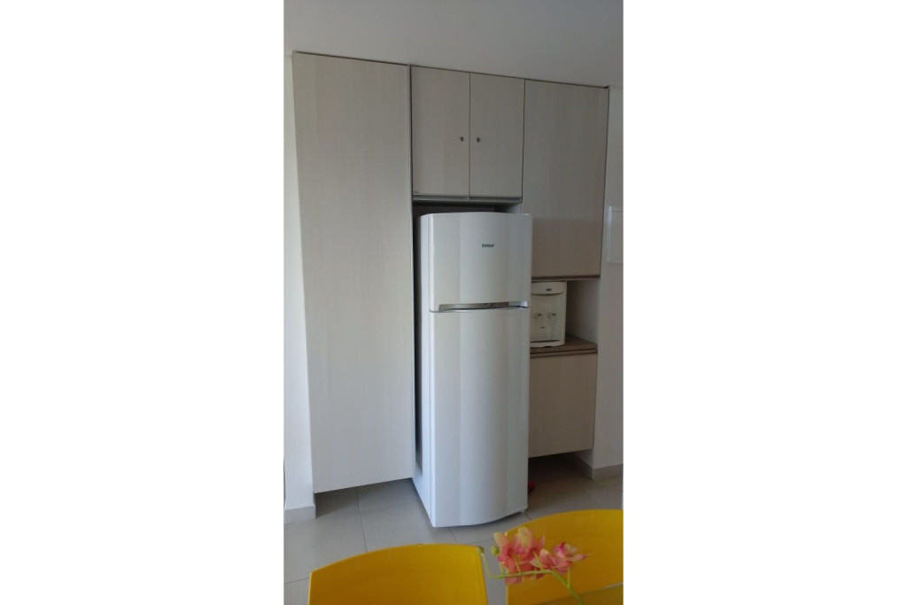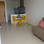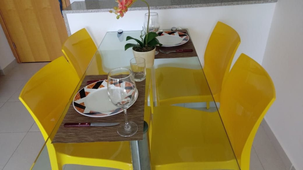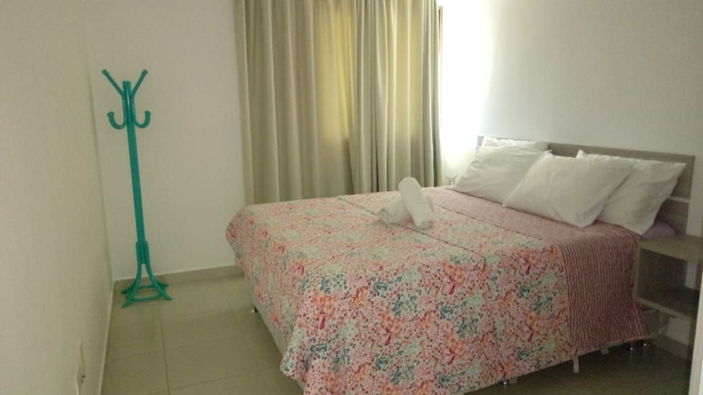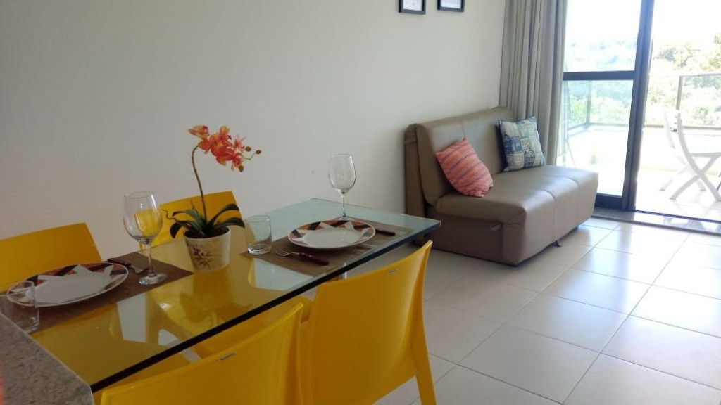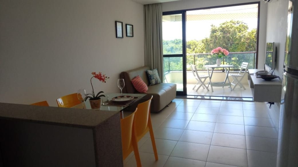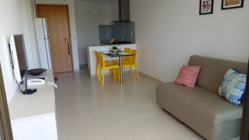 A sala de estar com decoração aconchegante conta com uma TV, sofá cama de casal e ar-condicionado. A cozinha é completa e possui ítens como louça, copos, panelas, talheres, sanduicheira, fogão 04 bocas com forno, geladeira e diversos utensílios. Além disso, contém área para refeições com mesa de vidro e 04 cadeiras. O flat possui 01 banheiro completo.