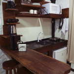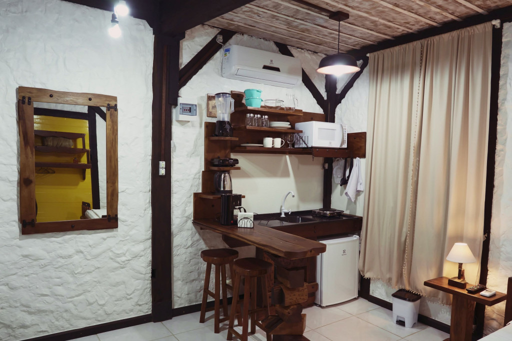 O STUDIO 01, construído com material de demolição, em clássico estilo rústico, forma um aconchegante ambiente de sossego e descanso. O espaço, privado, integrado e completo, conta com cozinha, banheiro, móveis rústicos e decoração em mesmo estilo, proporcionando, assim, uma atmosfera de paz e bem-estar.