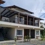 O edifício é composto por 2 blocos de 4 apartamentos cada, situado em um condomínio com outras casas e uma pousada.