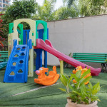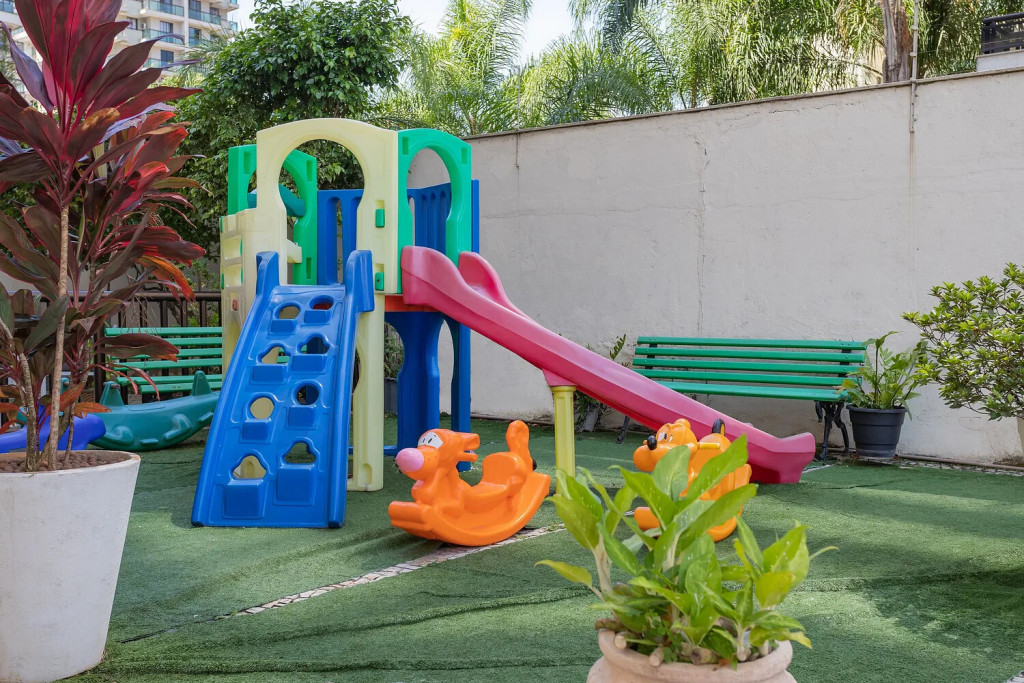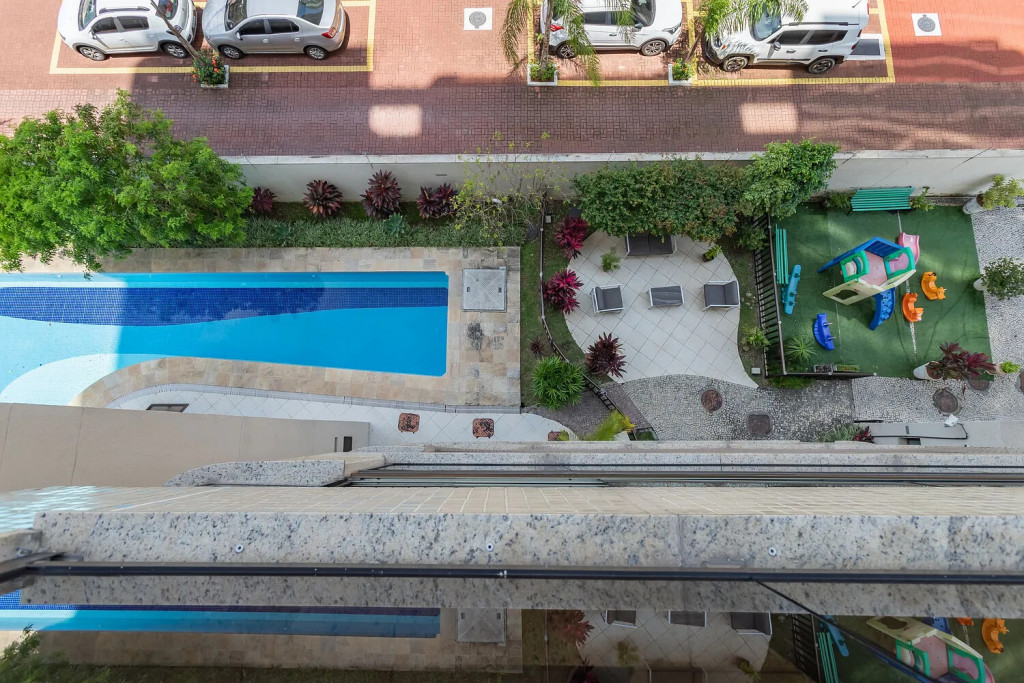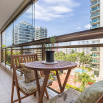 Varanda: Ampla, com cortina de vidro, uma mesa pequena para uso do computador pessoal dos hóspedes ou para pequenas refeições. Não possui tela de proteção, então, os pais devem ficar atentos às crianças.