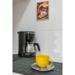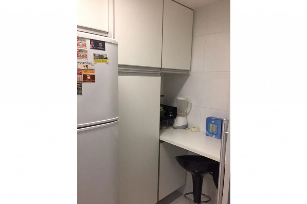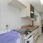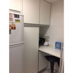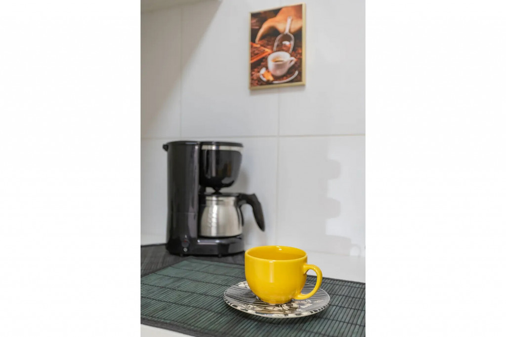 Cozinha: Fogão, geladeira, microondas, máquina de lavar e armários. Cafeteira, sanduicheira, panelas e utensílios de cozinha.