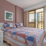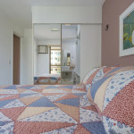 Quarto 1: Suite com uma cama de casal, ar condicionado, persianas, porta com acesso a varanda e amplo closet.