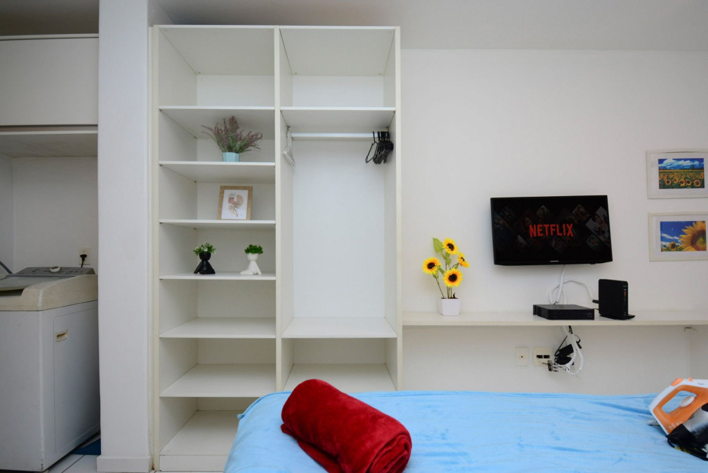 Sua hospedagem possui 1 cama de casal, 1 cama de solteiro, TV a cabo, máquina de lavar, Wi-Fi, além de itens de casa e água quente.