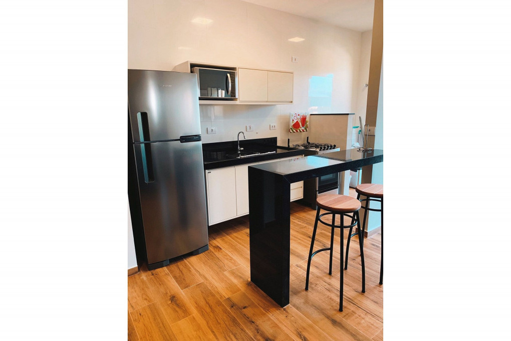 Cozinha totalmente equipada com fogão, geladeira, microondas, liquidificador, sanduicheira;