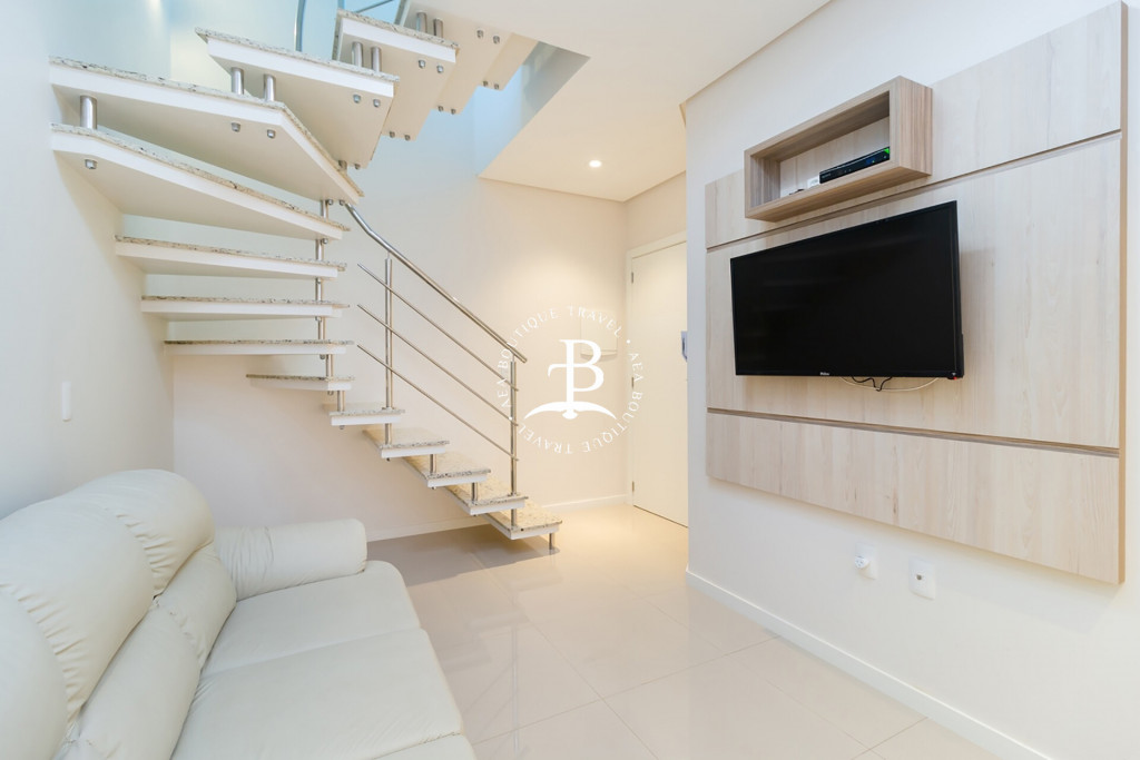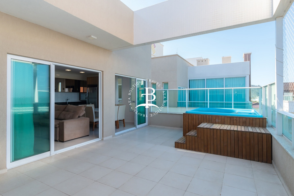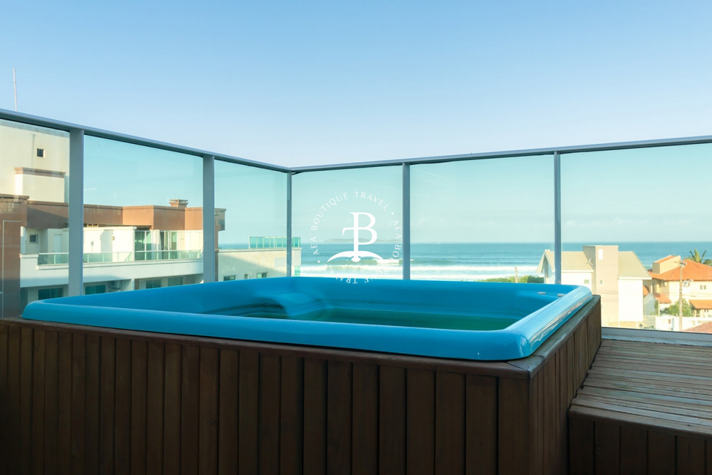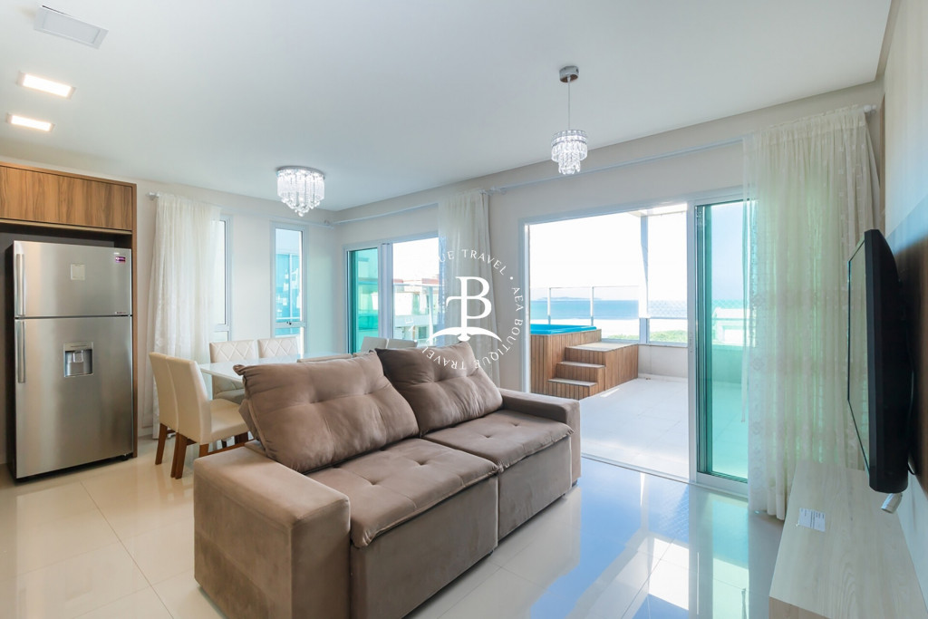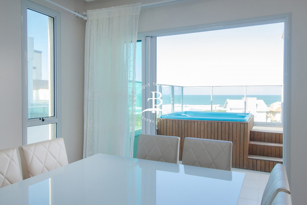 Em seu terraço desfrute ao máximo de um Spa | Jacúzzi privativo com churrasqueira, a passos do mar! este apartamento possui vista para o mar, todo completo e com toda privacidade que você procura para férias de verdade com sua família e amigos. Sua sala de estar com sofá aconchegante e TV ‘, integrada a sala de jantar e cozinha completa, dispõe de 1 lavabo e máquina de lavar roupas.