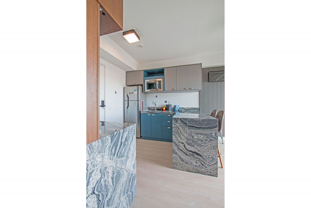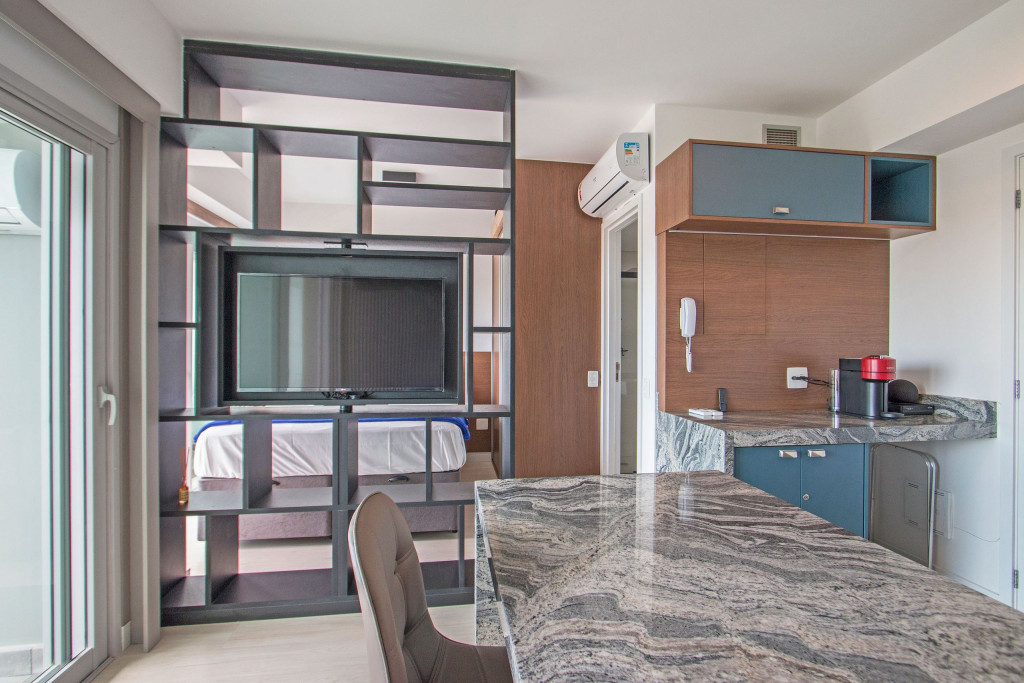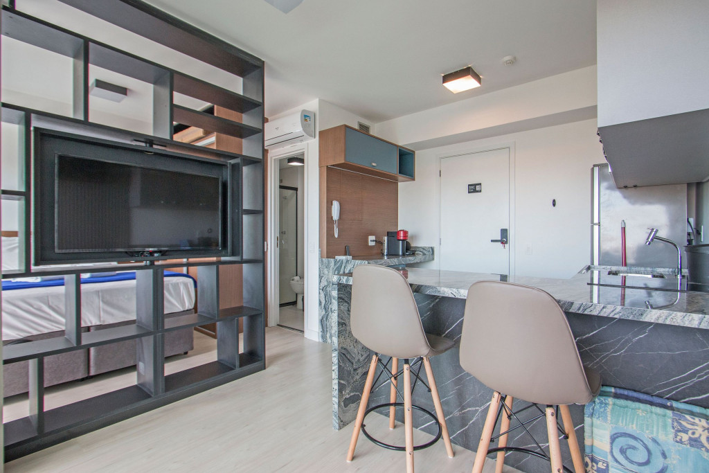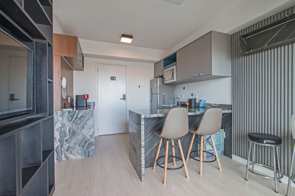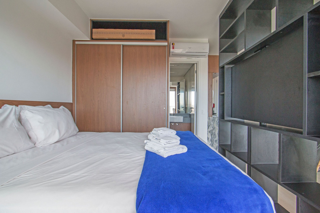 Nesse apartamento, você contará com: cama de casal; cortina black-out; cozinha compacta equipada com cooktop, geladeira, microondas, sanduicheira, cafeteira Nespresso (As cápsulas não estão inclusas) e utensílios básicos; TV; ar condicionado; WI-FI; secador de cabelo; enxoval completo (Obs.: não há troca de enxoval, porém a mesma pode ser solicitada mediante um custo adicional).