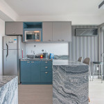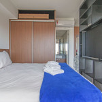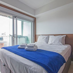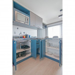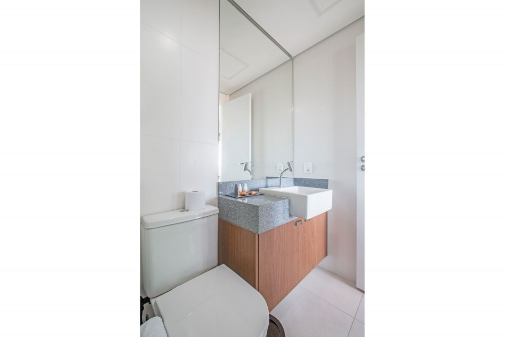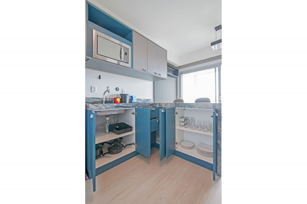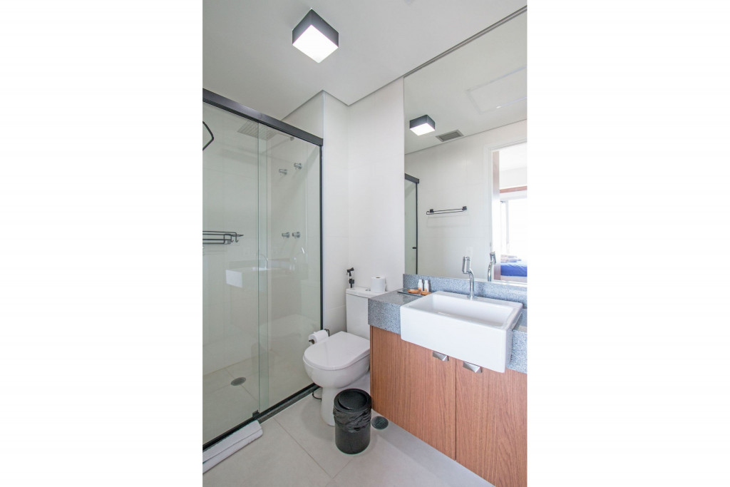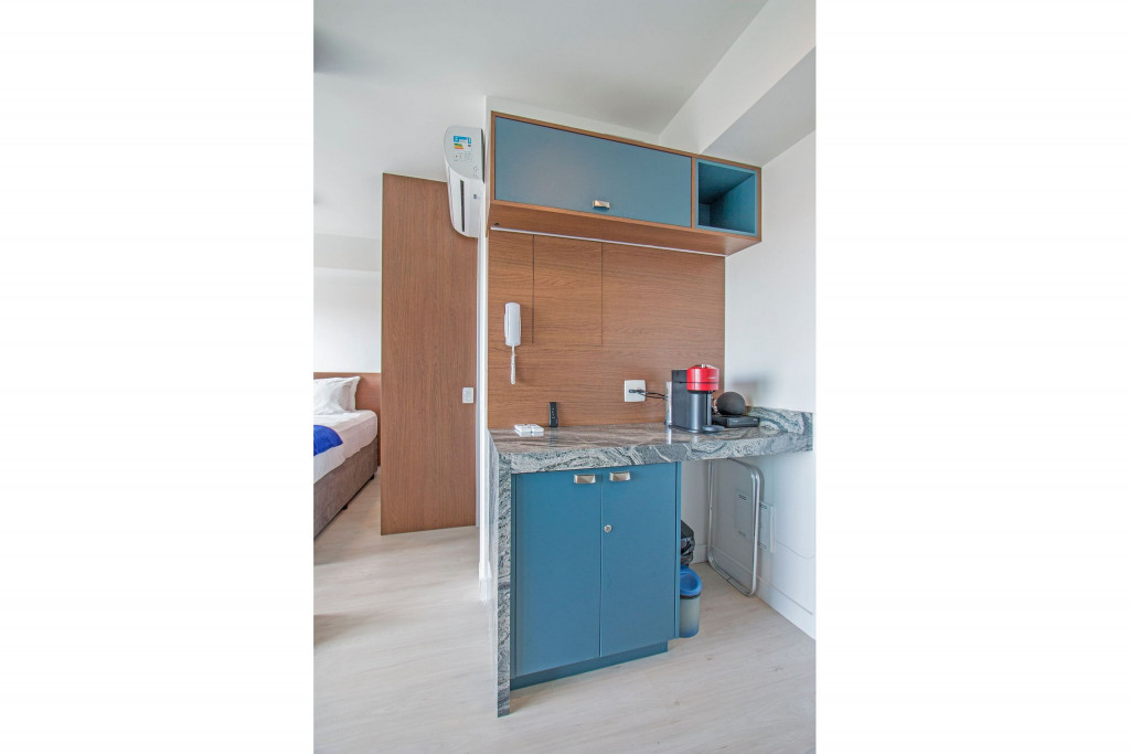 Nesse apartamento, você contará com: cama de casal; cortina black-out; cozinha compacta equipada com cooktop, geladeira, microondas, sanduicheira, cafeteira Nespresso (As cápsulas não estão inclusas) e utensílios básicos; TV; ar condicionado; WI-FI; secador de cabelo; enxoval completo (Obs.: não há troca de enxoval, porém a mesma pode ser solicitada mediante um custo adicional).