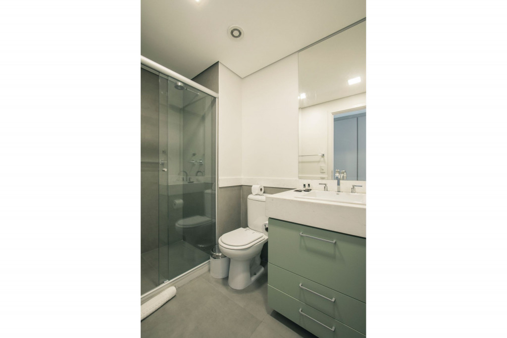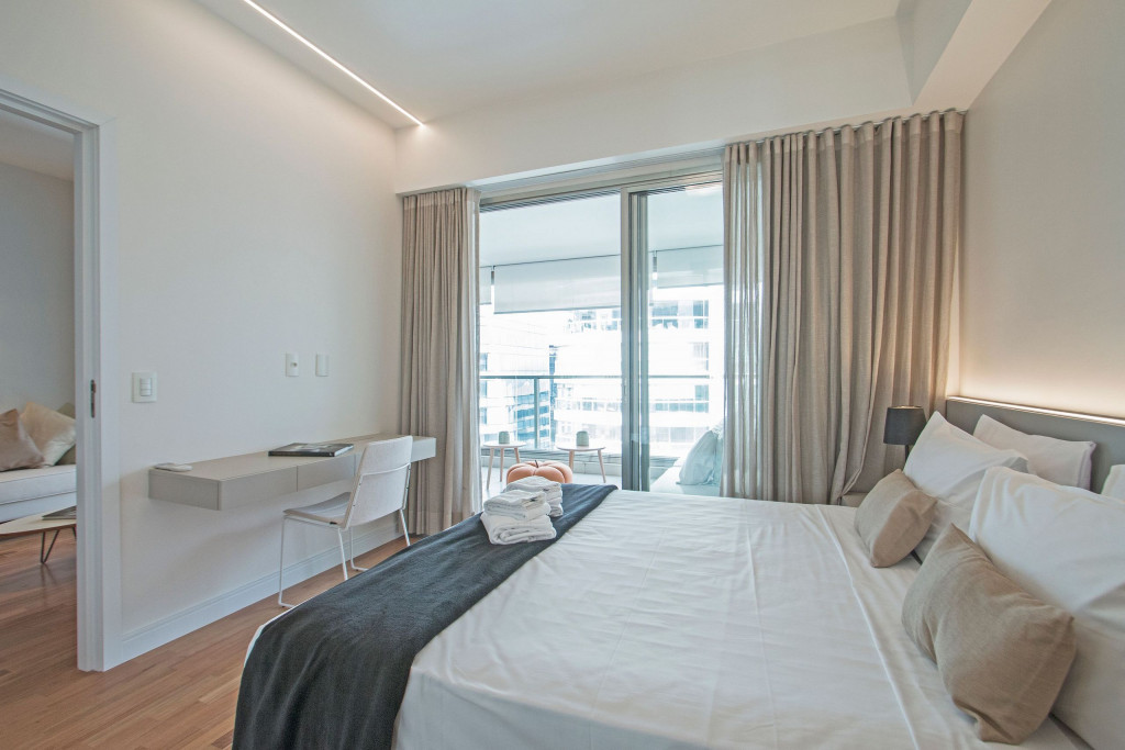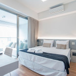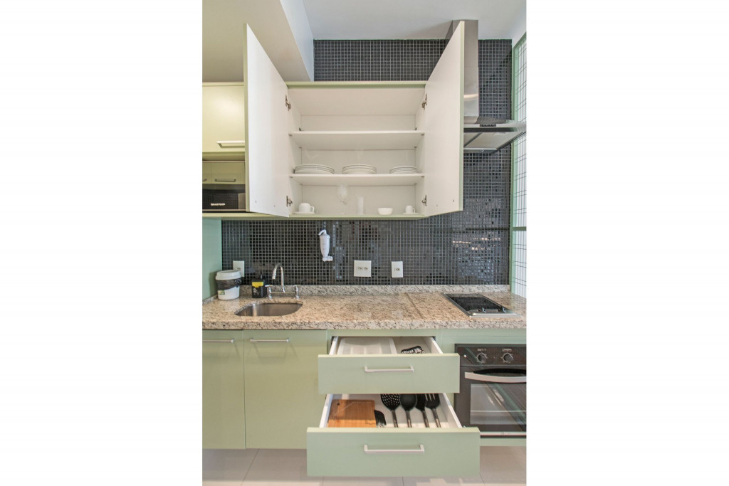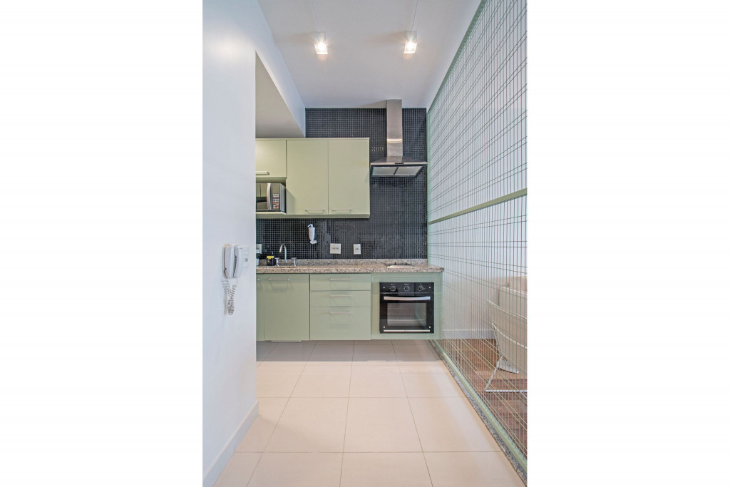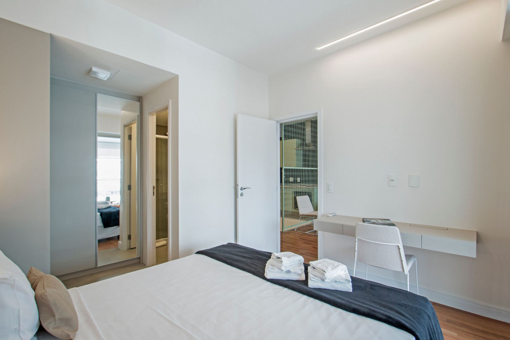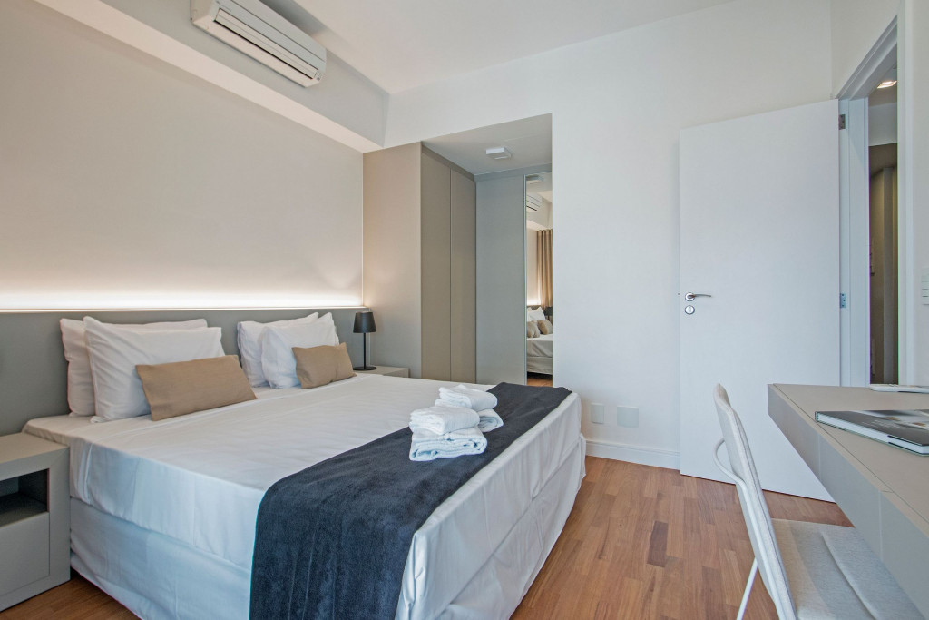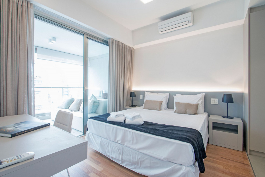 Nesse apartamento, você contará com: cama queen; sofá; cortina blackout; ar condicionado; TV; varanda; geladeira; forno; cooktop; microondas; cafeteira (abastecimento a pó); Enxoval completo (4 travesseiros, 1 manta, 1 cobertor, 1 jogo de lençol, 2 toalhas de banho, 2 toalhas de rosto e 1 toalha de piso) - Obs.: Não há troca de enxoval, porém a mesma pode ser solicitada mediante um custo adicional;