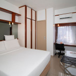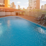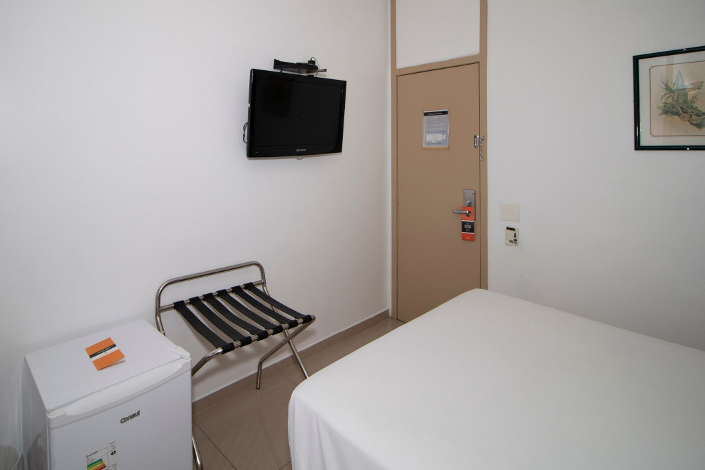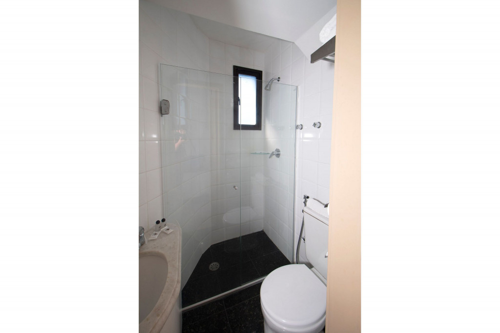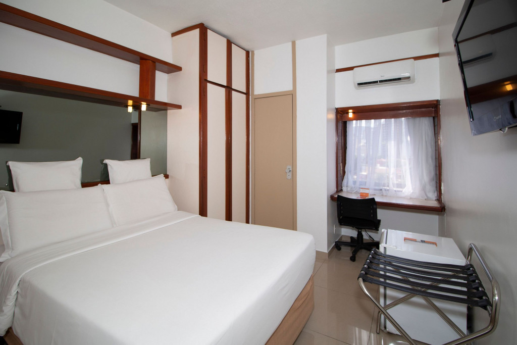 Nesse apartamento, você contará com: cama de casal; ar condicionado; telefone; frigobar; secador de cabelo; TV a cabo; WI-FI; cofre; vedação acústica nas janelas.