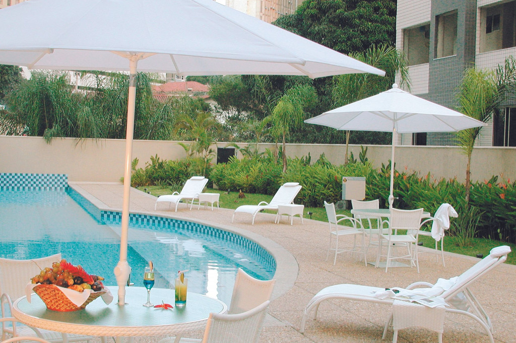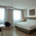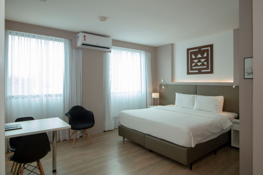 Nesse apartamento, você contará com: cama king size; ar condicionado; TV a cabo; WI-FI; frigobar; secador de cabelo; telefone; cofre; mesa de trabalho; Janelas com vedação acústica.