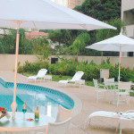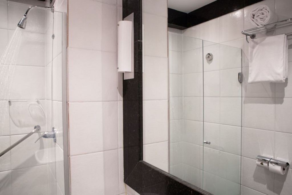 Nesse apartamento, você contará com: cama king size; ar condicionado; TV a cabo; WI-FI; frigobar; secador de cabelo; telefone; cofre; mesa de trabalho; janelas com vedação acústica.