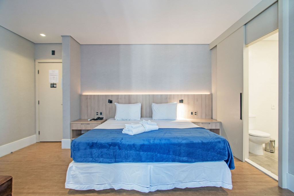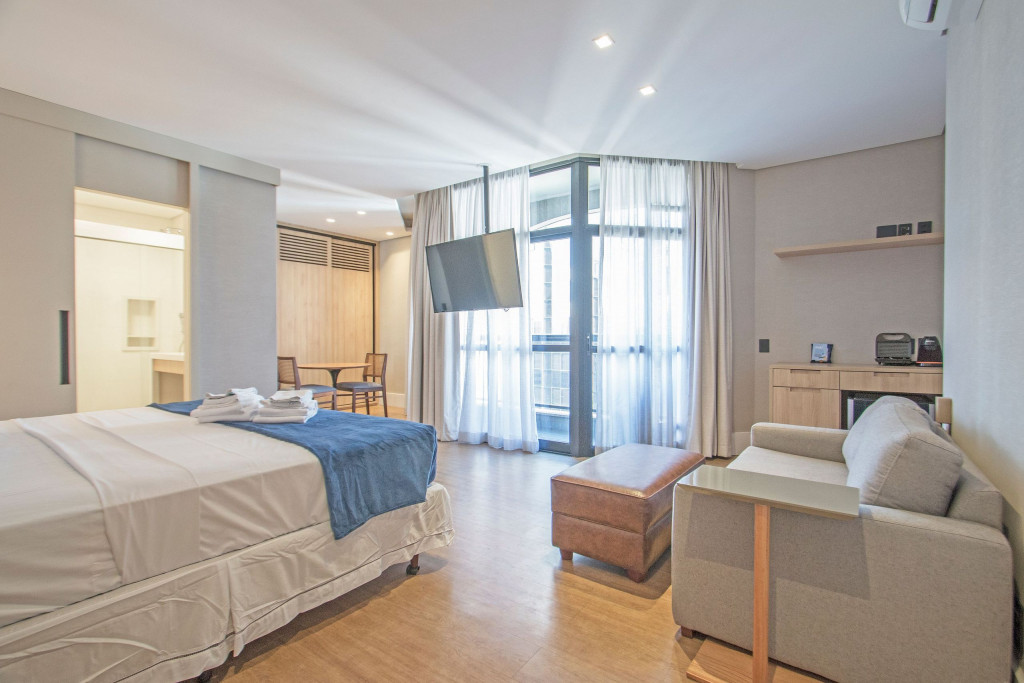 Nesse apartamento, você contará com: cama de casal; sofá; ar condicionado; TV; varanda; secador de cabelo; ferro de passar roupas; cafeteira de pó; frigobar; sanduicheira; arrumação do quarto; Enxoval completo (4 travesseiros, 1 manta, 1 cobertor, 1 jogo de lençol, 2 toalhas de banho, 2 toalhas de rosto e 1 toalha de piso) - Obs.: Não há troca de enxoval, porém a mesma pode ser solicitada mediante um custo adicional; No caso de 3 hóspedes, é cobrado o enxoval da terceira pessoa à parte.