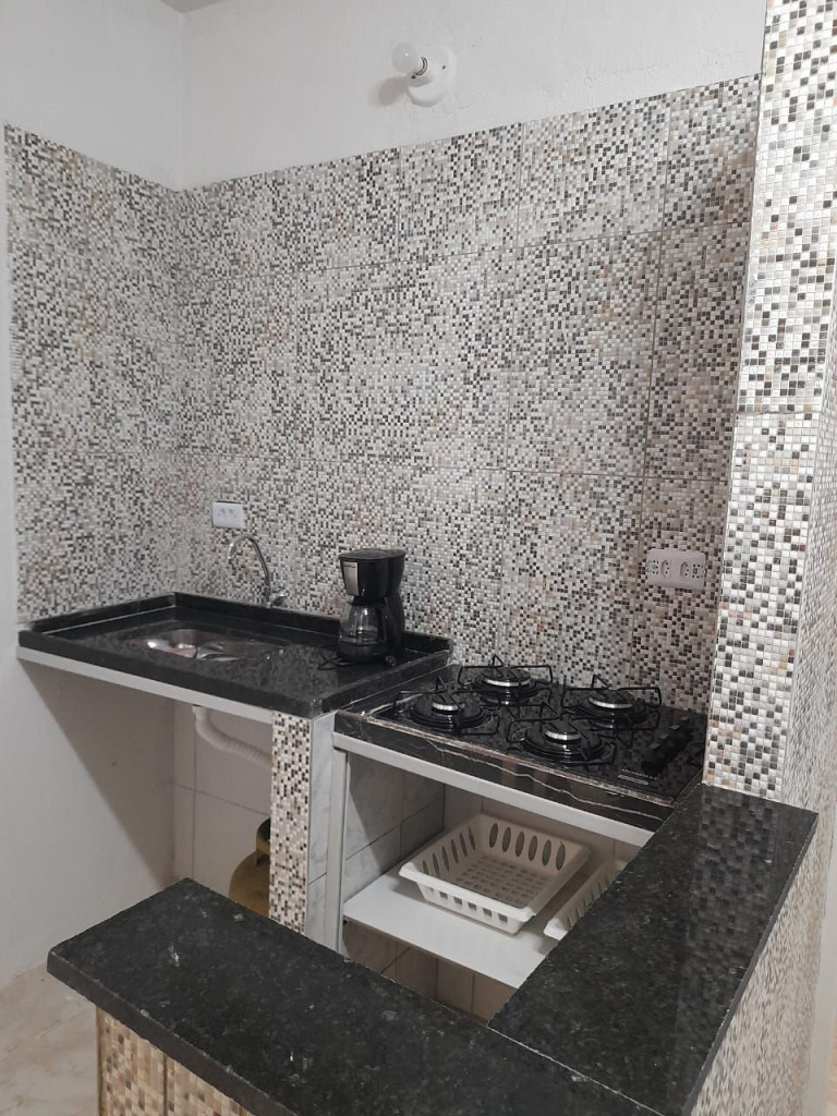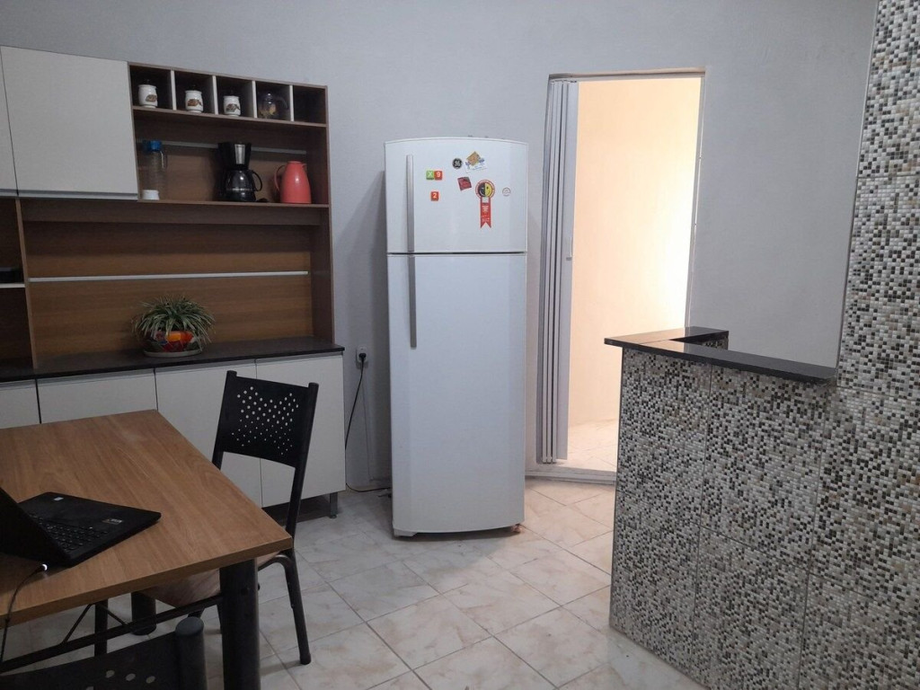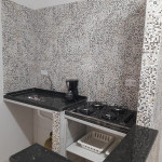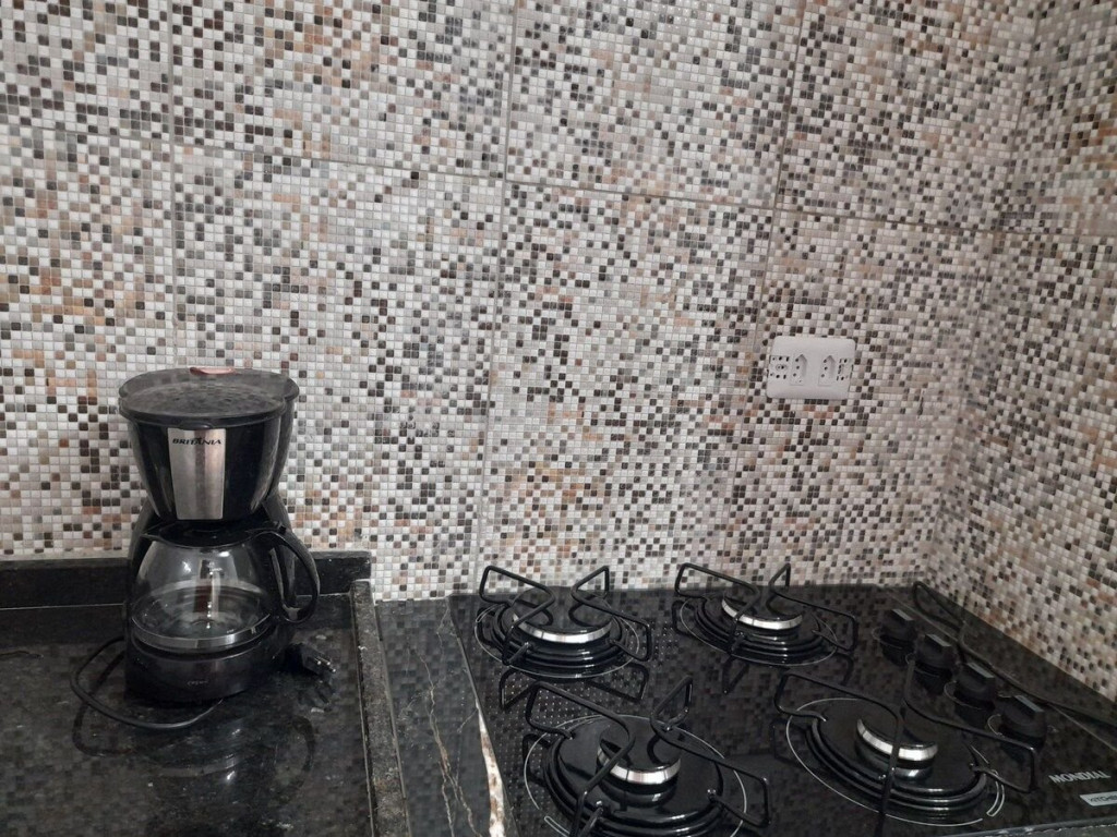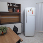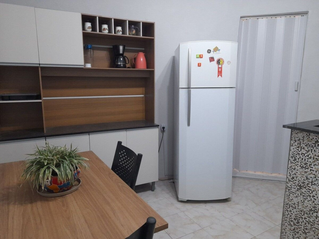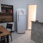 Cozinha americana completa com mesa de jantar, geladeira, fogão cocktop, cafeteira, mini liquidificador, panelas e utensílios para preparar suas refeições;