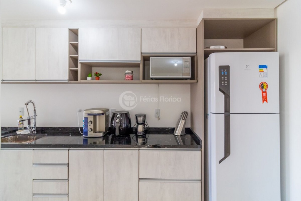 - Utensílios básicos de cozinha: Fogão ; Geladeira; Forno; Micro-ondas; Liquidificador; Filtro de água; Cafeteira; Jogo de Panelas; Louças;