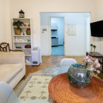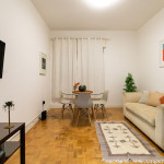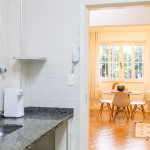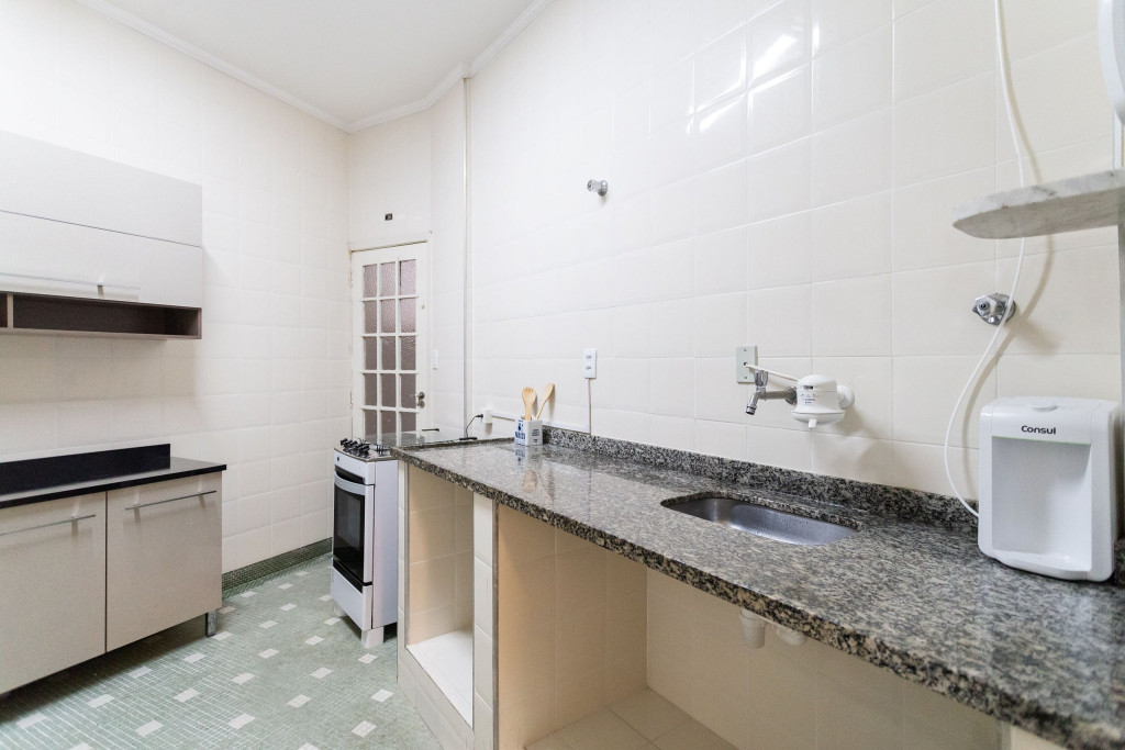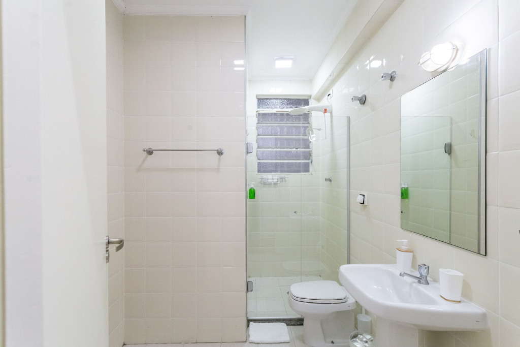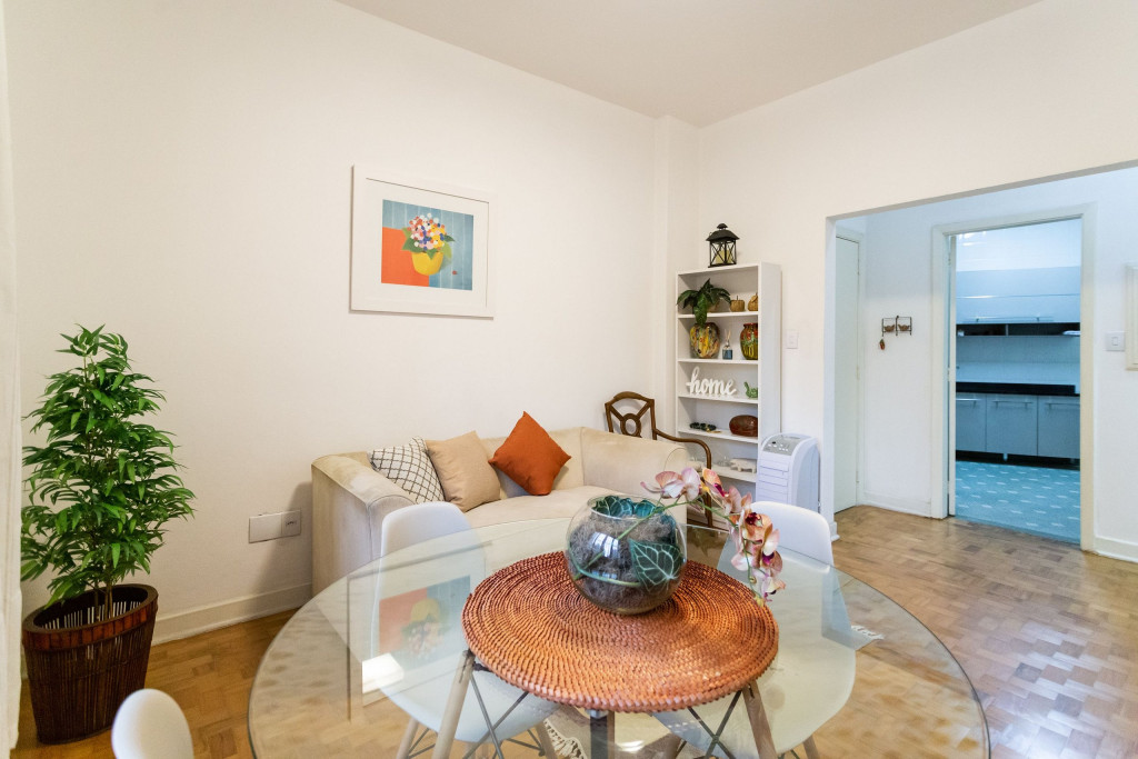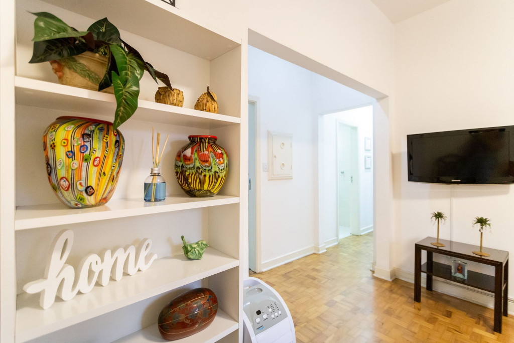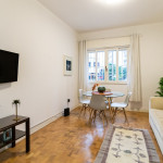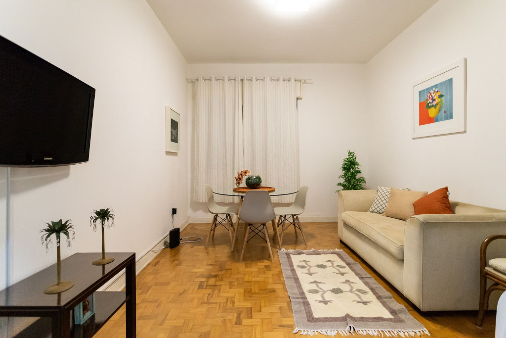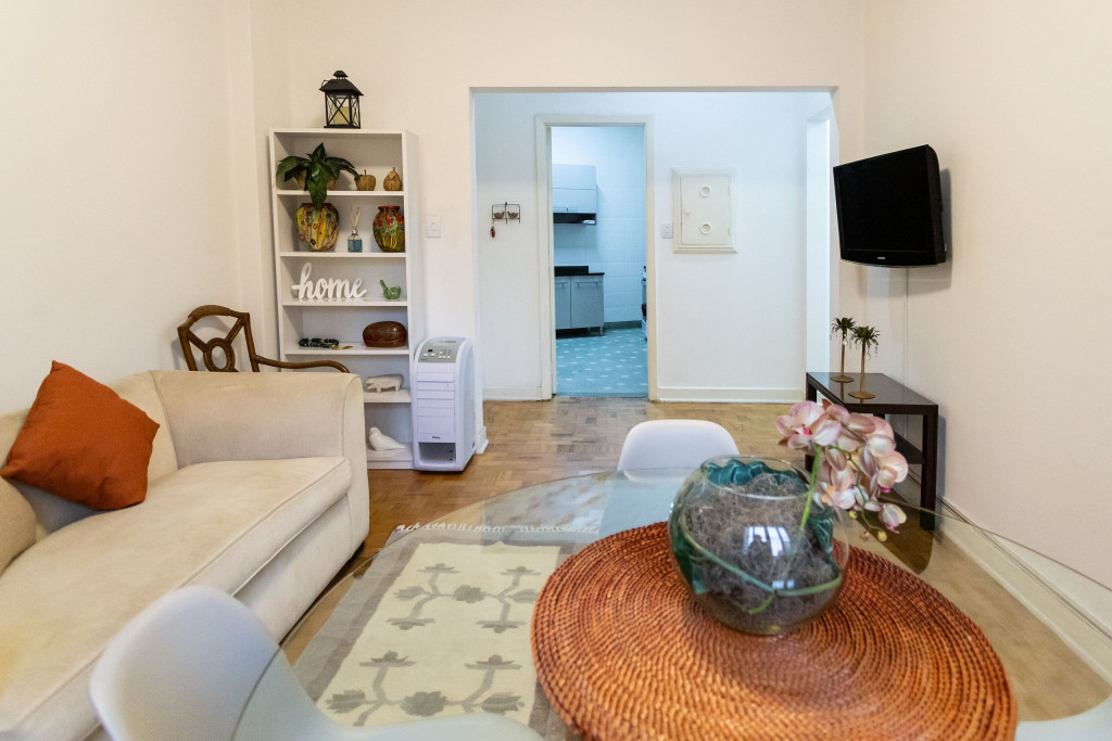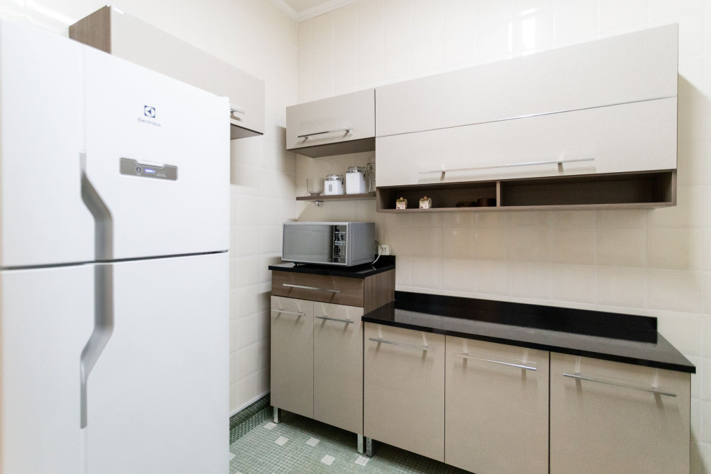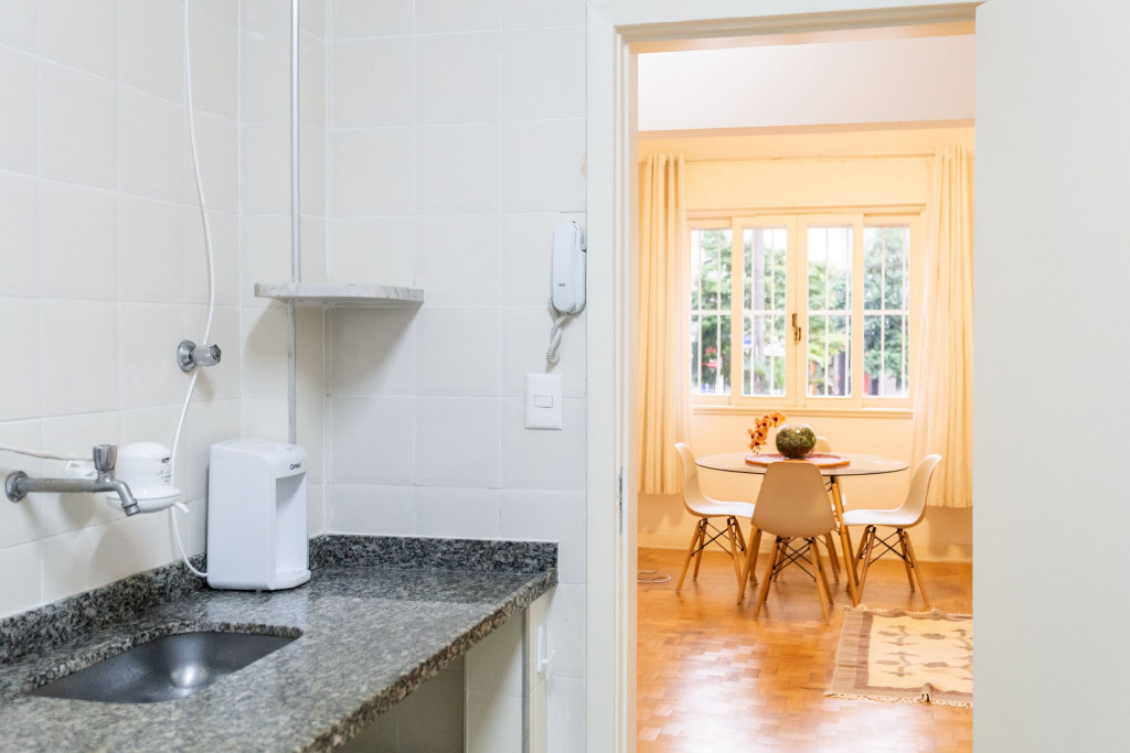 Ao entrar no apartamento, o hóspede terá acesso a uma sala com cortina blackout, TV Smart, sofá, mesa de jantar e aparelho de ar-condicionado portátil. Logo ao lado deste espaço, temos uma cozinha com todos os utensílios necessários para uma estadia prática e uma área de serviço com lavabo.