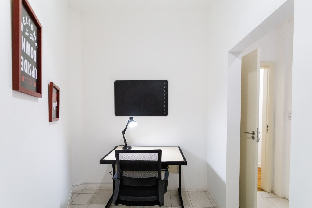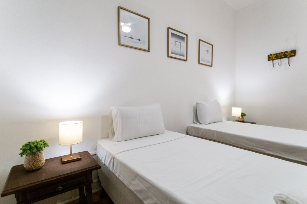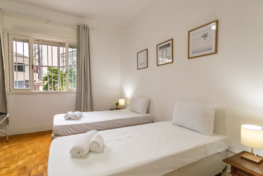 Seguindo pelo corredor, temos os quartos, sendo um com cama queen e outro com duas camas de solteiro, o banheiro em comum e uma sala com escrivaninha para fazer home office. Cada quarto possui um aquecedor elétrico a óleo para maior conforto nos dias frios.