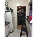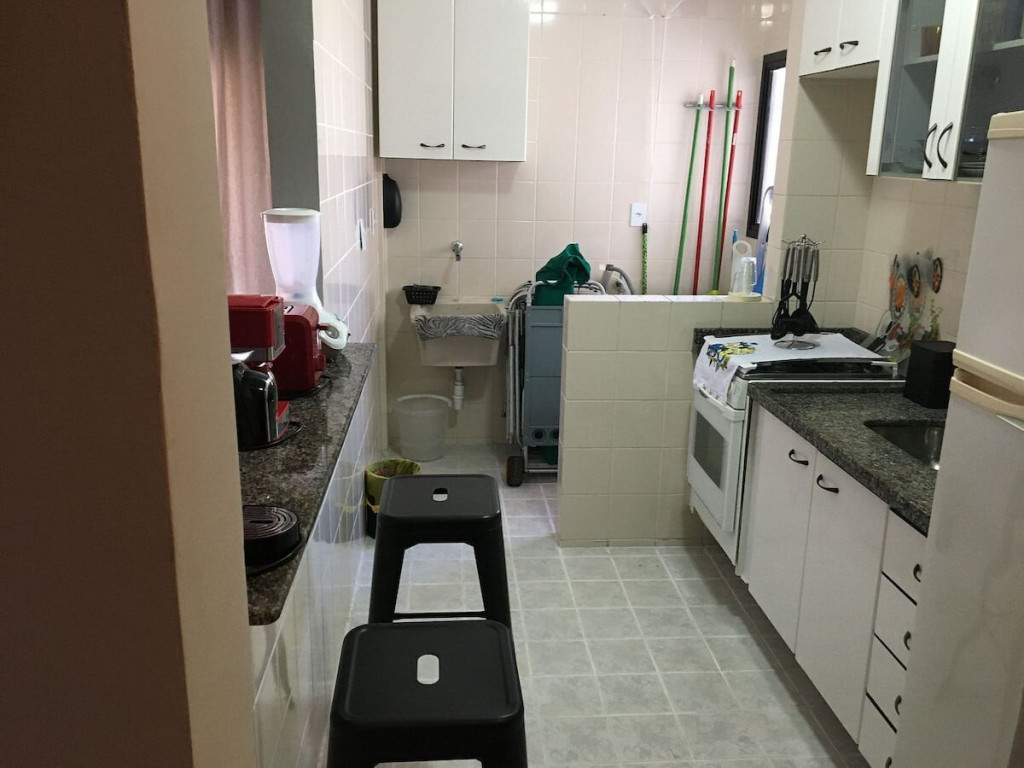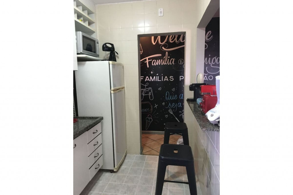 - Cozinha equipada com geladeira, fogão, liquidificador, torradeira, cafeteira, microondas e utensílios de louça.