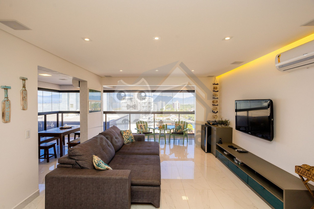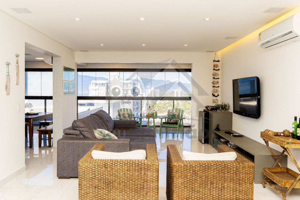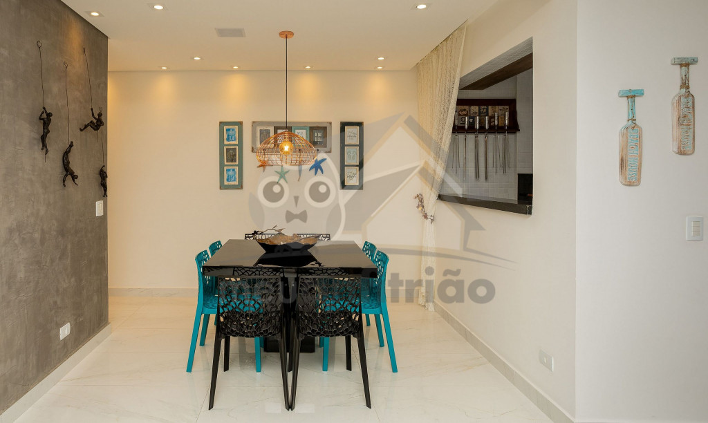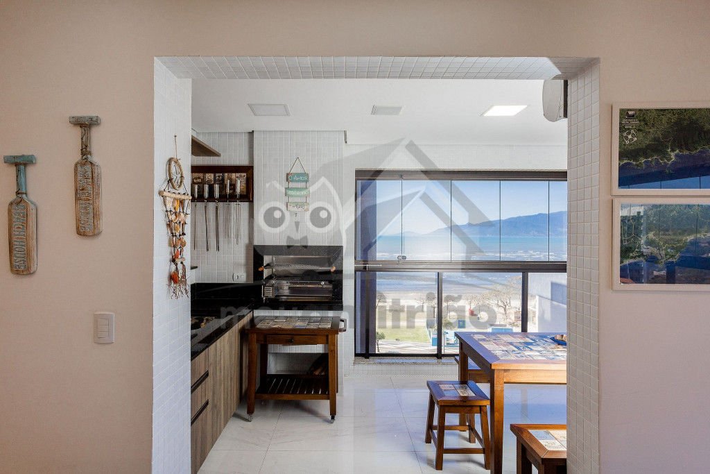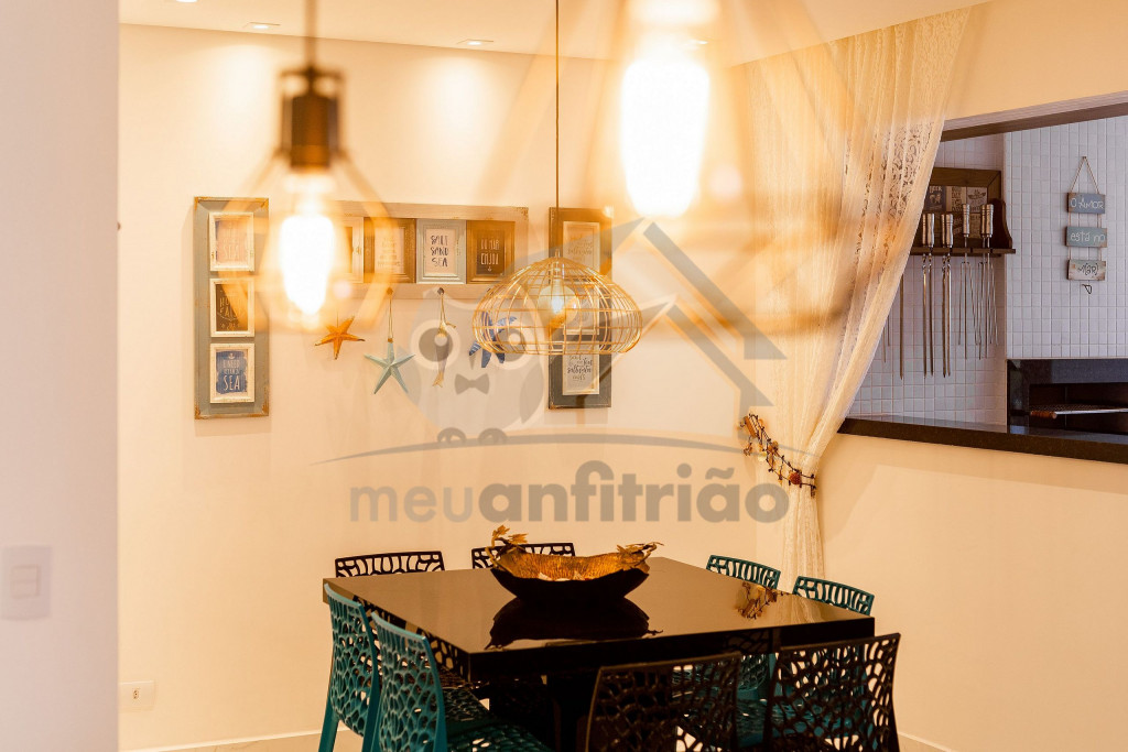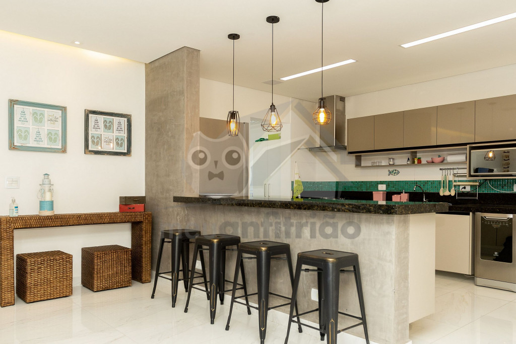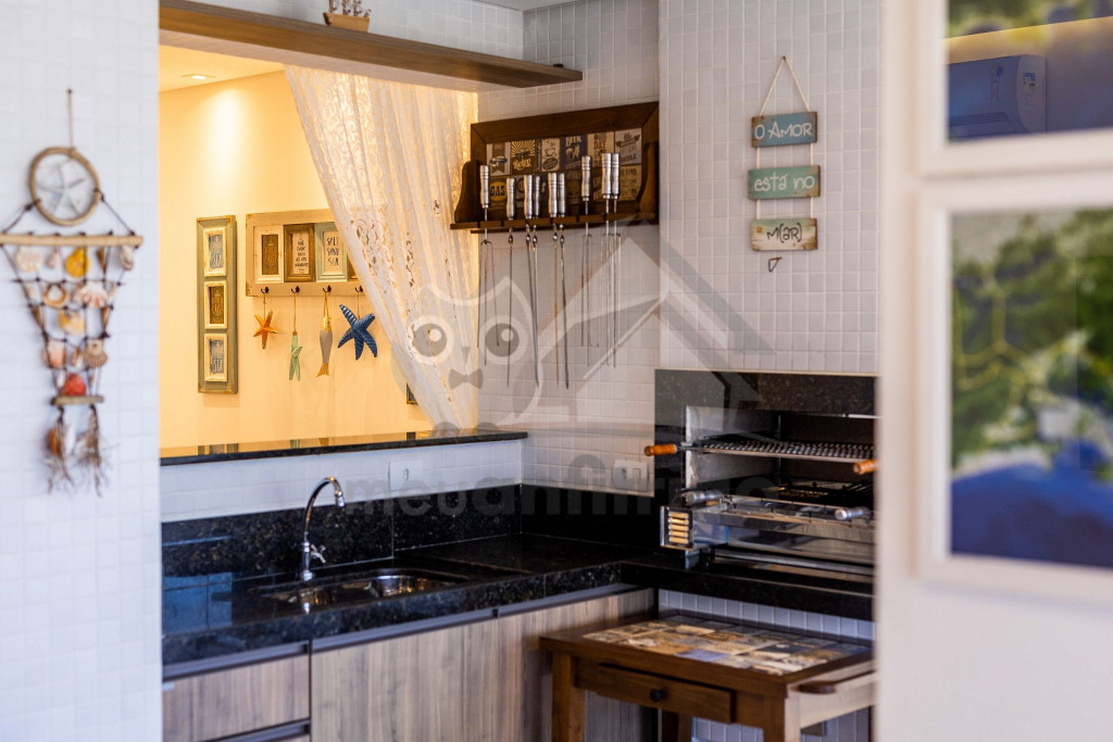 O espaço da sala de TV, sala de jantar, cozinha, varanda e área gourmet é em conceito aberto para maior integração dos ambientes. Possuímos TV na sala, na suíte e nossa internet é fibra de 100mb para quem precisar fazer home office.A cozinha é completa e possui todos os eletrodomésticos e utensílios necessários para a estadia. Contém geladeira, máquina de lavar louça, filtro, micro-ondas e até uma cervejeira.A área gourmet possui churrasqueira com vista para o mar e mesa estilo de piquenique para deixar a estadia ainda mais divertida.Oferecemos 2 vagas de garagem.
