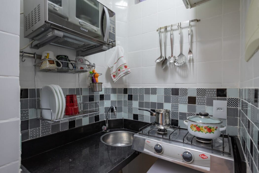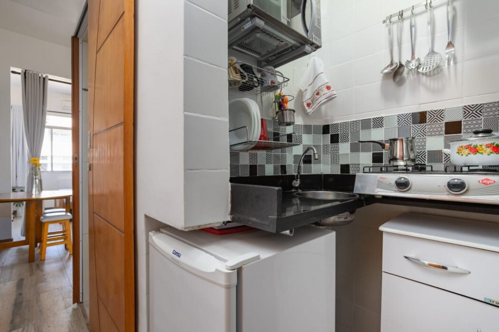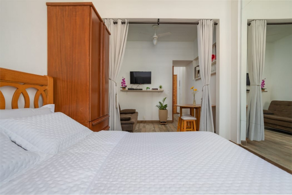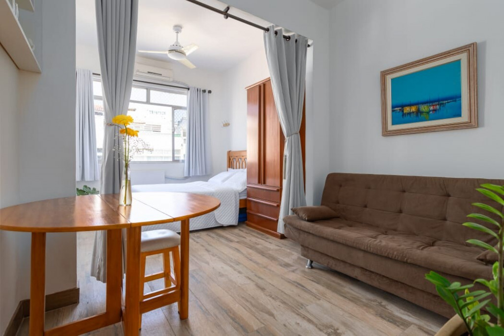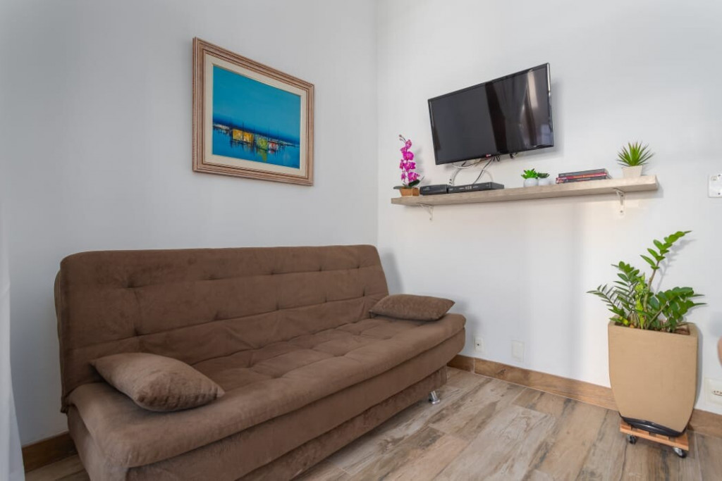 Flat completo com cama de casal, sofá-cama, ar condicionado.