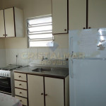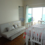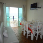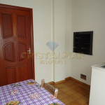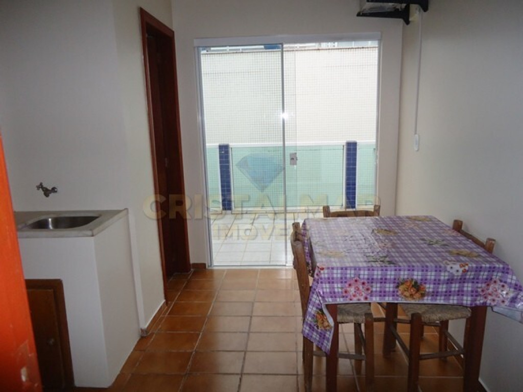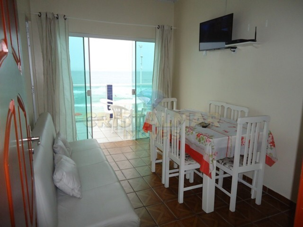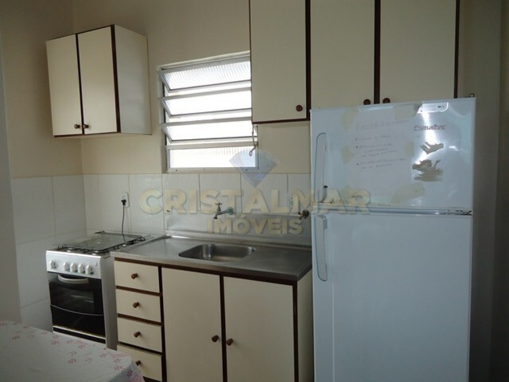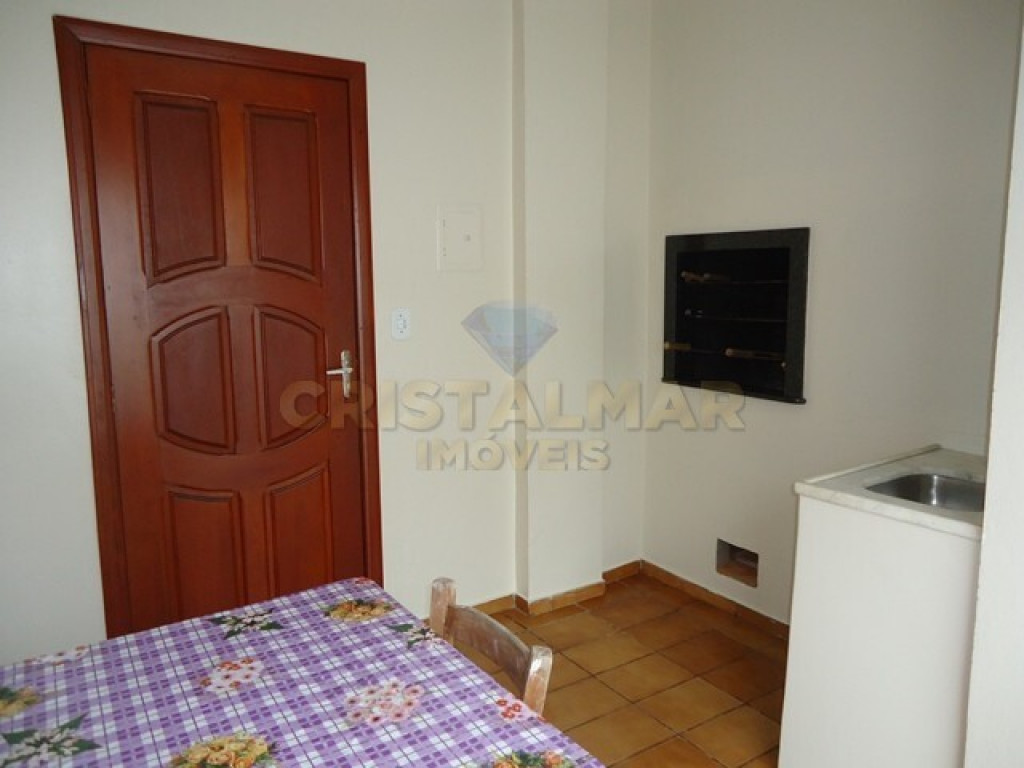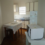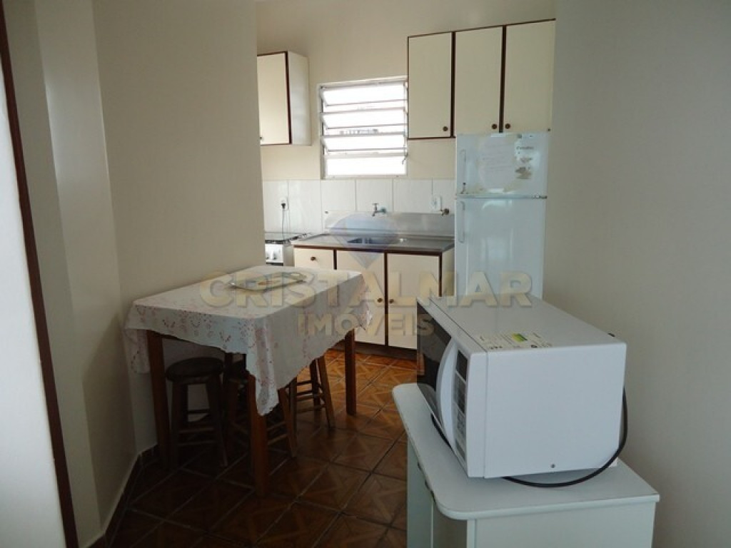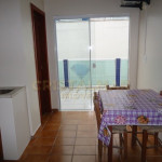 Sala e Cozinha integradas, com tv, sofá cama, mesa com 6 cadeiras, geladeira, fogão 4 bocas, microondas e demais utensílios básico