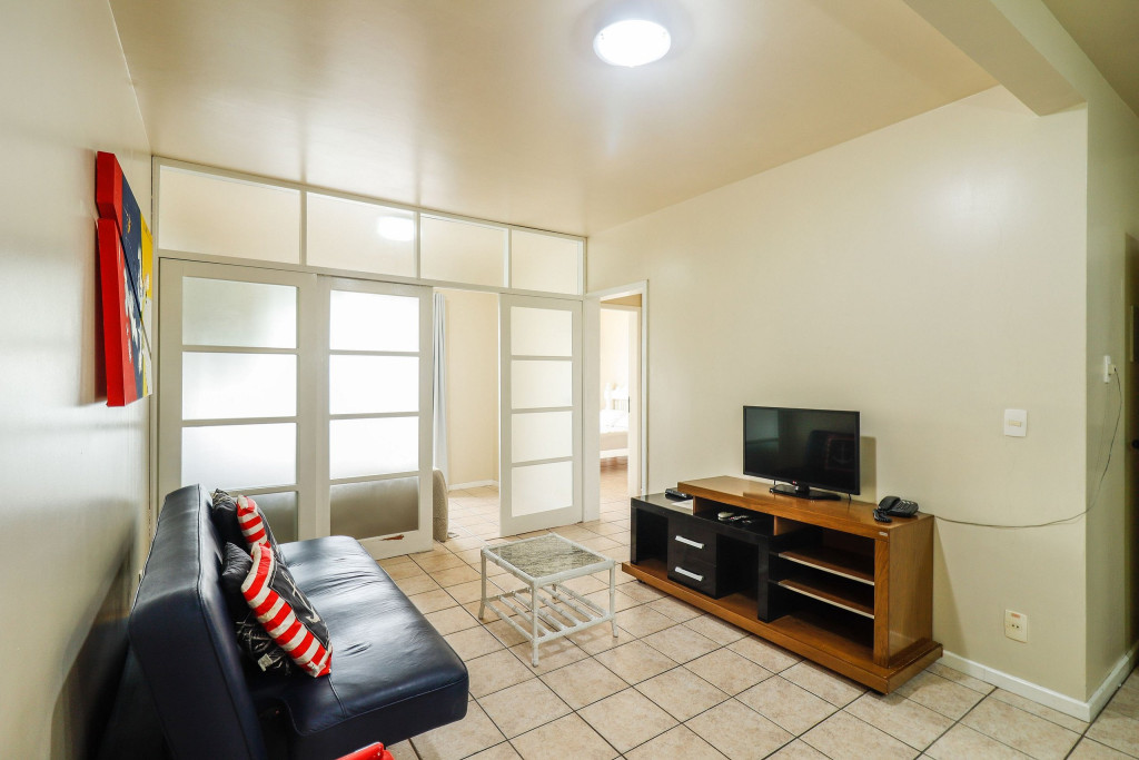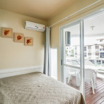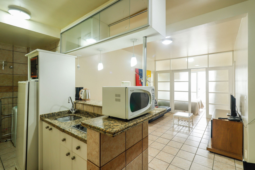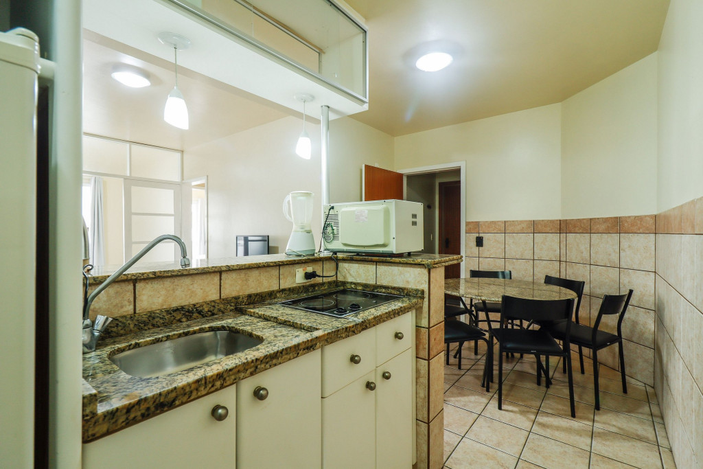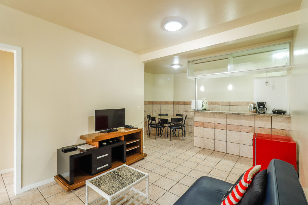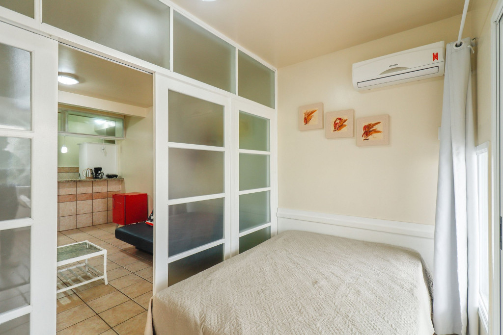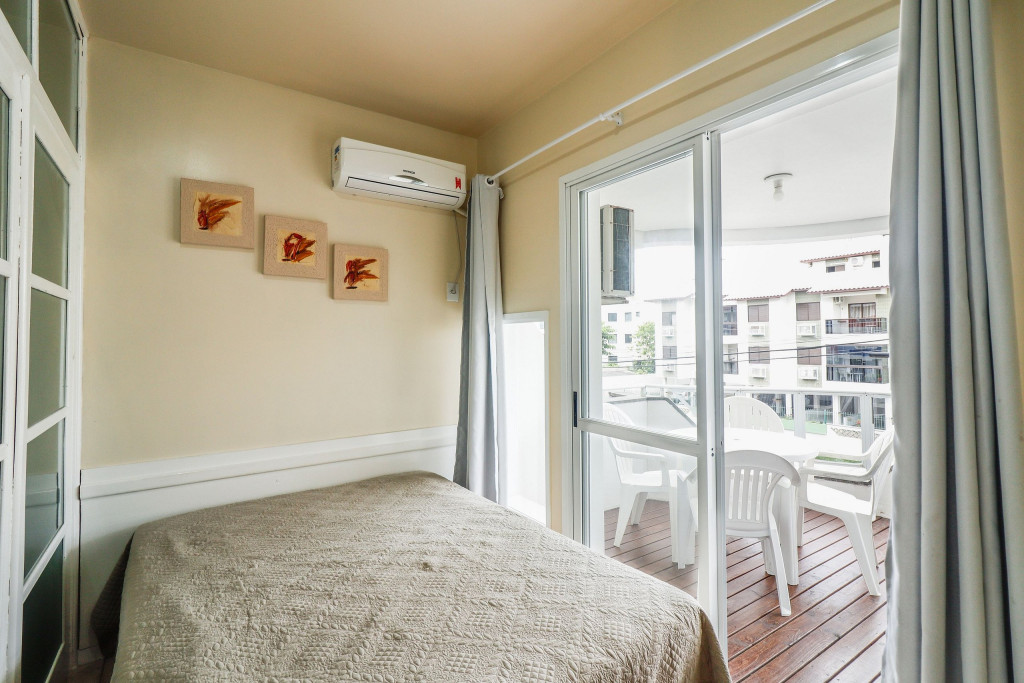 Apartamento Suíte - 1 dormitório com cama de casal com ar condicionado, 1 sala com dois ambientes, uma com sofá cama e outra com uma cama de casal, cozinha americana completa, 1 banheiro e sacada com churrasqueira
