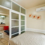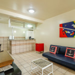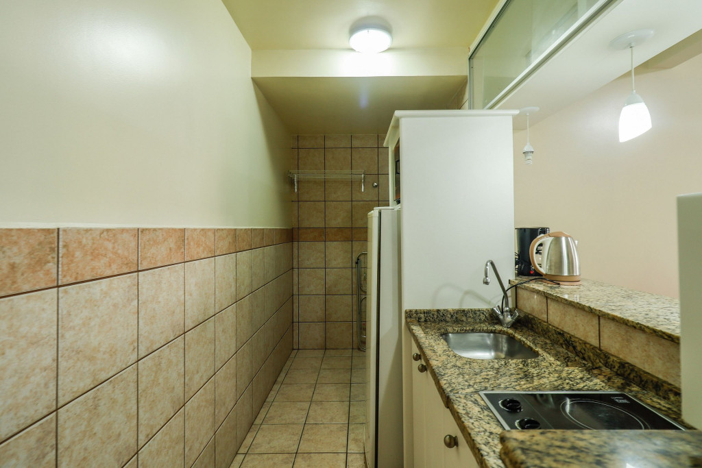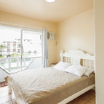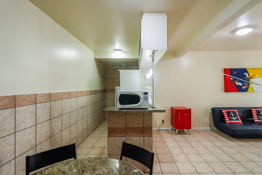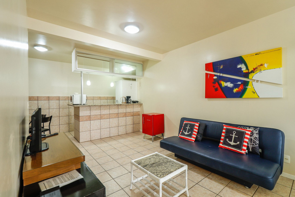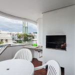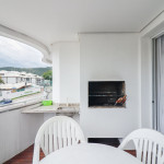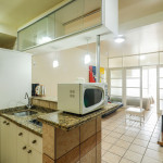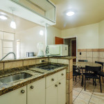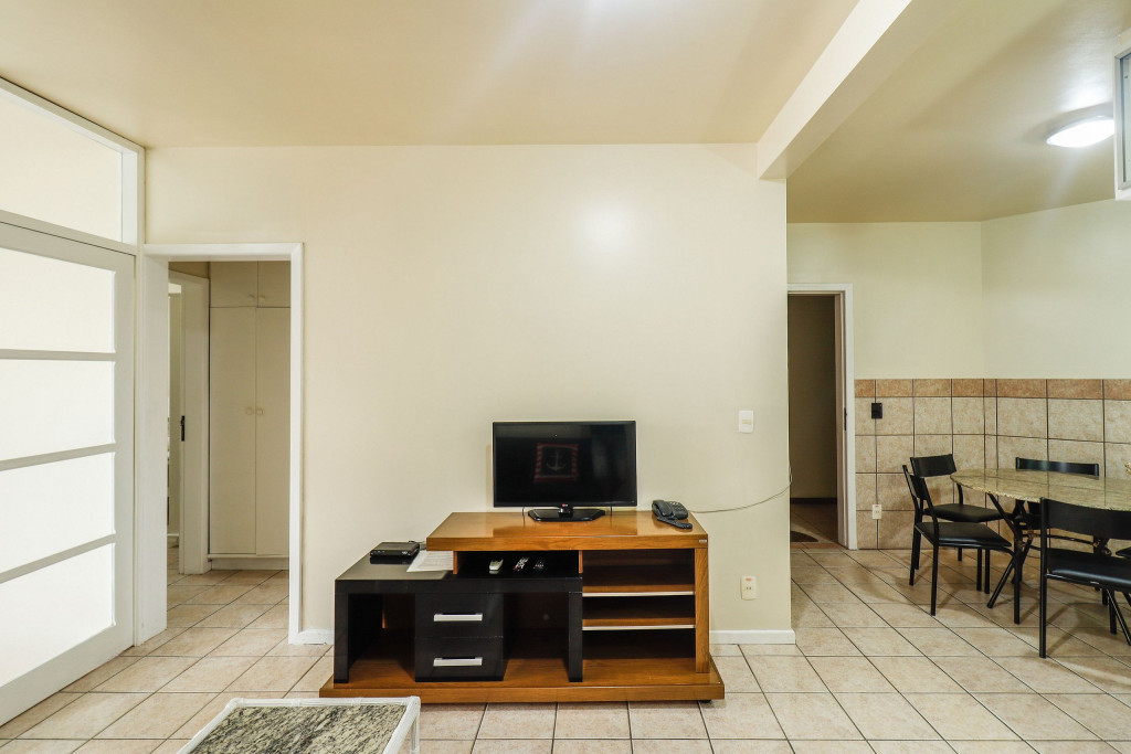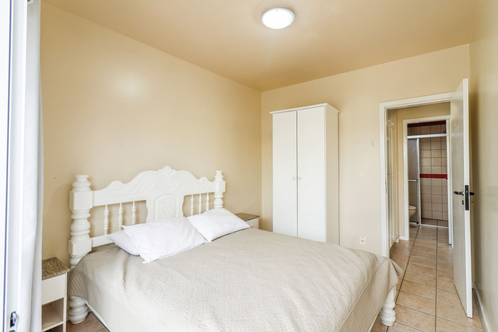 Apartamento Suíte - 1 dormitório com cama de casal com ar condicionado, 1 sala com dois ambientes, uma com sofá cama e outra com uma cama de casal, cozinha americana completa, 1 banheiro e sacada com churrasqueira