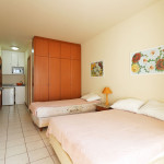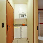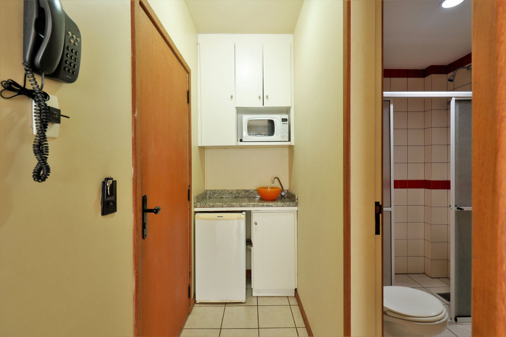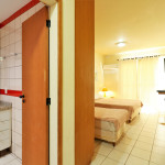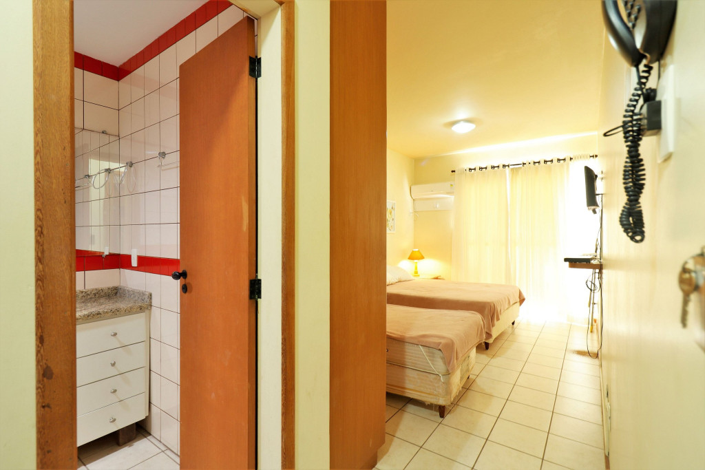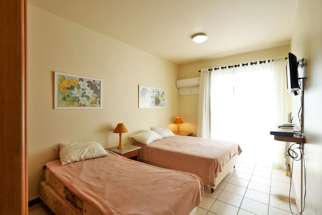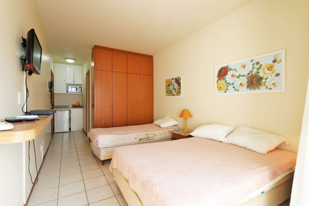 Apartamento Luxo - 01 dormitório com cama de casal e uma de solteiro, ar condicionado, TV , minibar e micro-ondas, 1 banheiro e sacada.