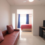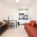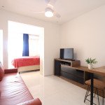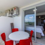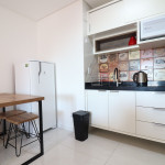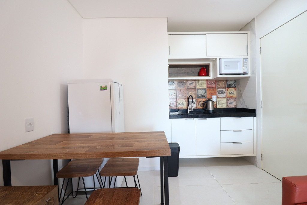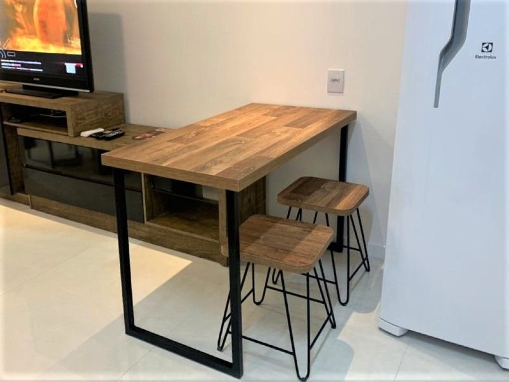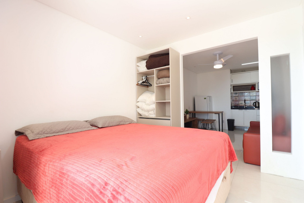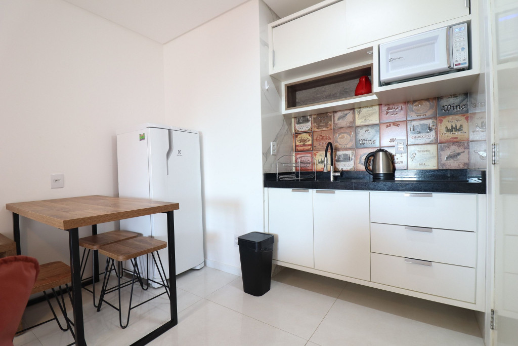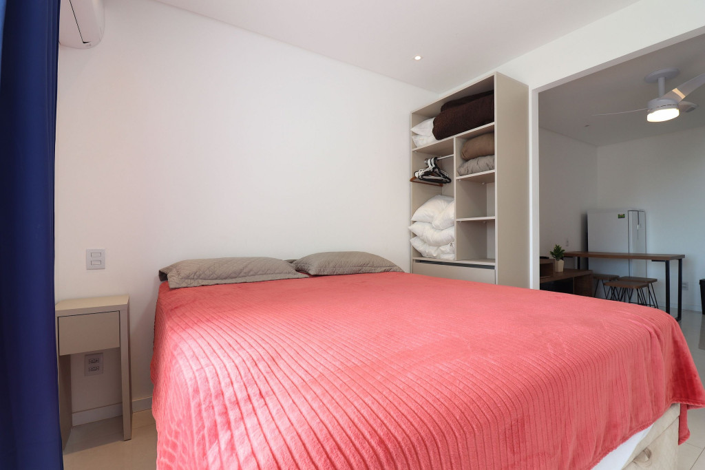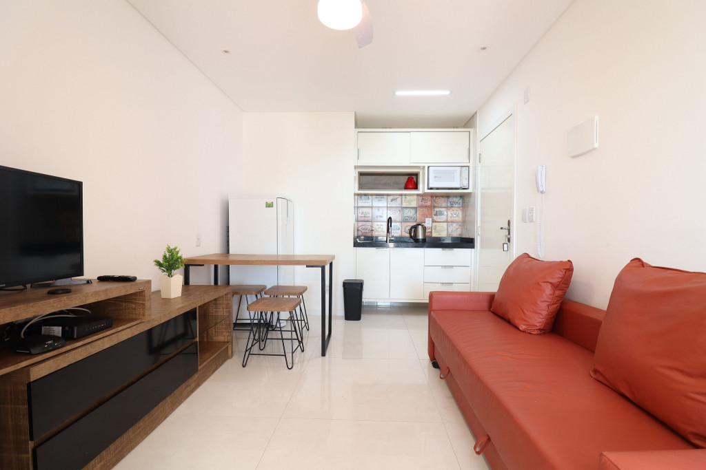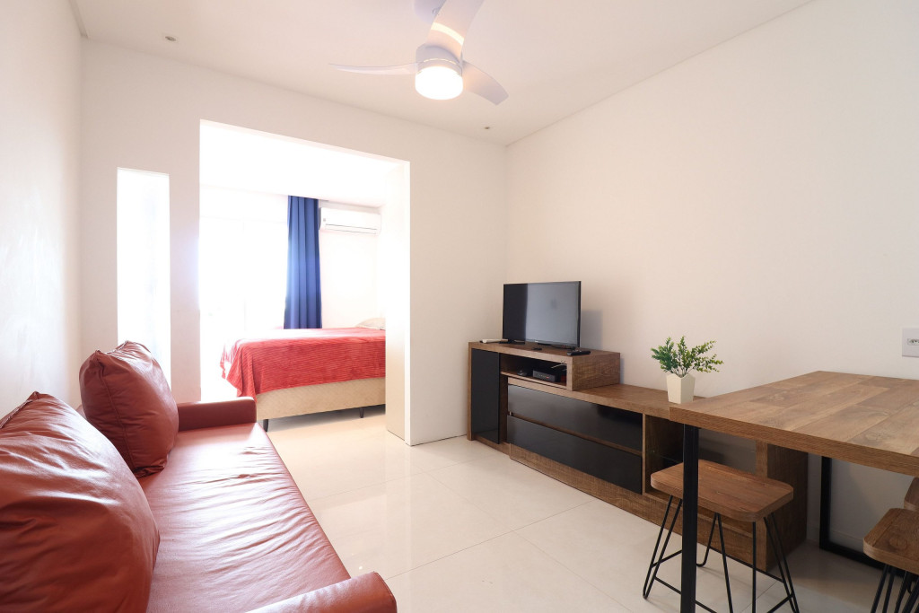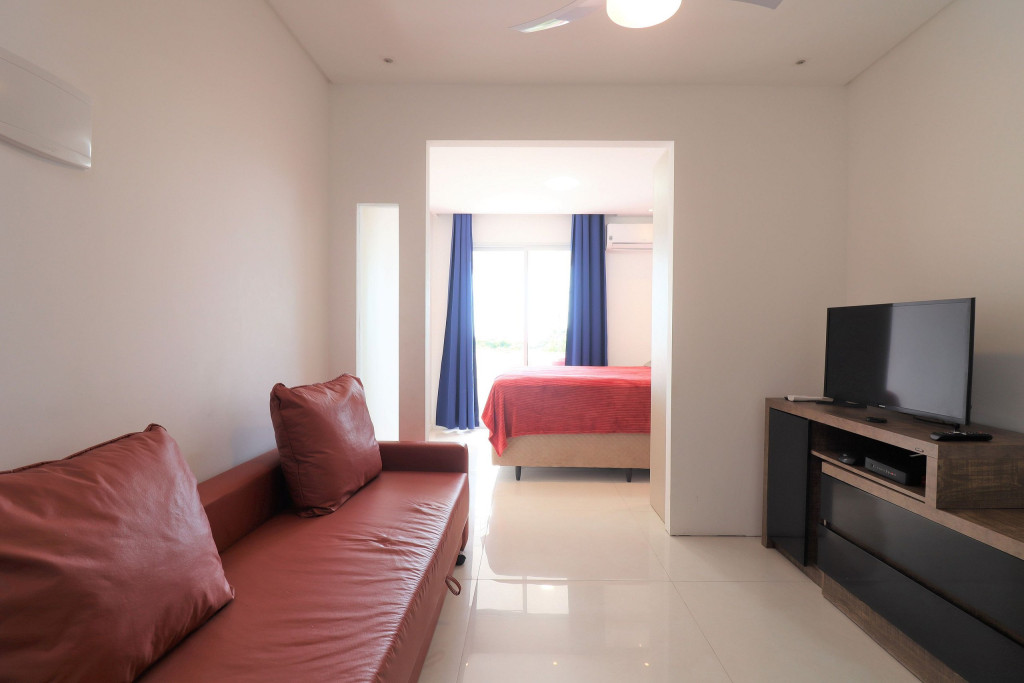 Apartamento Luxo - 01 dormitório com cama de casal, ar condicionado, sala com sofá cama, TV e cozinha (geladeira, microondas e fogão elétrico, itens básicos de cozinha) conjugada, 1 banheiro e sacada.