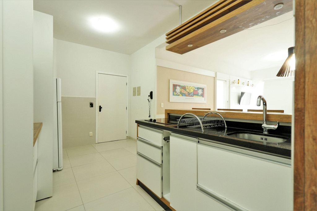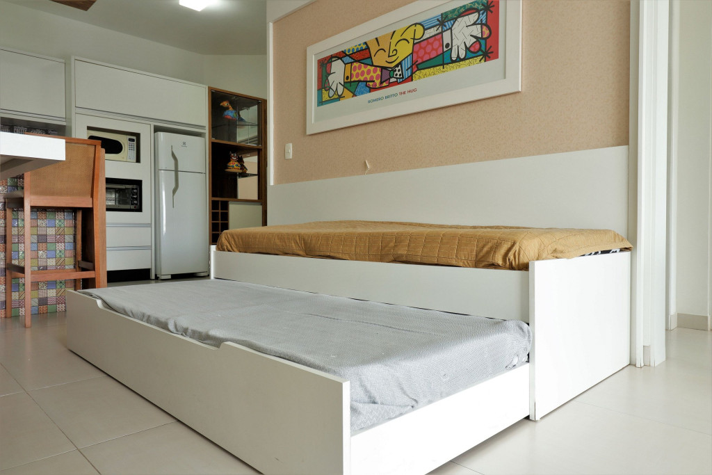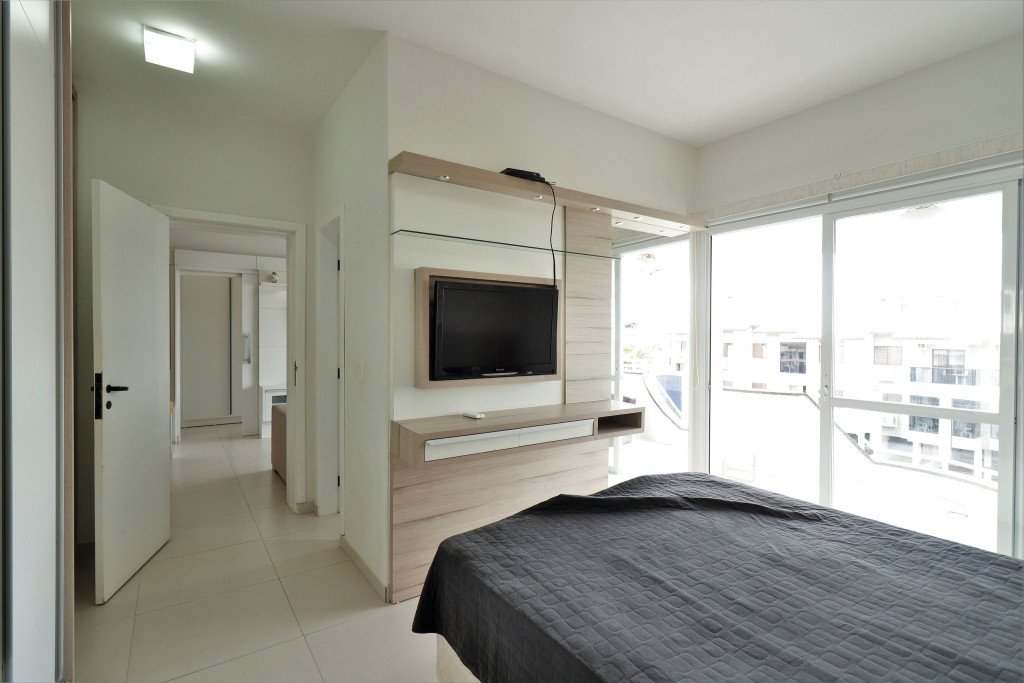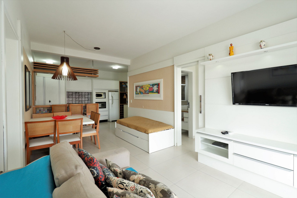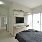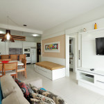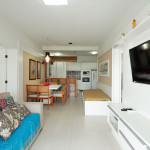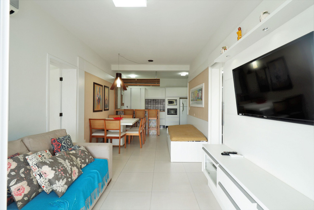 Apartamento Suíte Master - 1 dormitório suíte com cama de casal, 1 dormitório com 2 camas de solteiro, 1 sala com sofá cama e bicama, cozinha americana completa, área de serviço, 1 banheiro social e 3 sacadas (uma delas com churrasqueira).