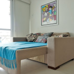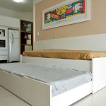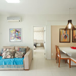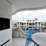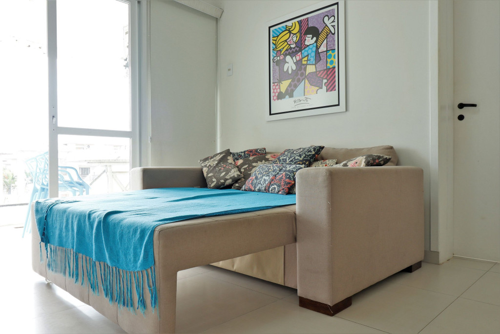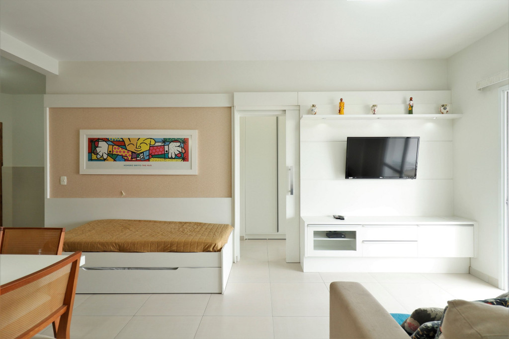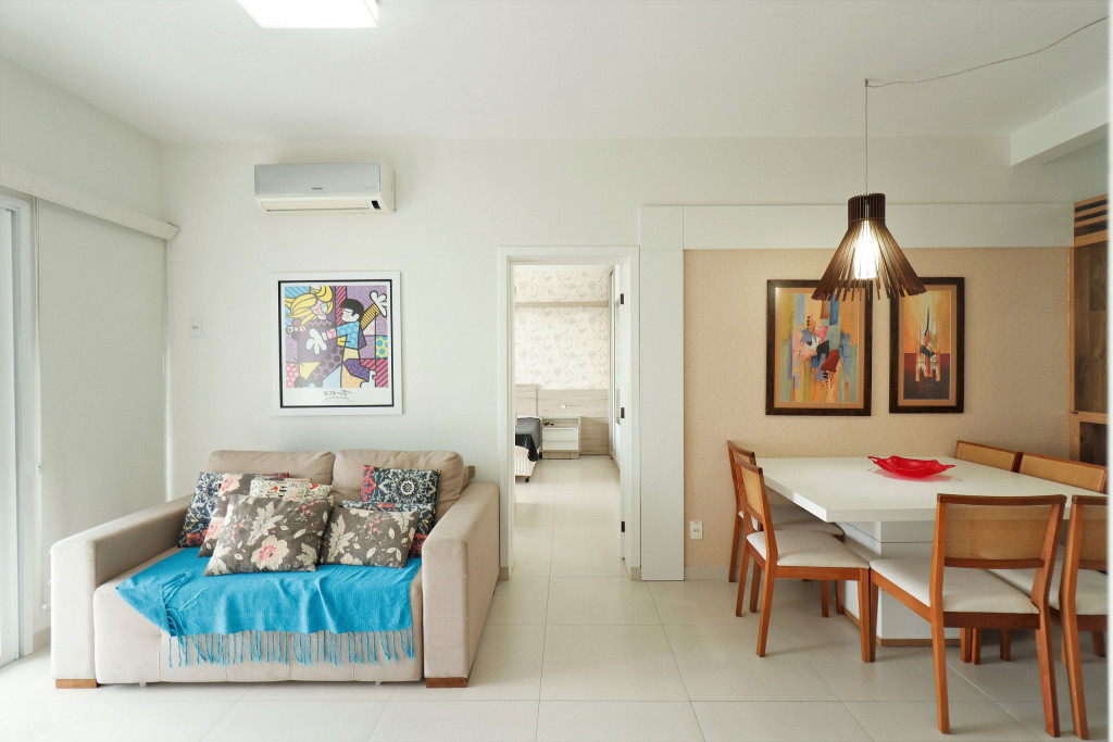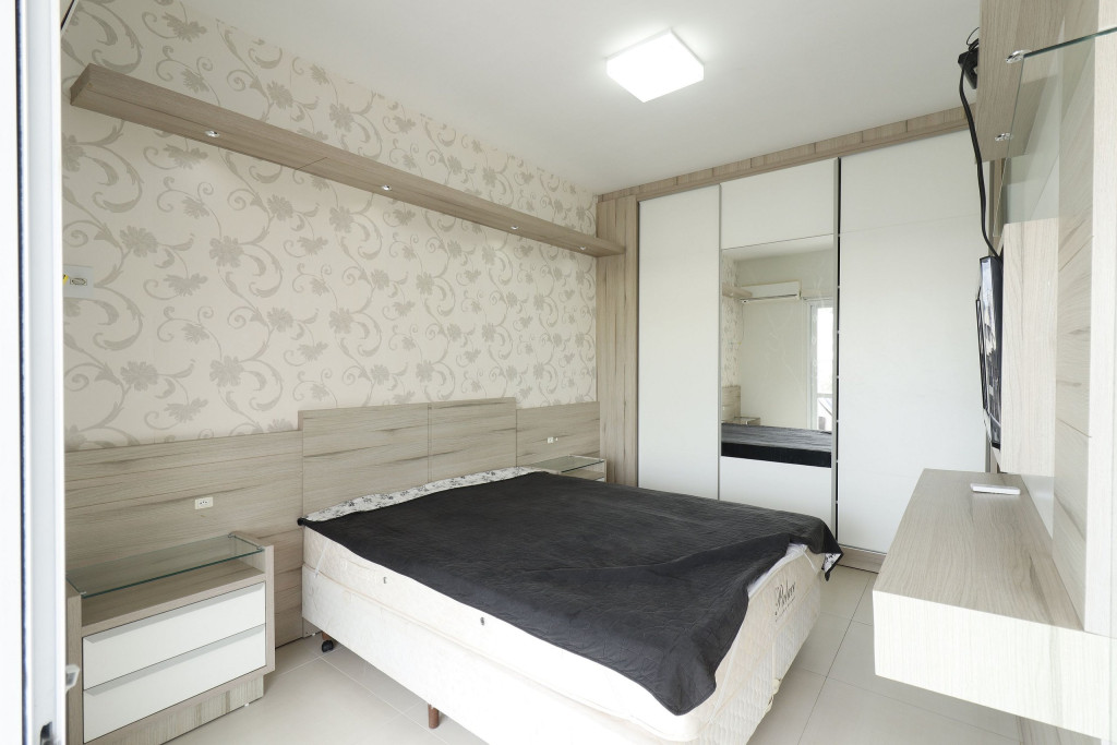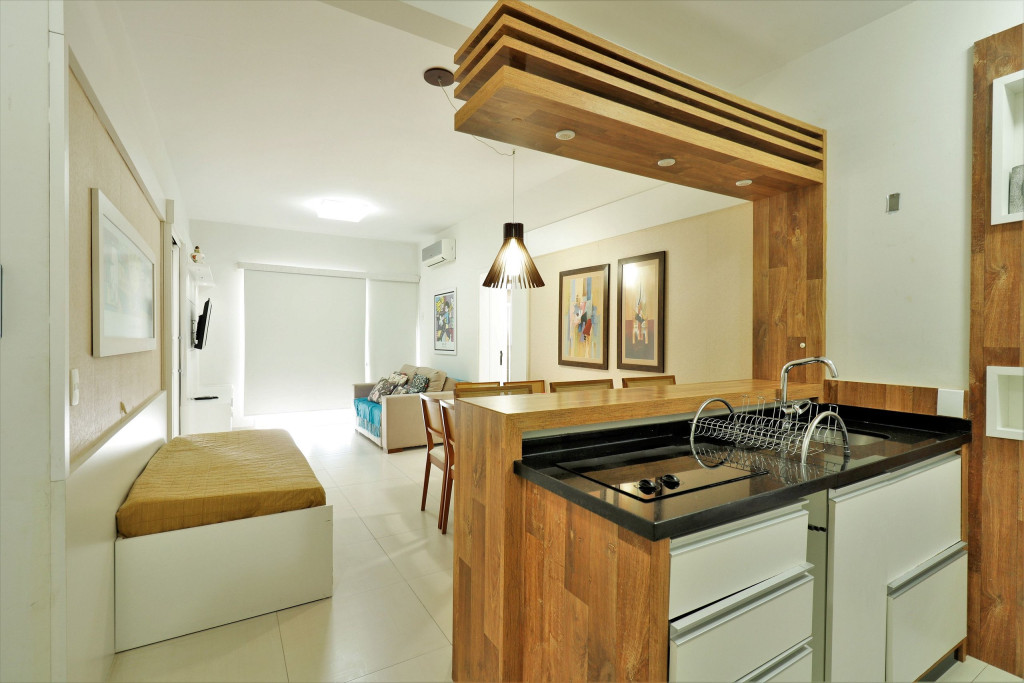 Apartamento Suíte Master - 1 dormitório suíte com cama de casal, 1 dormitório com 2 camas de solteiro, 1 sala com sofá cama e bicama, cozinha americana completa, área de serviço, 1 banheiro social e 3 sacadas (uma delas com churrasqueira).