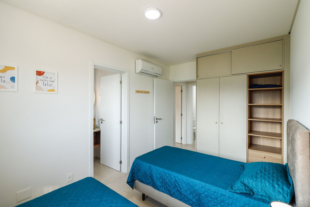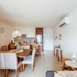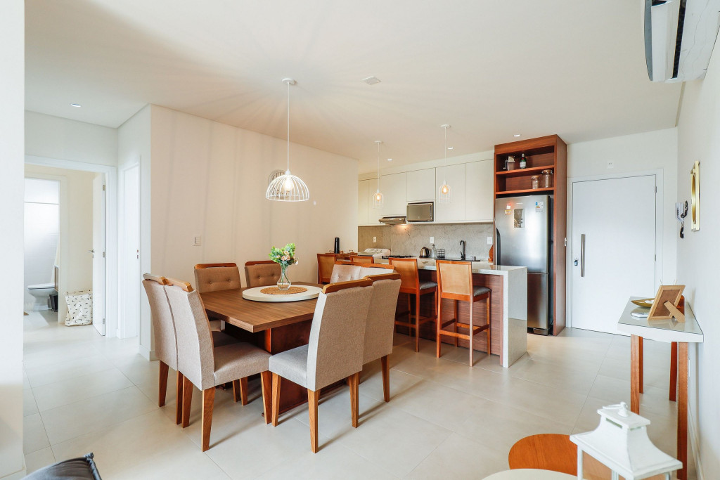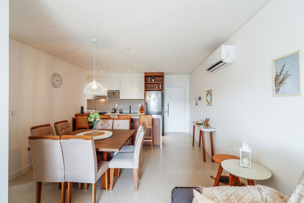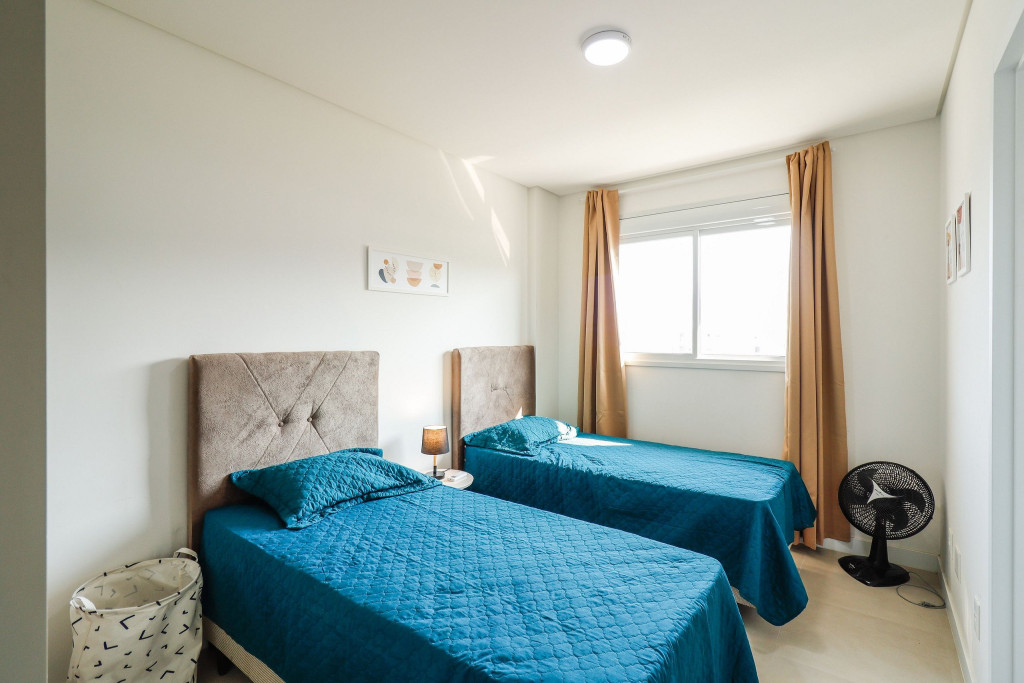 Belo apartamento, à 200 metros da praia, composto por duas suítes, sendo uma com cama de casal, uma cama de solteiro e ar-condicionado, e a outra com duas camas de solteiro e ar-condicionado, banheiro social, sacada com churrasqueira e pia, cozinha completa, área de serviço com máquina de lavar. Possui uma vaga de garagem, conta com wi-fi e TV à cabo.