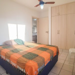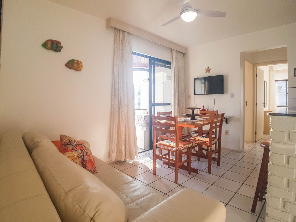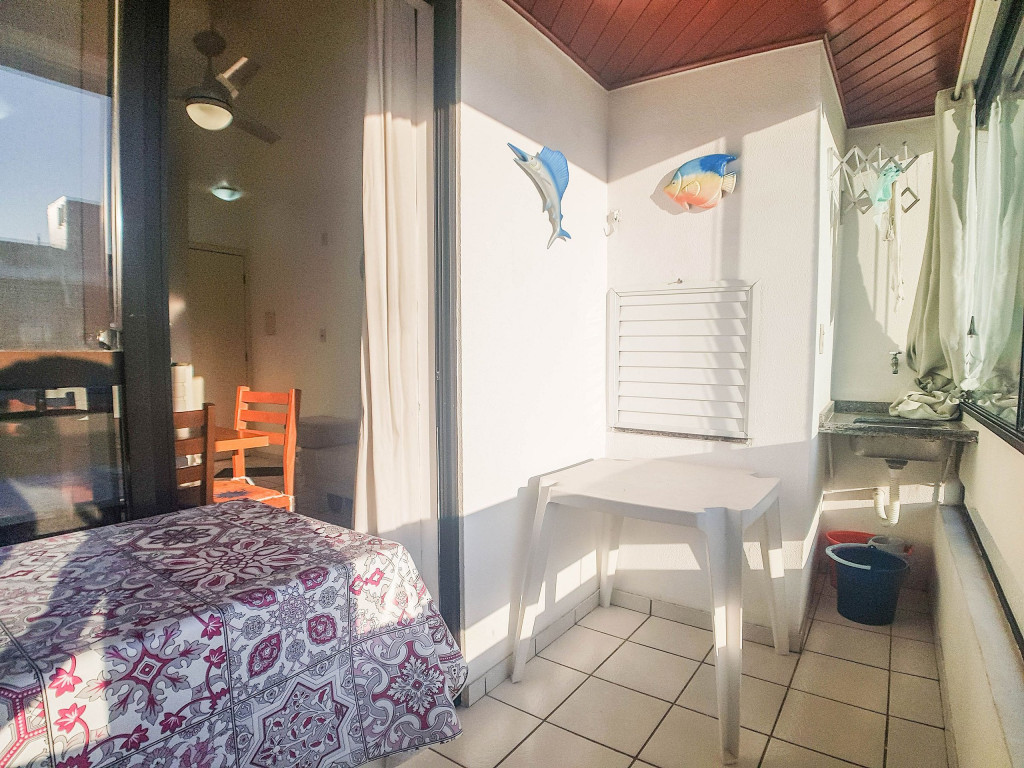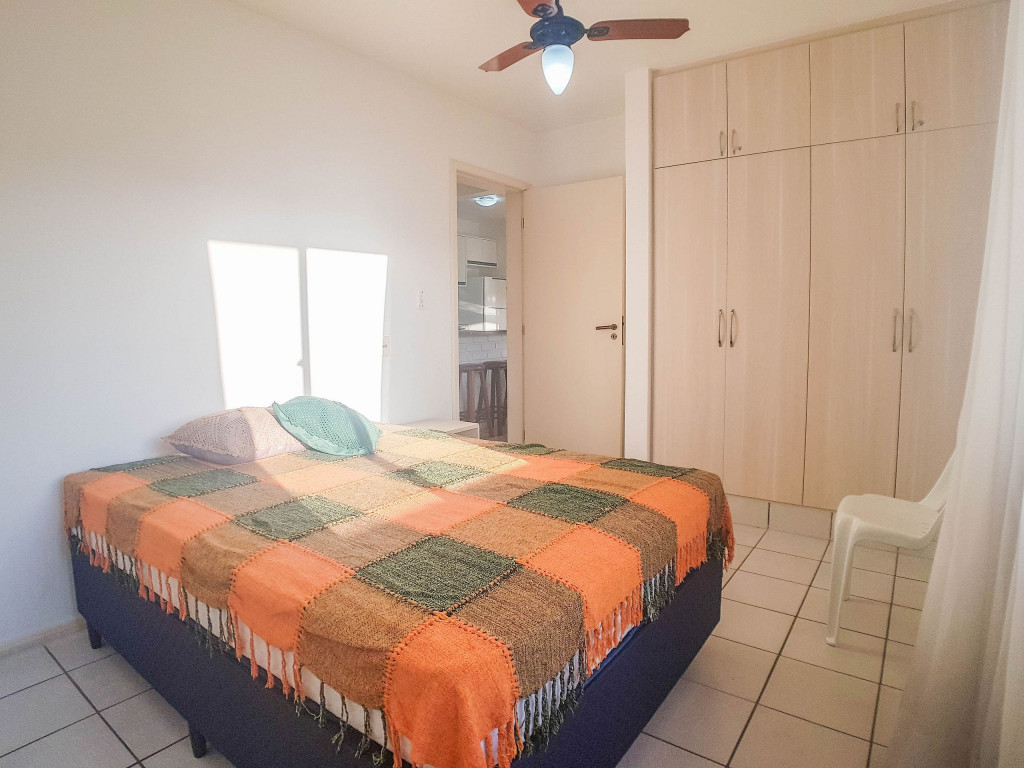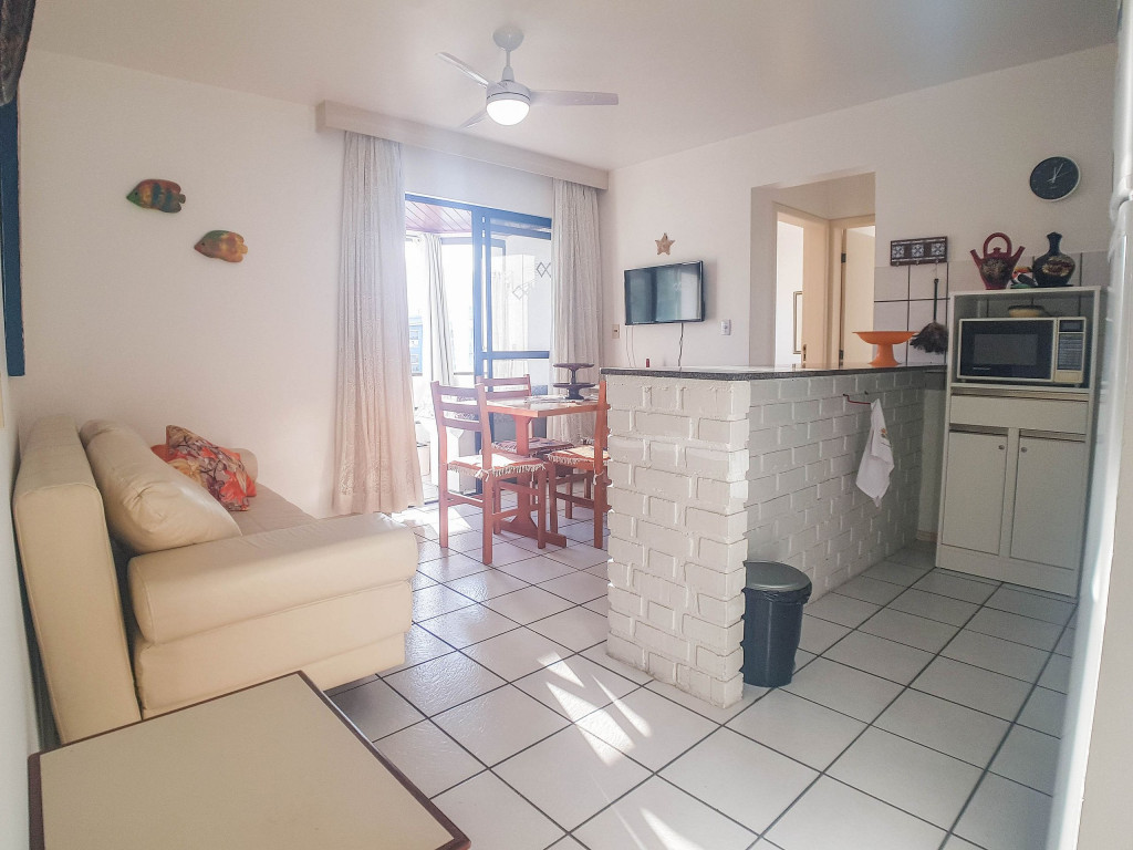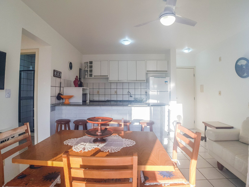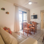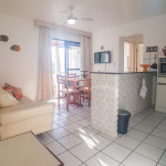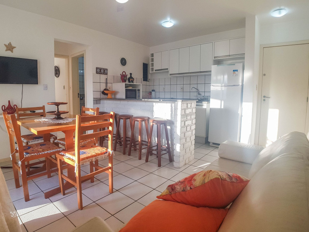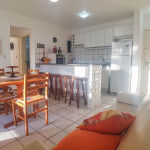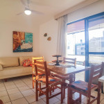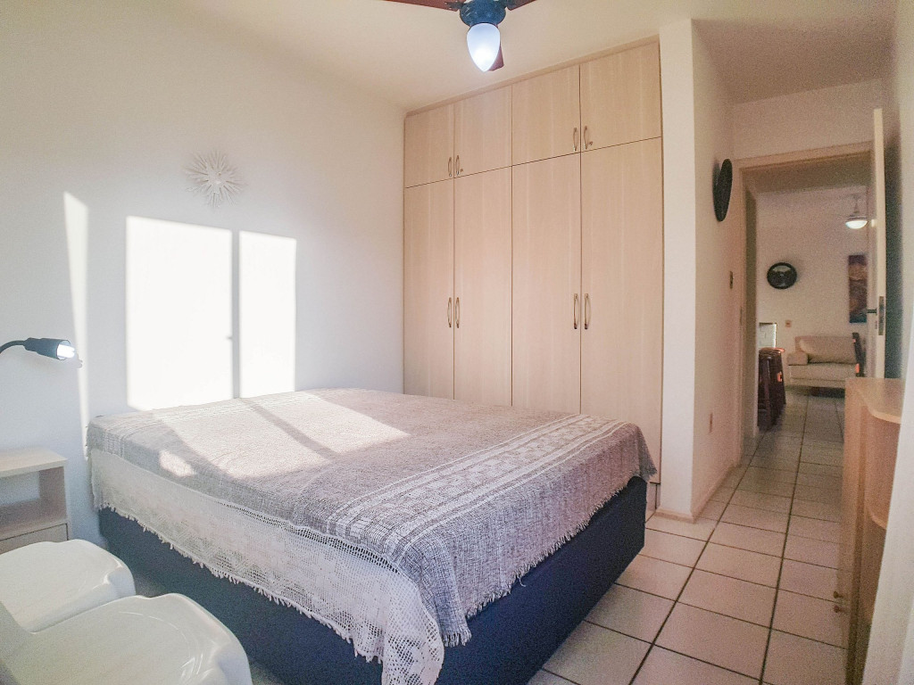 Belo apartamento, à 30 metros da praia, composto por dois dormitórios, os dois com cama de casal e ar-condicionado, sala com sofá-cama para uma pessoa, um banheiro, sacada com churrasqueira e pia, cozinha completa. Possui uma vaga de garagem.