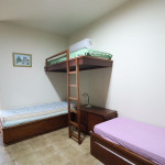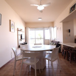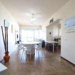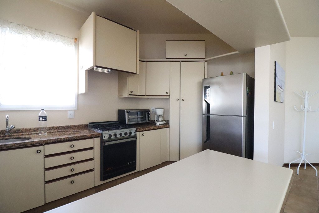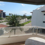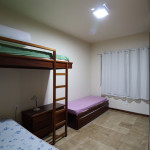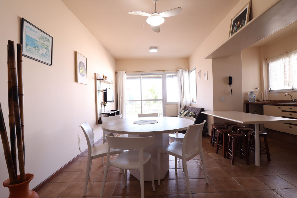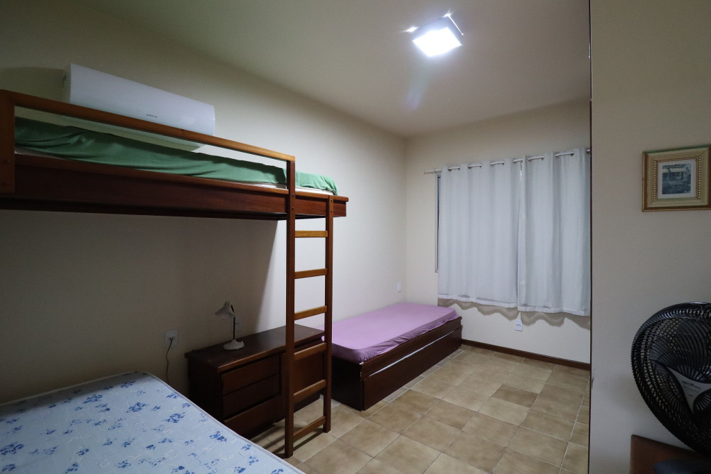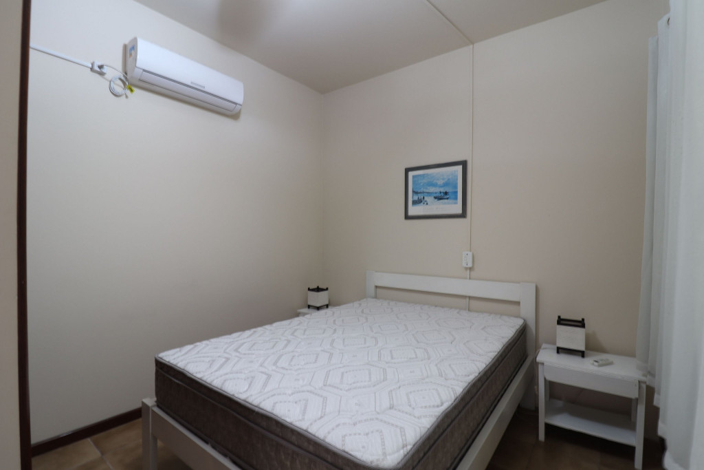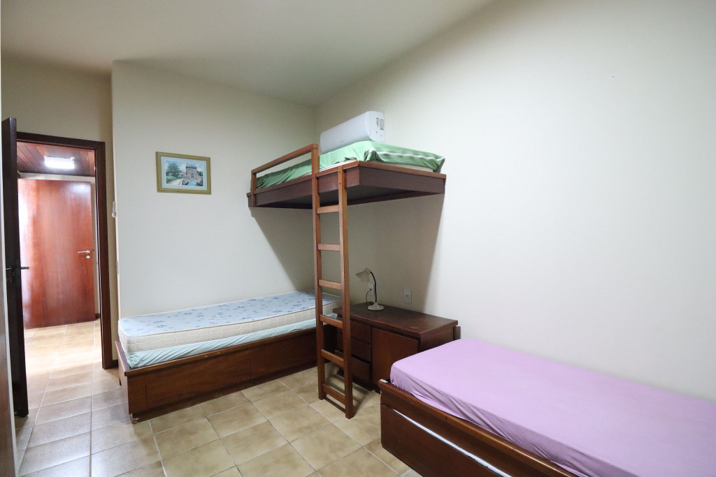 Belo apartamento, à 30 metros da praia, composto por dois dormitórios, sendo uma suíte com cama de casal e ar-condicionado, um quarto com uma beliche, uma cama de solteiro e uma cama auxiliar, banheiro social, vista lateral para o mar e cozinha.