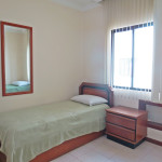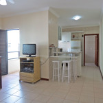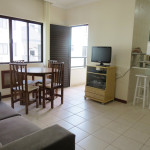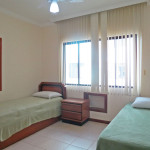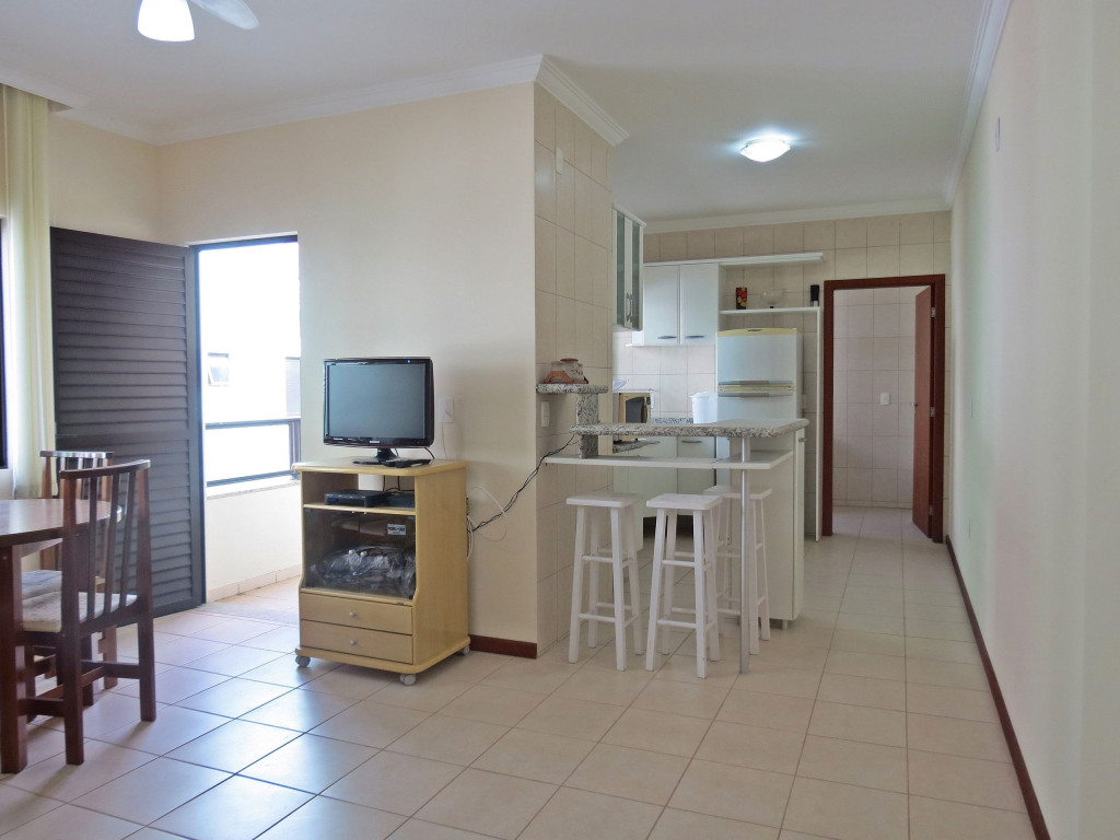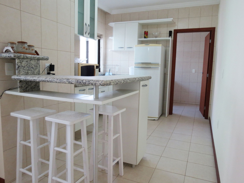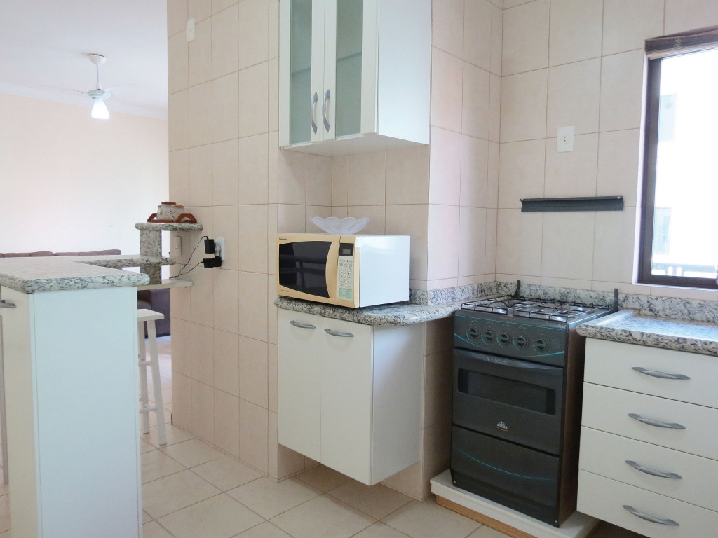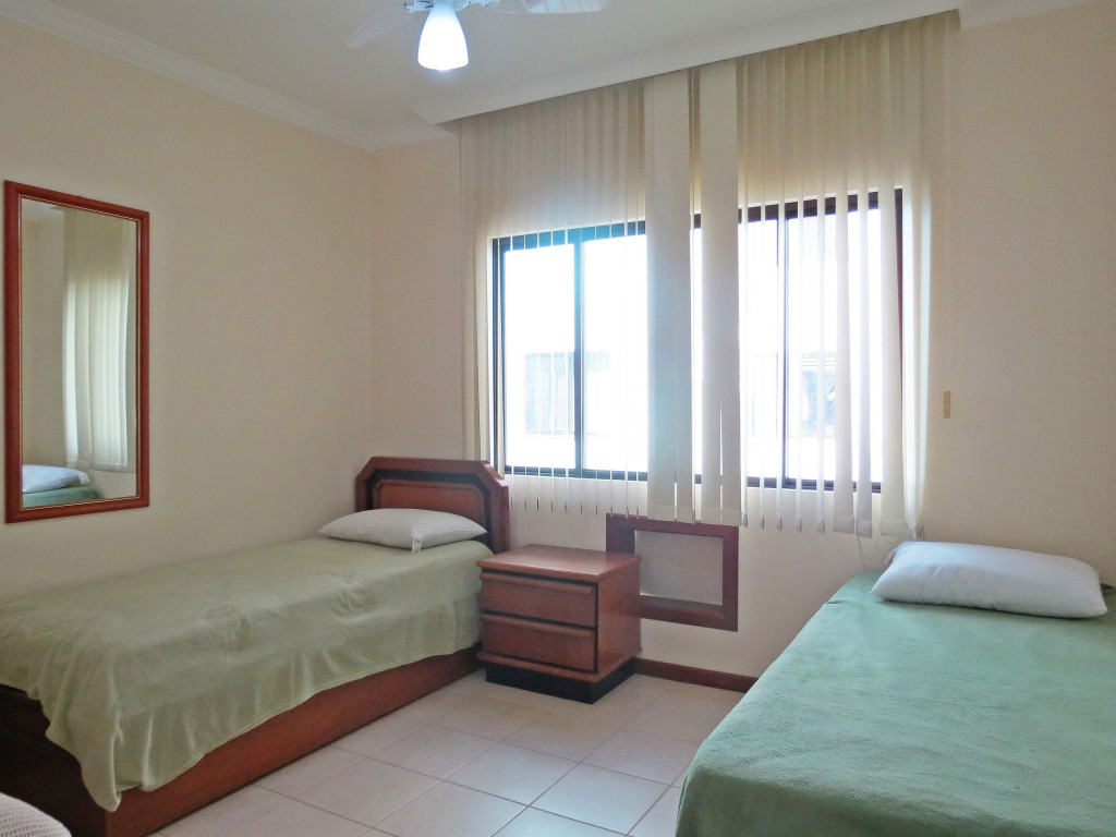 Belo apartamento, à 300 metros da praia, composto por dois dormitórios, sendo uma suíte com cama de casal e ar-condicionado, um quarto com duas camas de solteiro, uma cama auxiliar e ventilador de teto, banheiro social, sacada com churrasqueira e pia, cozinha completa, área de serviço com máquina de lavar e tanque.