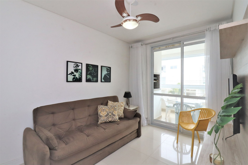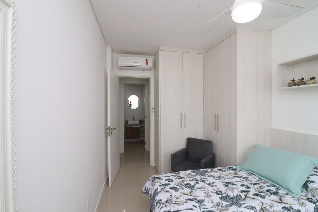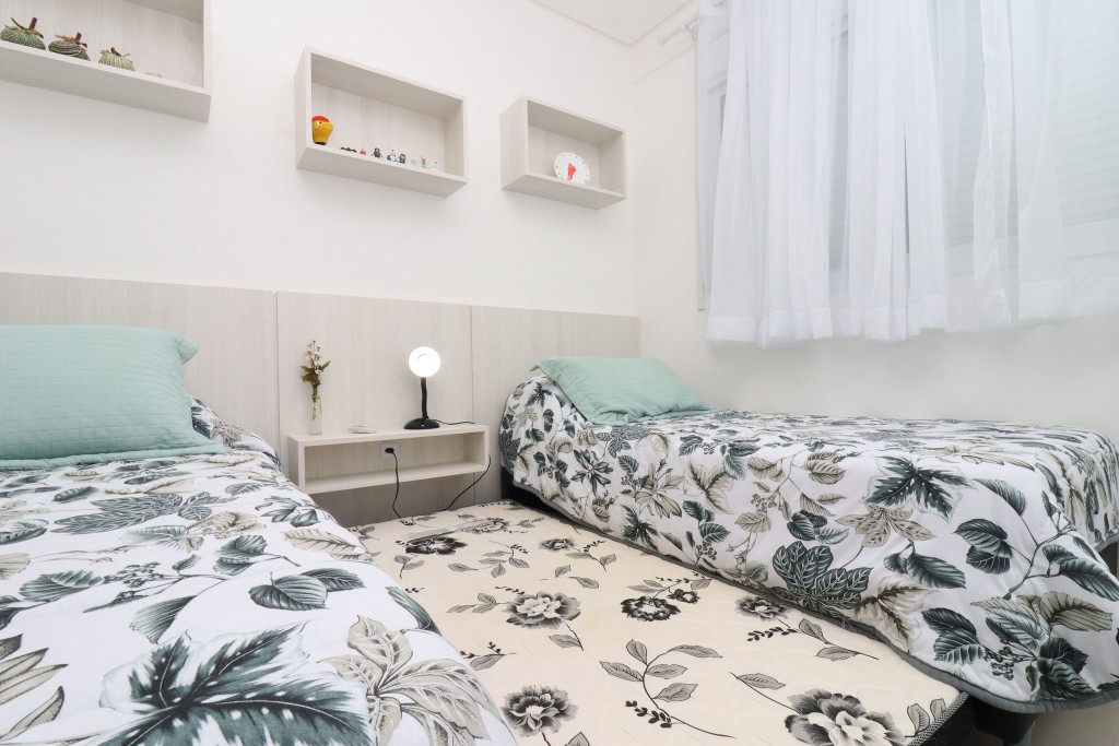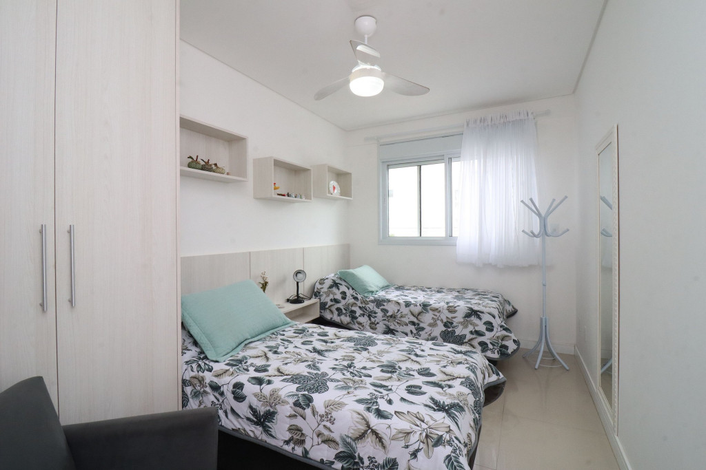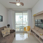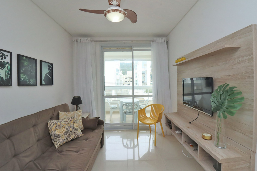 Belo apartamento, à 200 metros da praia, composto por dois dormitórios, sendo uma suíte com cama de casal e ar-condicionado, um quarto com duas camas de solteiro, uma cama auxiliar e ar-condicionado, sala com sofá-cama, banheiro social, sacada com churrasqueira e pia, cozinha completa, área de serviço com máquina de lavar e tanque. Possui uma vaga de garagem, conta com wi-fi e TV à cabo.