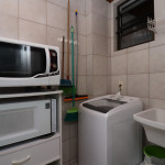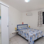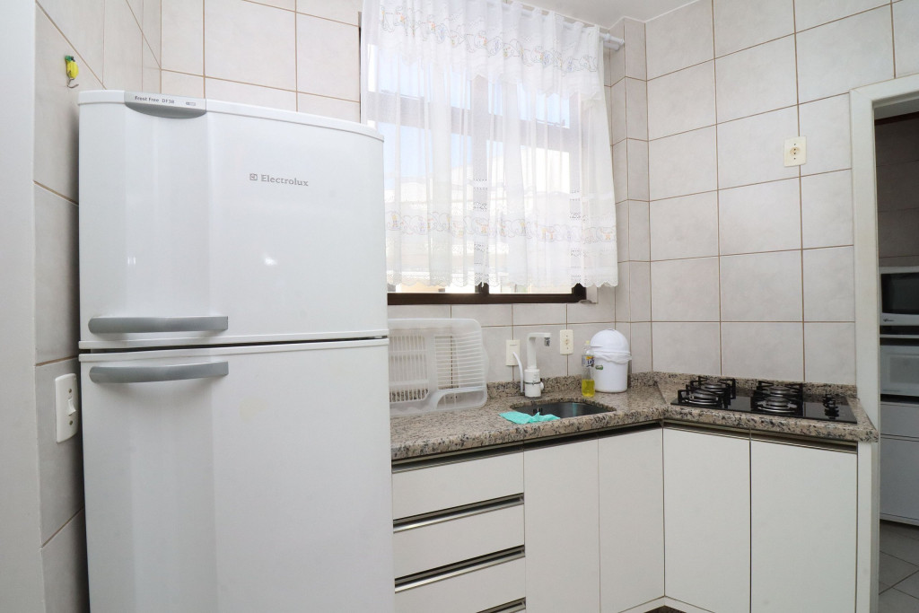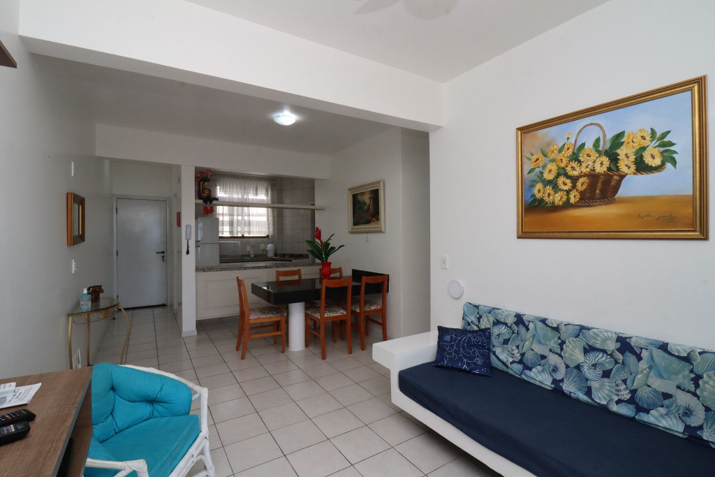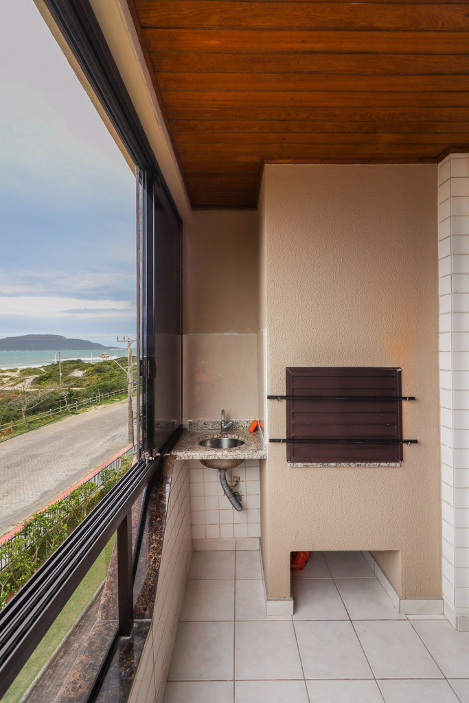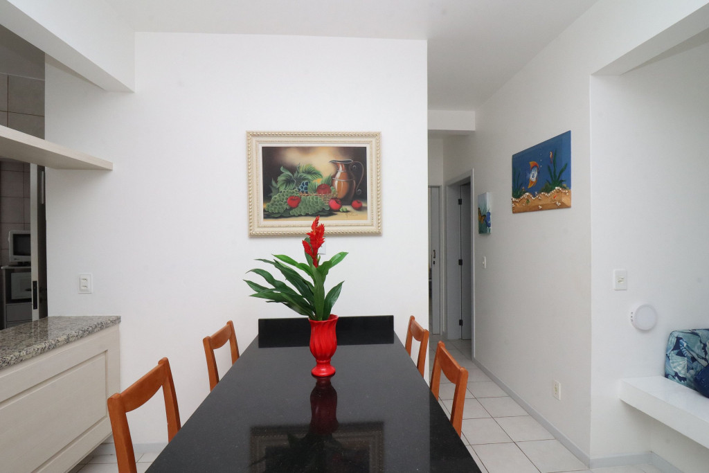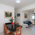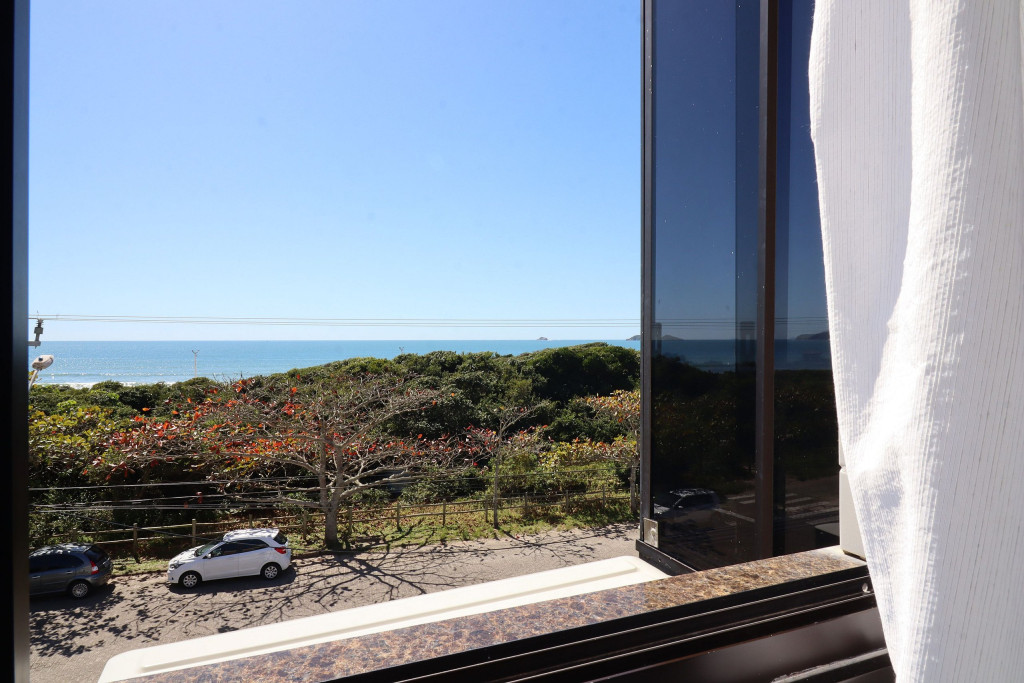 Belo apartamento, à 30 metros da praia, composto por dois dormitórios, sendo uma suíte com cama de casal e ar-condicionado, um quarto com duas camas de solteiro, cama auxiliar e ar-condicionado, banheiro social, sacada com churrasqueira e pia, vista para o mar, cozinha completa, área de serviço com máquina de lavar, tanque e varal.