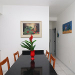 Belo apartamento, à 30 metros da praia, composto por dois dormitórios, sendo uma suíte com cama de casal e ar-condicionado, um quarto com duas camas de solteiro, cama auxiliar e ar-condicionado, banheiro social, sacada com churrasqueira e pia, vista para o mar, cozinha completa, área de serviço com máquina de lavar, tanque e varal. Possui uma vaga de garagem e conta com wi-fi.