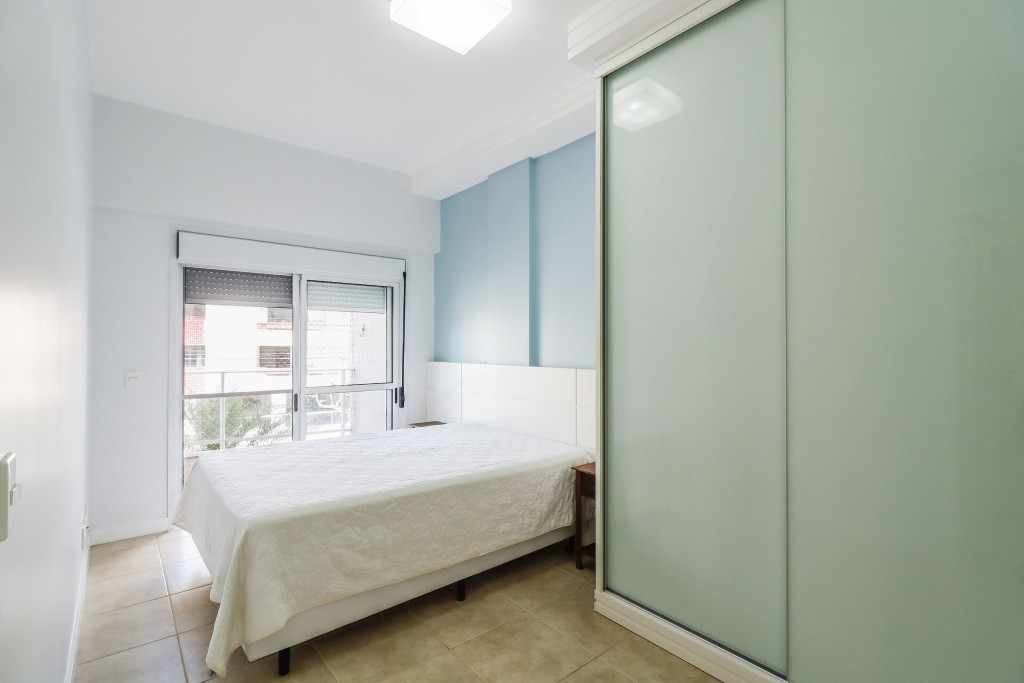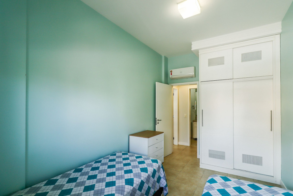 Belo apartamento, pé na areia, composto por dois dormitórios, sendo uma suíte com cama de casal e ar-condicionado, um quarto com duas camas de solteiro, uma cama auxiliar e ar-condicionado, banheiro social, sacada com churrasqueira e pia, cozinha completa, área de serviço com máquina de lavar, tanque e varal. Possui uma vaga de garagem e conta com wi-fi.