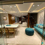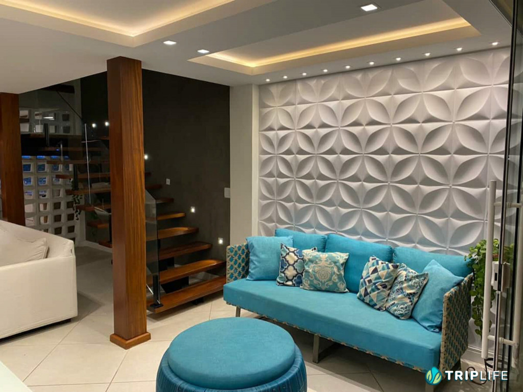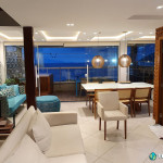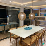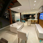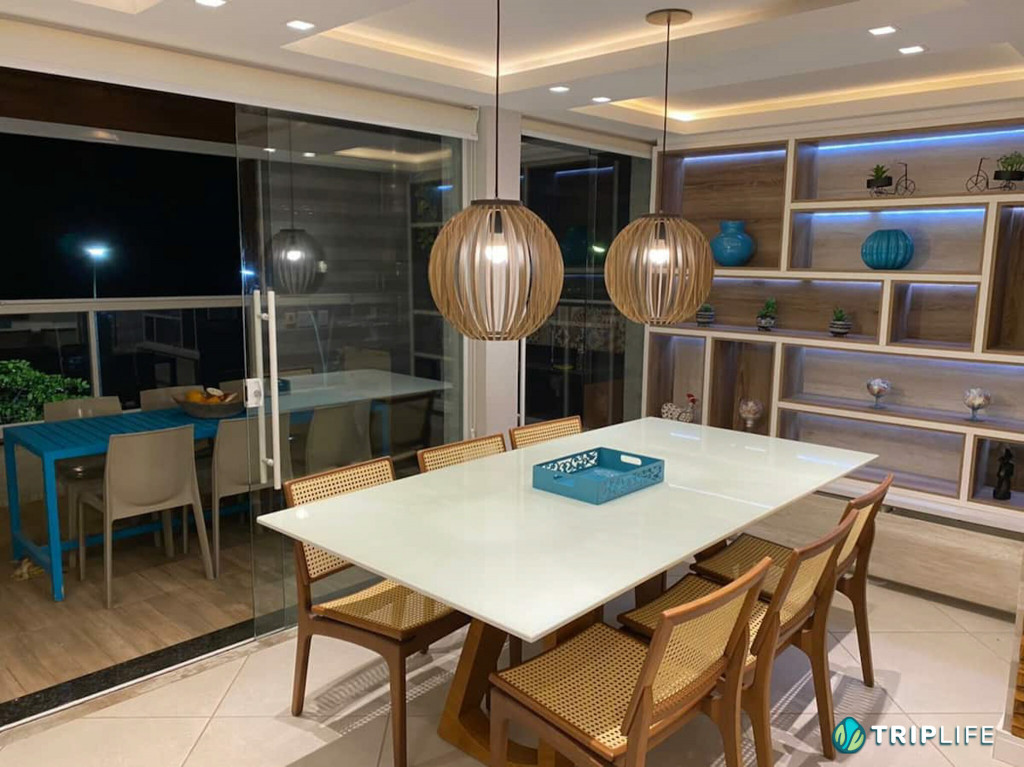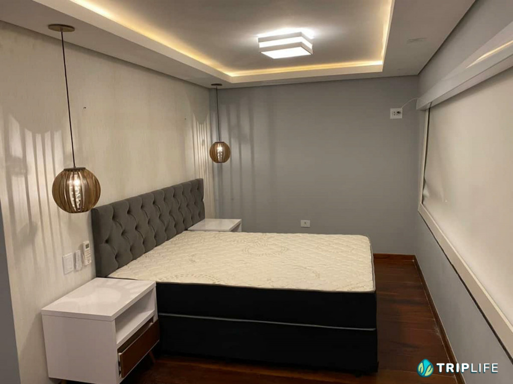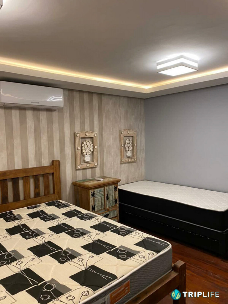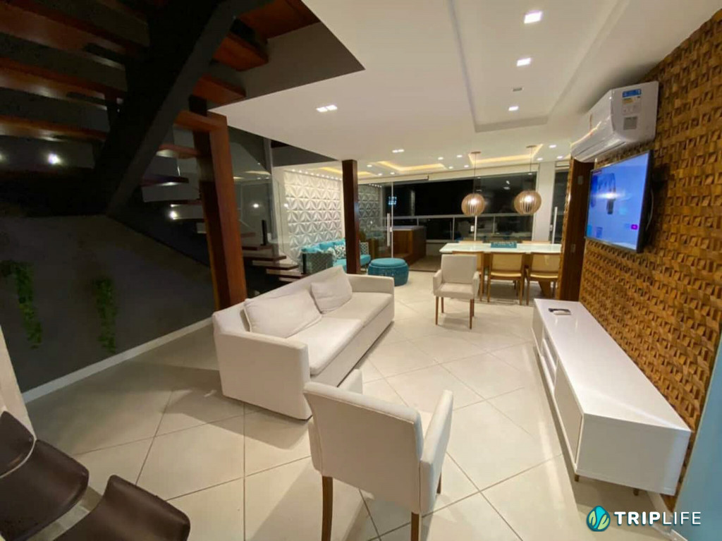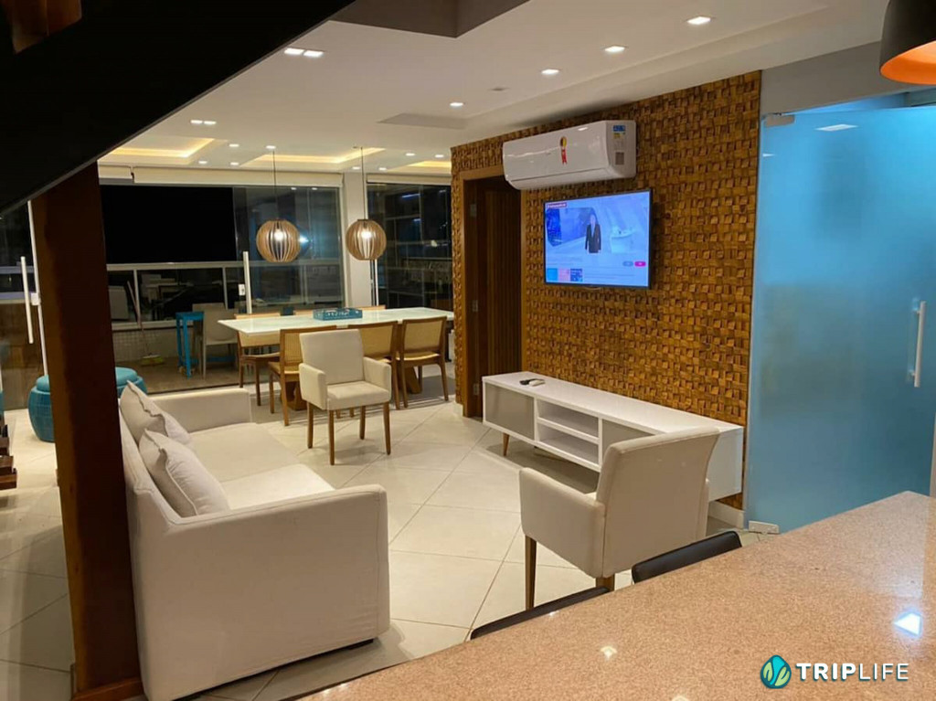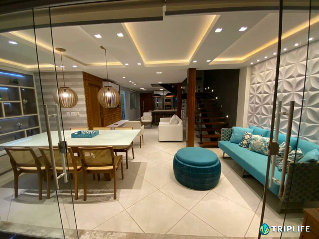Tem sala de estar com smart TV e ar condicionado, área de jantar, cozinha com ilha totalmente equipada e dois quartos – também com ar condicionado – com uma cama de casal e duas camas de solteiro em cada.