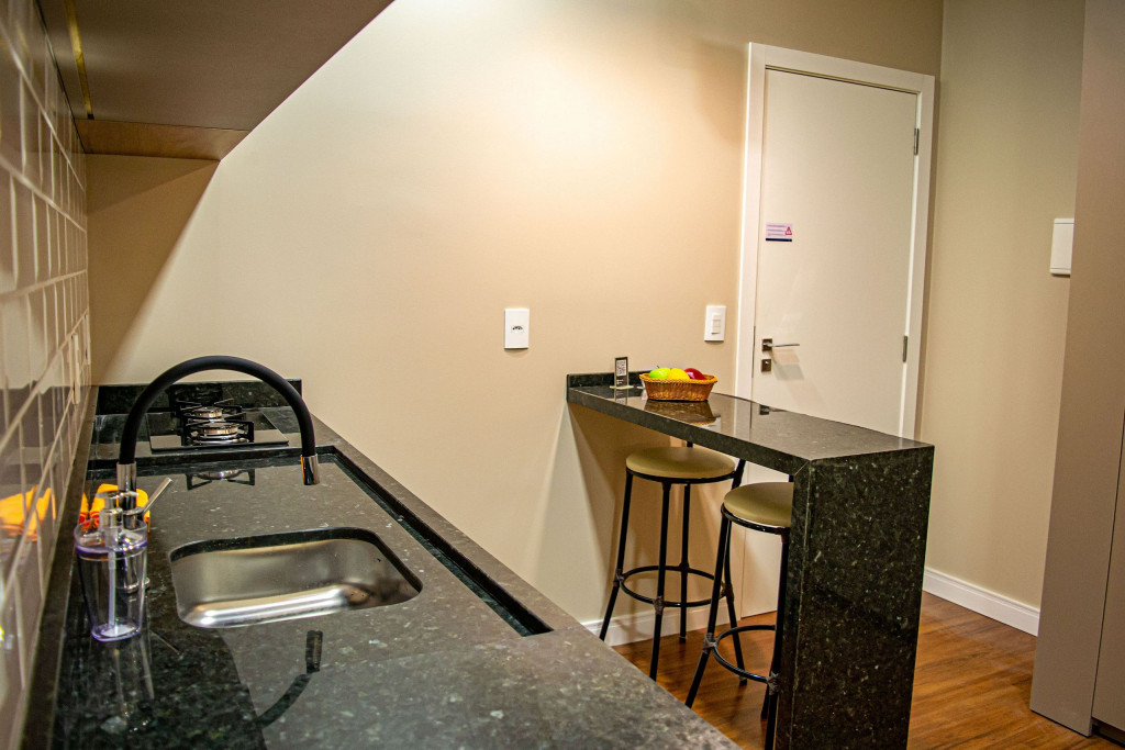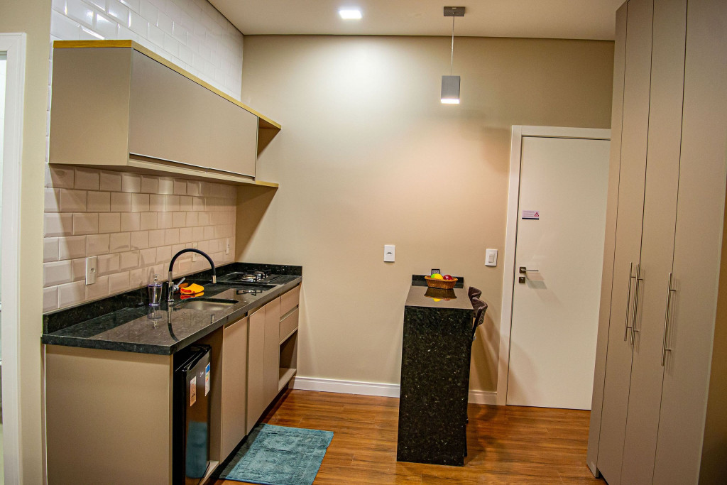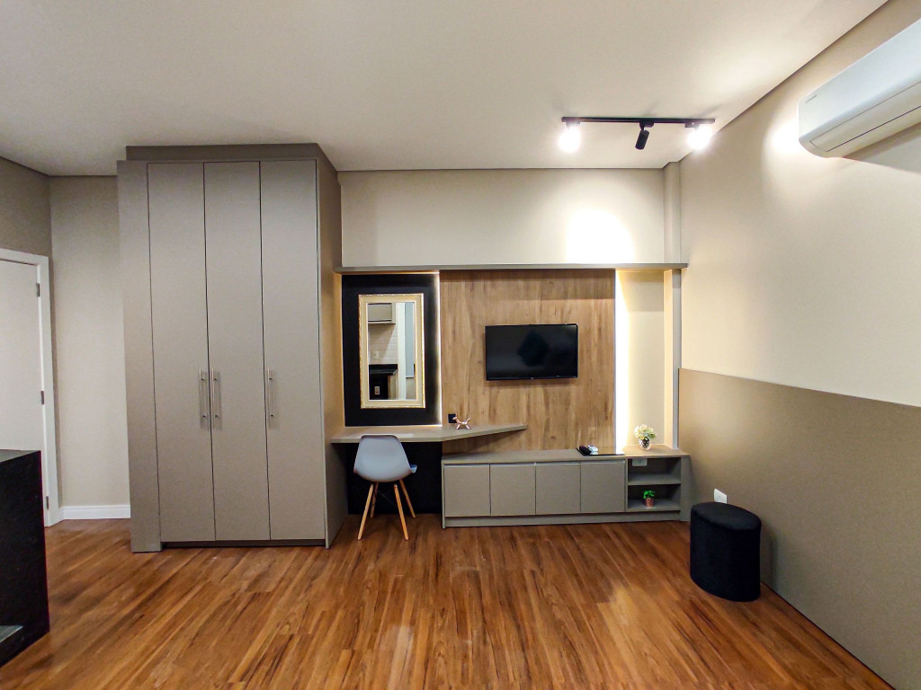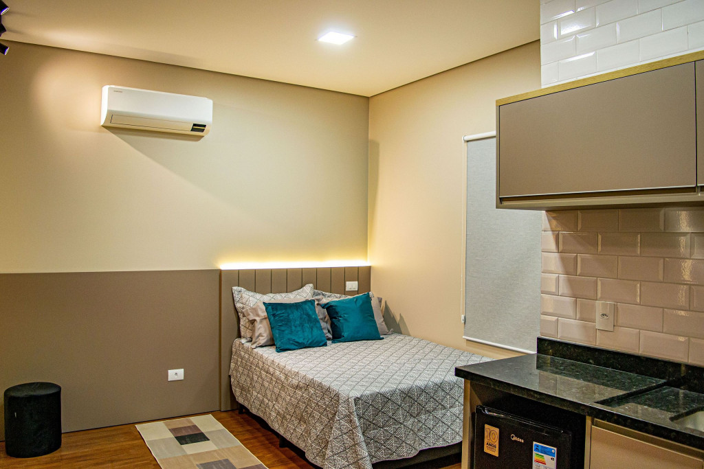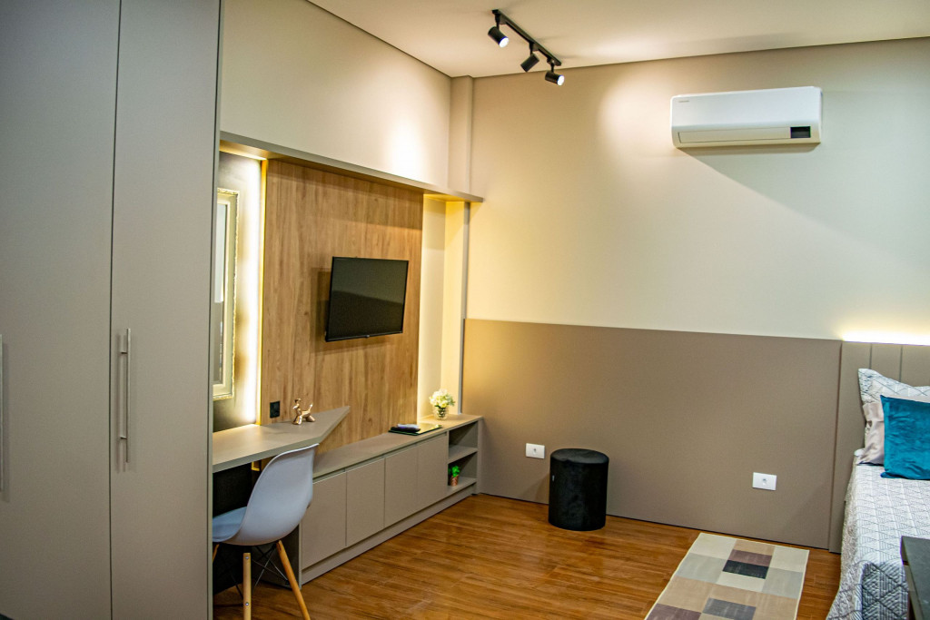 Seus apartamentos contam com cozinha equipada, Smart tv, cama confortável, ar-condicionado que refrigeram todo o espaço, central de trabalho/estudos, enxoval de cama e banho.