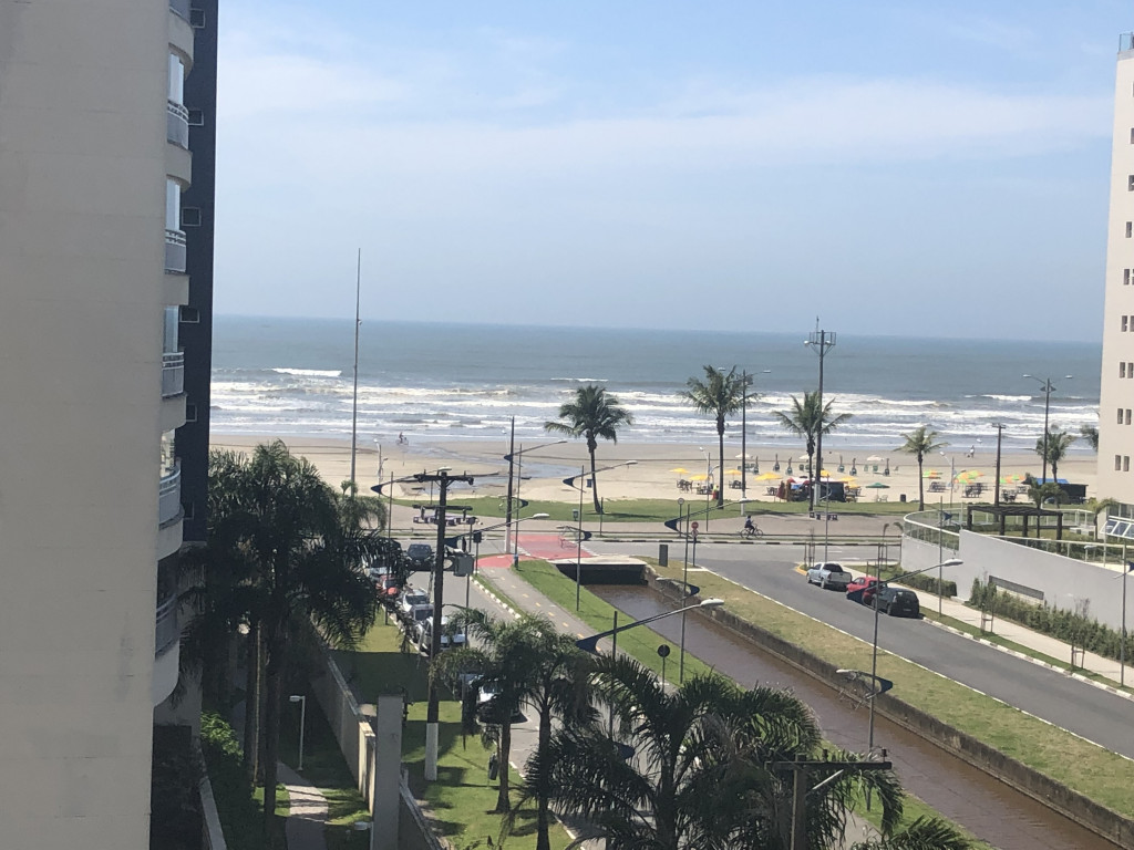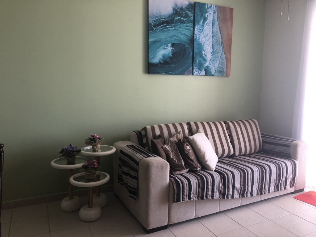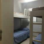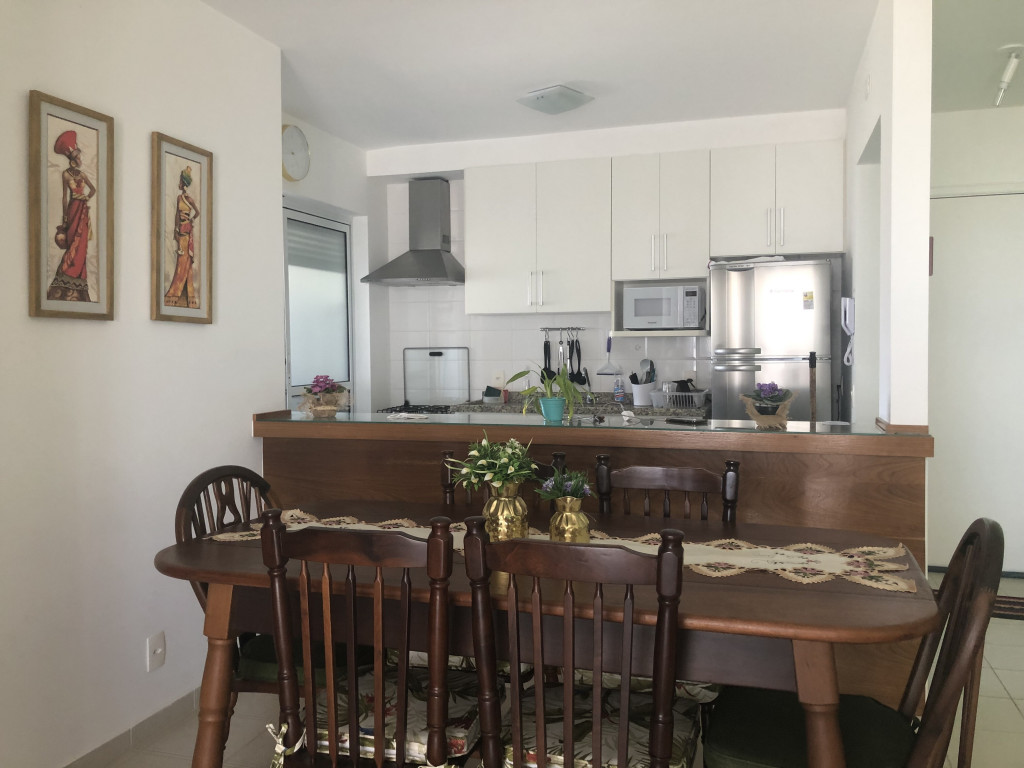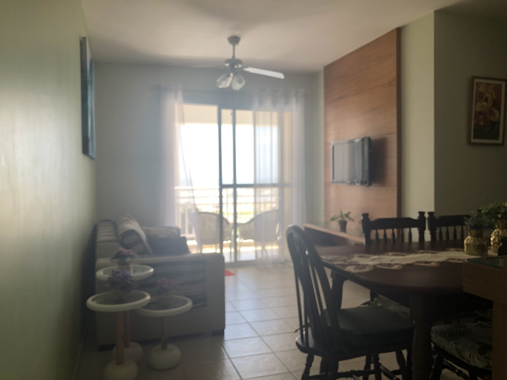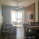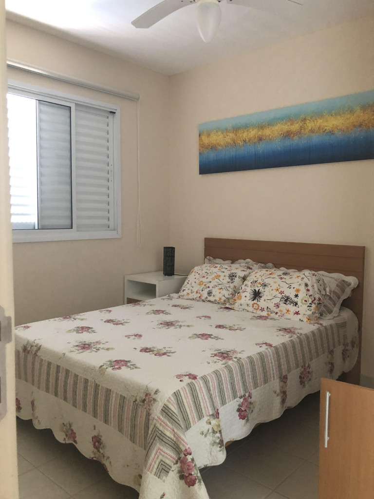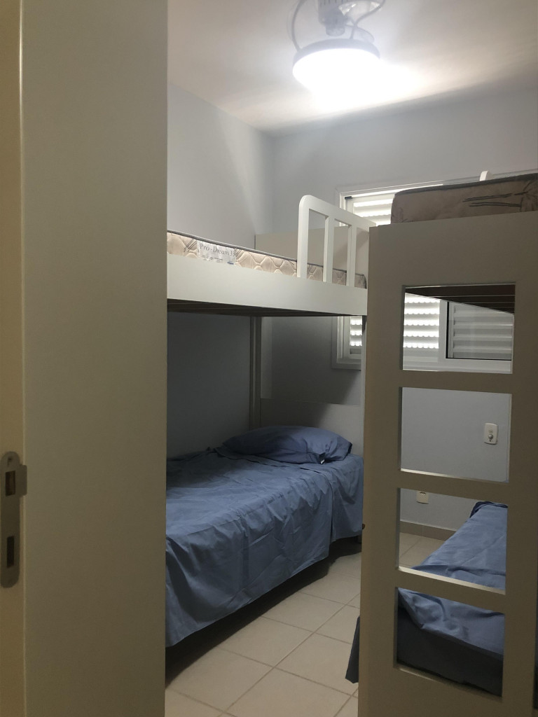 Meu apartamento tem uma suíte e mais um dormitório, um banheiro, sala integrada com a cozinha, área de serviço e varanda com churrasqueira. Tem ventilador de teto em todos os ambientes. Uma vaga de garagem coberta. Na suíte tem uma cama de casal e no outro quarto tem 2 beliches. Acomoda confortavelmente 6 pessoas. Fica a um quarteirão da praia e o condomínio disponibiliza serviço de praia. No condomínio há piscina, mas é preciso trazer atestado médico para usá-la.