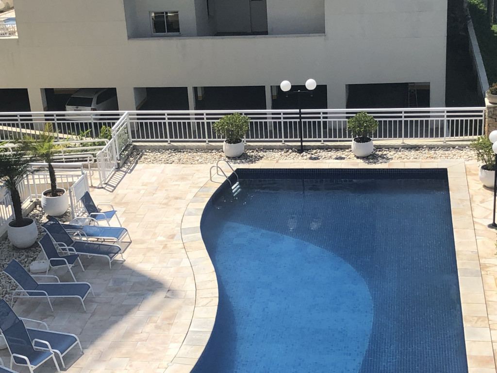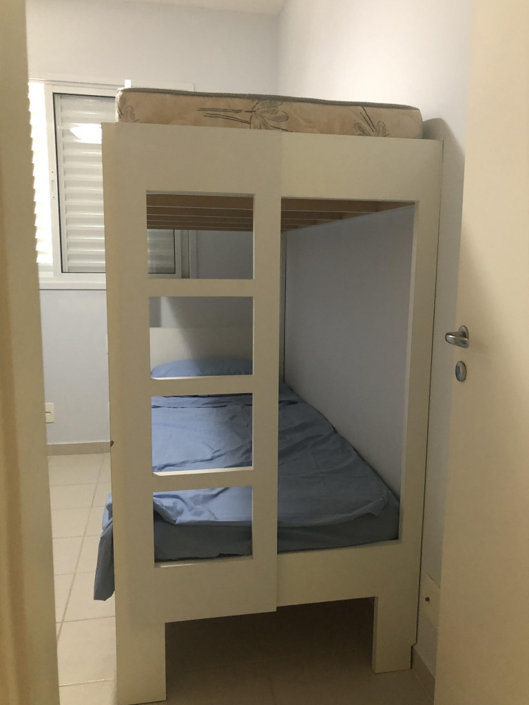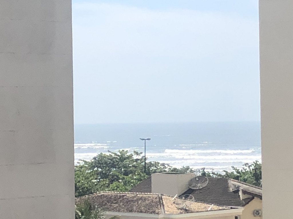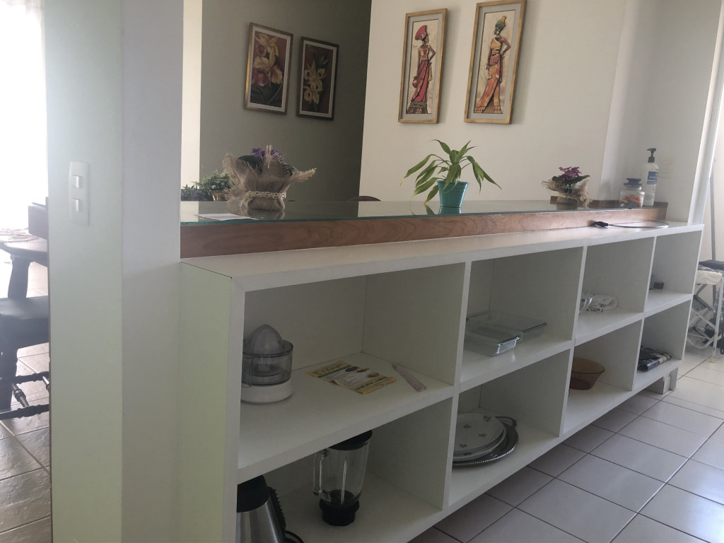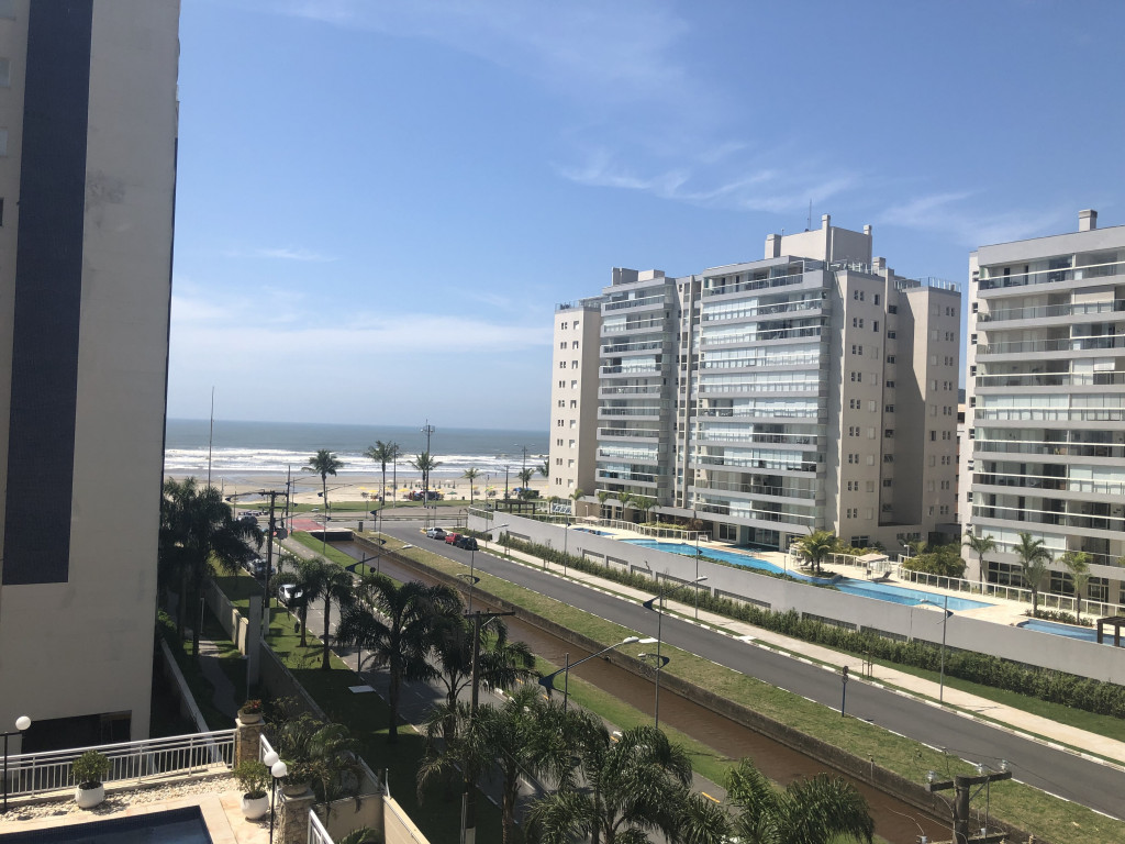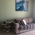 Meu apartamento tem uma suíte e mais um dormitório, um banheiro, sala integrada com a cozinha, área de serviço e varanda com churrasqueira. Tem ventilador de teto em todos os ambientes. Uma vaga de garagem coberta. Na suíte tem uma cama de casal e no outro quarto tem 2 beliches. Acomoda confortavelmente 6 pessoas. Fica a um quarteirão da praia e o condomínio disponibiliza serviço de praia. No condomínio há piscina, mas é preciso trazer atestado médico para usá-la.