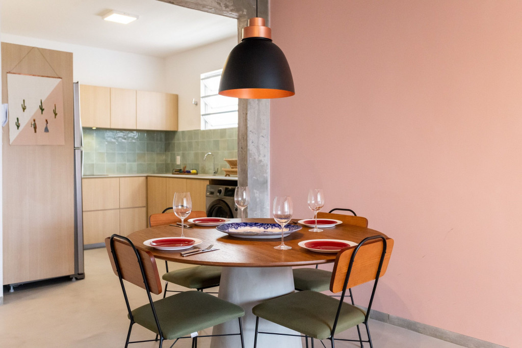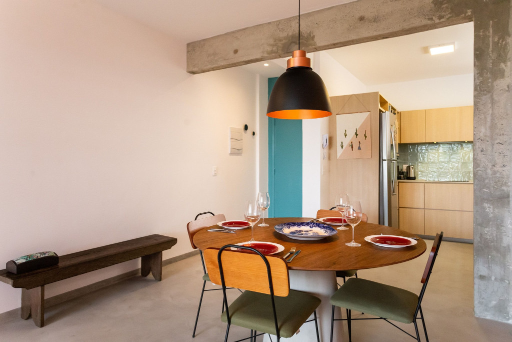 Logo ao entrar, temos um espaço em conceito aberto com cozinha com todos os utensílios necessários para uma estadia prática, incluindo forno, fogão, geladeira, microondas, liquidificador, cafeteira, chaleira e filtro d’água. Logo em frente fica a sala de jantar e a sala de Tv. Dispomos de um banheiro com chuveiro a gás.