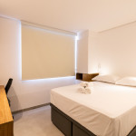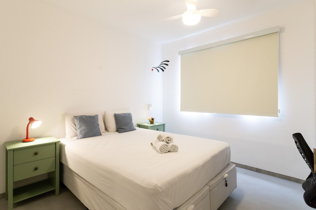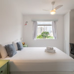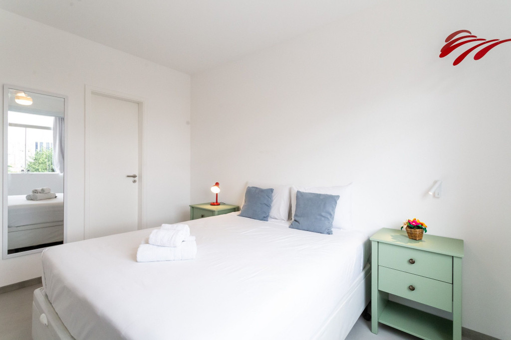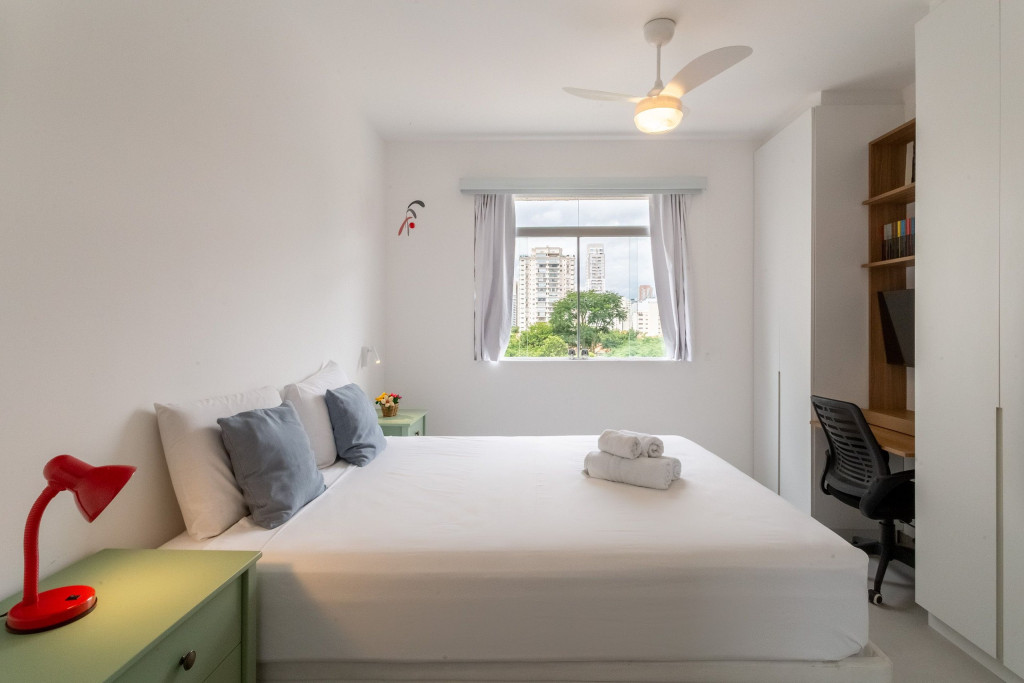 Nosso apartamento é amplo, bem decorado e aconchegante. Acomoda até 4 pessoas em 2 quartos, sendo uma suíte com cama queen e um quarto com cama de casal. Há também mesa com cadeira para fazer home office nos dois quartos. A suíte conta com ventilador de teto.