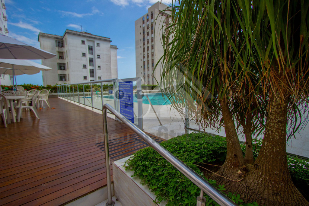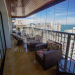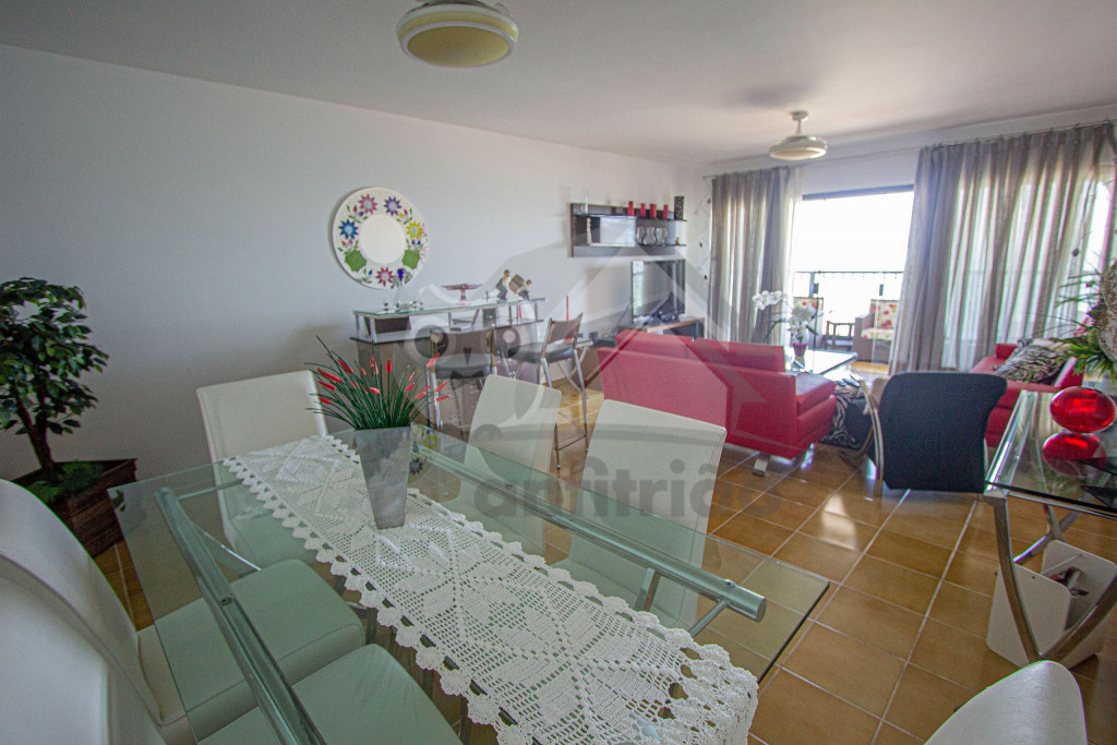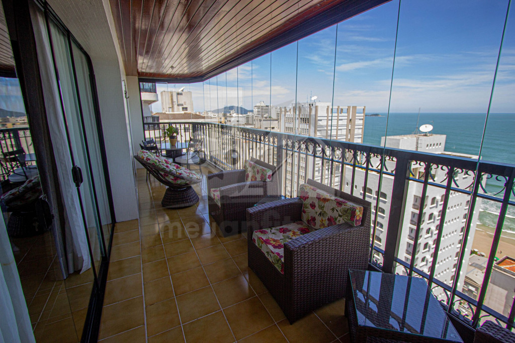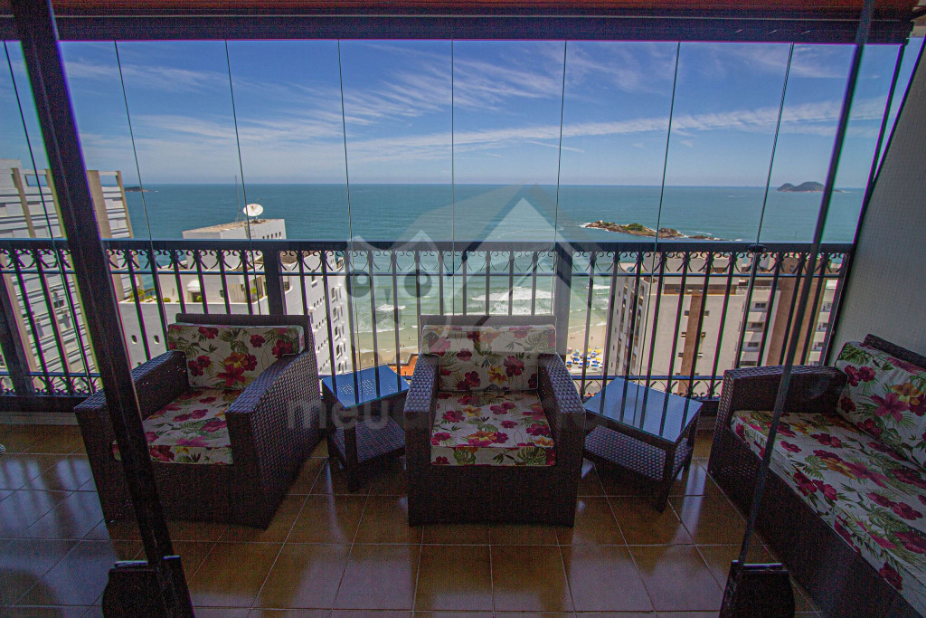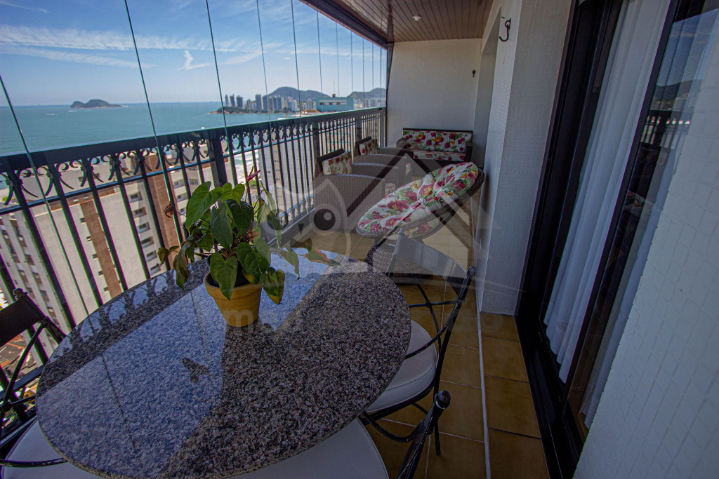 O apartamento conta com duas entradas (social e de serviço), sala de jantar e de TV com ventiladores, bar e uma varanda envidraçada com poltronas, mesas e sofás além de uma incrível vista do mar.