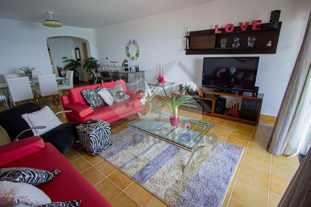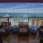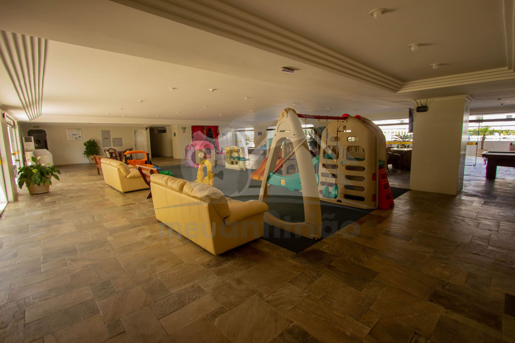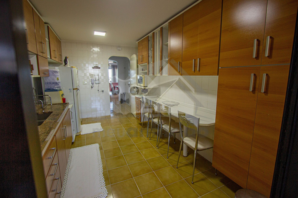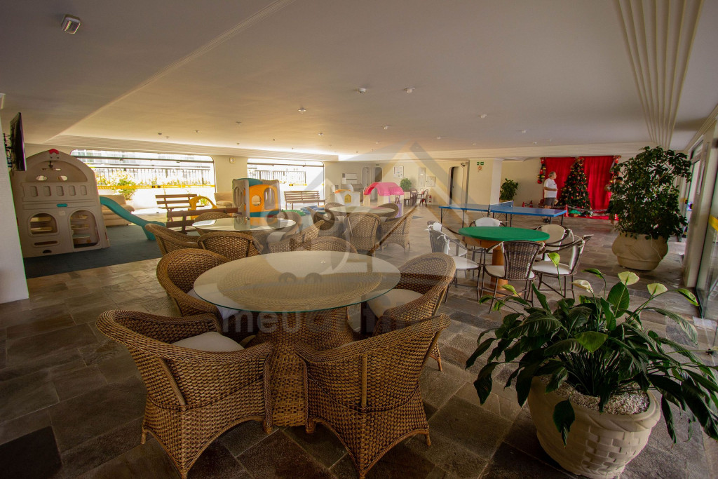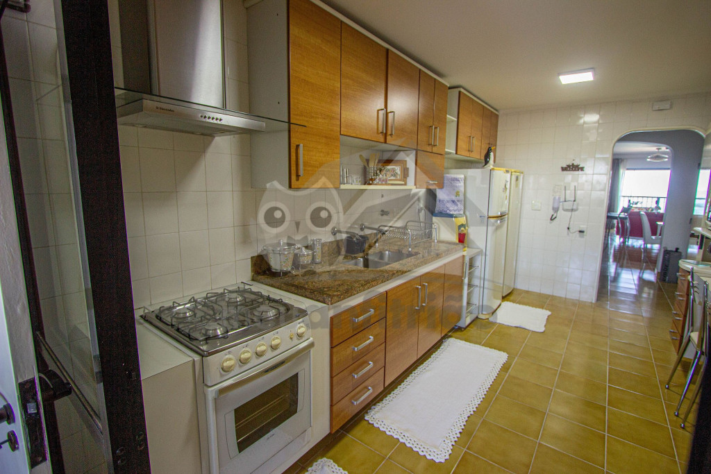O apartamento conta com duas entradas (social e de serviço), sala de jantar e de TV com ventiladores, bar e uma varanda envidraçada com poltronas, mesas e sofás além de uma incrível vista do mar.