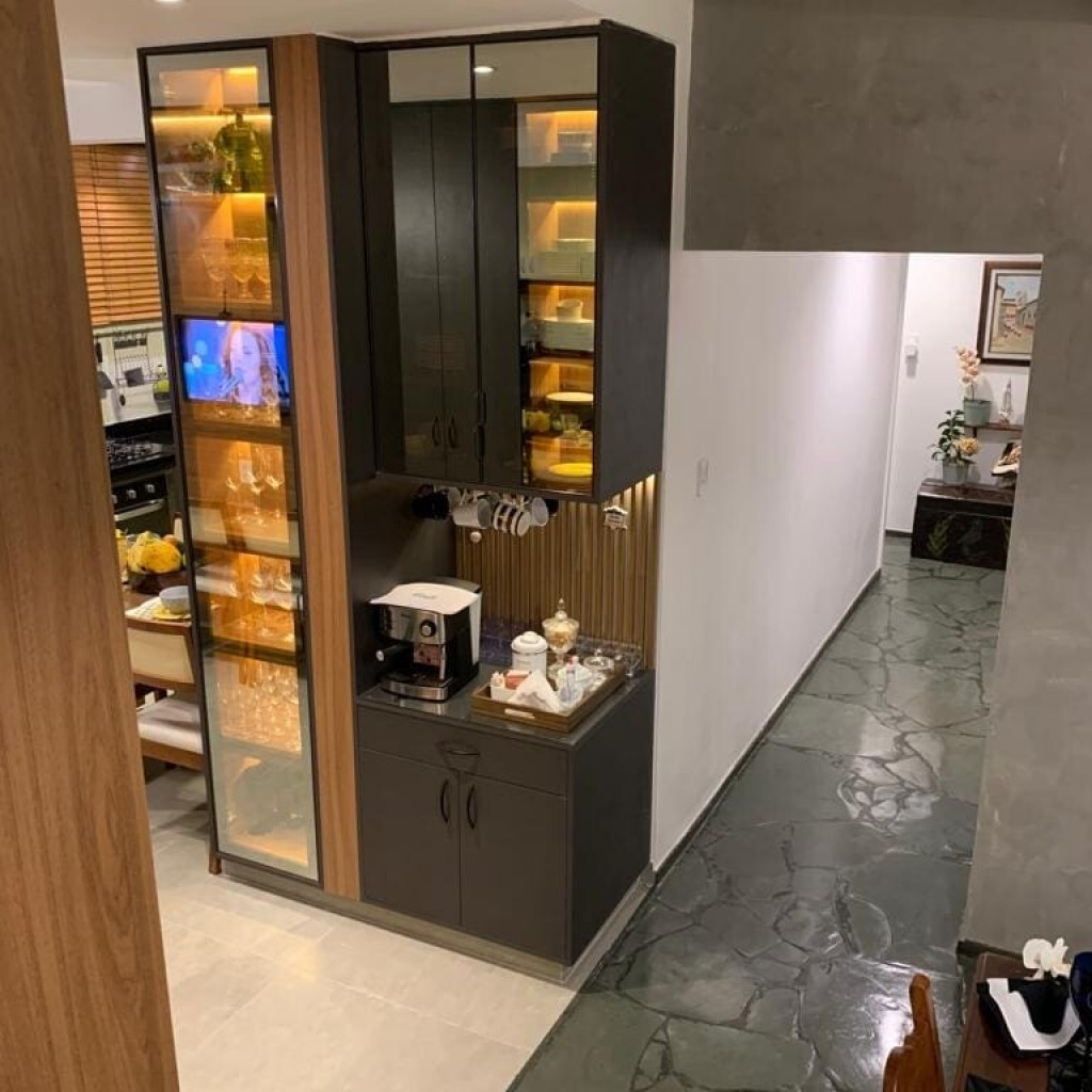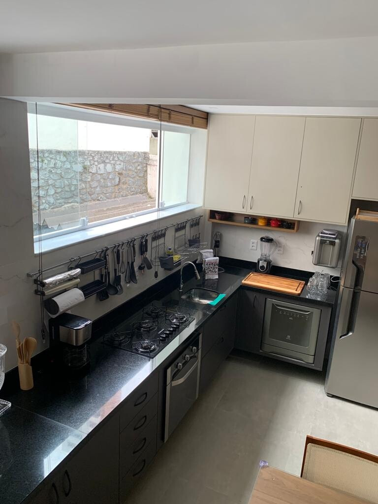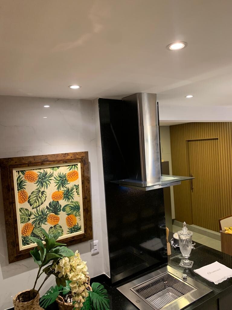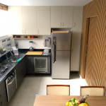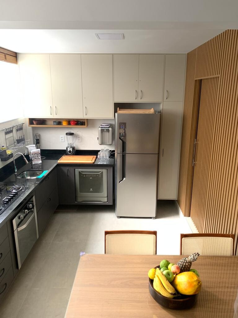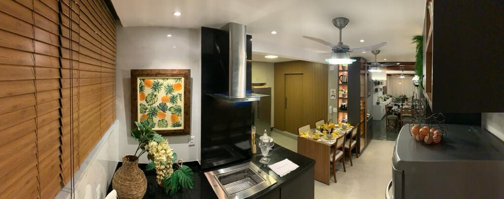 O apartamento foi reformado. A cozinha ficou integrada ao living, e hoje ela é digital. Panelas normais e digitais , com churrasqueira , muito bem aparelhada.