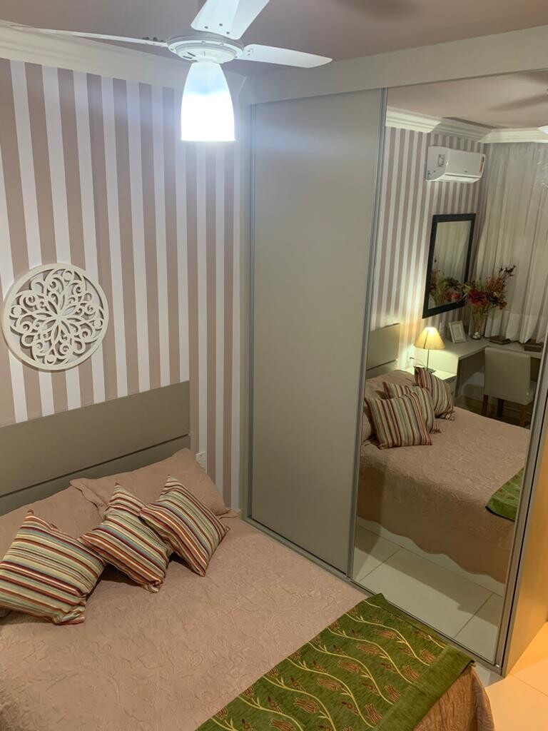 São 03 quartos , a suíte cama de casal queen, o primeiro quarto uma cama de casal e o terceiro quarto 02 camas de casal. . Ar condicionado split / ventilador de teto / Smart tv/ nos 03 quartos - internet em todo apto, 2 pontos de TV a Cabo (living e suite) / fibra ótica/ net flix . 02 ventiladores de teto no living e cozinha e smart tv na cozinha.