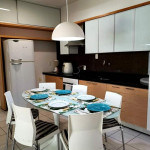 Cozinha completa com geladeira, fogão, forno, micro-ondas e utensílios domésticos