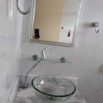 Banheiro com box de vidro e chuveiro.